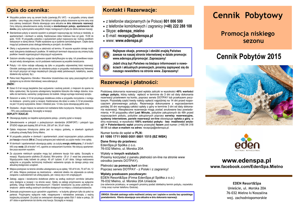 Opis do cennika: Wszystkie podane ceny są cenami brutto (zawierają 8% VAT) - w przypadku zmiany stawki podatku - ceny mogą ulec zmianie. Dla różnych rodzajów pobytu stosowane są inne ceny oraz inne zakresy świadczeń. Klienta obowiązuje cena aktualna w dniu dokonania rezerwacji. Ceny dotyczą zakwaterowania osoby dorosłej w standardowym pokoju, apartamencie lub domku, przy wykorzystaniu wszystkich miejsc noclegowych (chyba że oferta stanowi inaczej). Standardowe pobyty w sezonie wysokim w pokojach rozpoczynają się i kończą w niedzielę, w apartamentach i domkach w sobotę. Każdorazowo doba hotelowa trwa od godz. 15.00 do godz. 10.00. W przypadku pobytów z wyżywieniem pobyt rozpoczyna się i kończy posiłkiem wskazanym w danej ofercie. Posiłki wydawane są w systemie samoobsługowym. Ciepłe dania mogą być podawane przez obsługę kelnerską w porcjach, do stolików. Oferty z wyżywieniem różnią się w zależności od terminu. W sezonie wysokim istnieje możliwość dokupienia dodatkowych posiłków. W niektórych terminach dopuszcza się zmianę liczby posiłków i kwestii organizacyjnych dotyczących wyżywienia. Gościom ośrodka mogą być wydawane opaski identyfikacyjne na rękę. Ich prawidłowe noszenie jest wtedy obowiązkowe, na ich podstawie realizowane są wszelkie świadczenia. Pobyty i ich różne rodzaje odbywają się tylko w przypadku odpowiedniej ilości rezerwacji. Ośrodek zastrzega sobie prawo do odwołania pobytu w przypadku niedostatecznej frekwencji lub innych przyczyn od niego niezależnych (decyzje władz państwowych, kataklizmy, awarie, działanie siły wyższej. Itp.). Pełna treść Regulaminu Ośrodka i Warunków Uczestnictwa oraz opisy poszczególnych ofert dostępne są na stronie internetowej: www.edenspa.pl. ZNIŻKI : Dzieci 0-3 lat nocują bezpłatnie (bez wyżywienia i osobnej pościeli, z miejscem do spania na łóżku opiekunów). Na życzenie udostępniamy bezpłatnie łóżeczko dla małego dziecka, krzesełko do karmienia, wanienkę i podgrzewacz do butelek. Usługa wymaga rezerwacji sprzętu. Dzieciom w wieku 3-12 lat przysługuje dodatkowa zniżka w przypadku korzystania z noclegu na dostawce - prosimy pytać w recepcji. Każdorazowo dla dzieci w wieku 3-12 lat przewidziane jest 1/2 porcji wyżywienia. Dzieci i młodzież pow. 12 roku życia obowiązują pełne ceny. Dostawka - drugie miejsce na wersalce lub rozkładane łóżko turystyczne. Nocleg na dostawce - 75% ceny podstawowej. Szczegóły w recepcji. DOPŁATY I KAUCJE: Obowiązują dopłaty za niepełne wykorzystanie pokoju - prosimy pytać w recepcji. Zakwaterowanie w pokojach o podwyższonym standardzie (KOMFORT) i pokojach typu STUDIO objęte jest dopłatą 300 zł/14 dni, 200 zł/7 dni, 30 zł/1 doba. Opłata miejscowa klimatyczna płatna jest na miejscu gotówką, w stawkach zgodnych z aktualną uchwałą Rady Gminy Mielno. W przypadku pobytów w domkach i apartamentach, przed rozpoczęciem pobytu pobierana jest kaucja w kwocie 200 zł. Z kaucji potrącana jest należność za zużyte media i inne opłaty. W domkach i apartamentach obowiązują opłaty: za zużytą energię elektryczną (1 zł brutto/1 kW) oraz wodę (20 zł brutto/1 m³), zgodnie ze wskazaniami liczników. Nie dotyczy apartamentów poza sezonem wysokim. Za użyczenie niektórych sprzętów mogą być pobierane kaucje i/lub opłaty. Szczegóły w recepcji. Wypożyczenie szlafroka 25 zł/pobyt, Mini-pralnia - 20 zł (1 wsad bez prasowania). Wypożyczenie małej lodówki do pokoju: 40 zł/1 tydzień, 6 zł/1 doba. Usługa realizowana wyłącznie w przypadku technicznej możliwości wstawienia sprzętu do danego pokoju oraz aktualnej dostępności urządzeń. Miejsca postojowe na terenie ośrodka udostępniane są za opłatą: 100 zł/14 dni, 70 zł/7 dni, 12 zł/1 doba. Miejsca postojowe są niestrzeżone - właściciel obiektu nie odpowiada za szkody związane z uszkodzeniem lub utratą pojazdu, jak i rzeczy się w nim znajdujących. Zabiegi, zajęcia i świadczenia dodatkowe płatne są według osobnych cenników (aktualne ceny dostępne w recepcji i na stronie www). Opłaty za zabiegi przyjmowane są wyłącznie gotówką. Usługi Gabinetów Kosmetycznych i Kawiarni świadczone są przez podmioty zewnętrzne - płatne według osobnych cenników dostępnych na miejscu u świadczeniodawców. Zwierzęta przyjmowane są po uprzednim uzgodnieniu - w budynku głównym tylko do pokoi na parterze. Przyjmujemy wyłącznie małe, nieagresywne i niehałaśliwe zwierzęta, z ważną książeczką szczepień. Za pobyt ze zwierzęciem obowiązuje opłata 50zł /1 doba w pokoju, 30 zł/1 doba w apartamencie lub domku oraz kaucja. Szczegóły w recepcji. Kontakt i Rezerwacje: z telefonów stacjonarnych (w Polsce) 801 006 500 z telefonów komórkowych i zagranicy (+48) 222 288 108 Skype: edenspa_mielno E-mail: [email protected] www: www.edenspa.pl Najlepsze okazje, promocje i obniżki znajdą Państwo zawsze na naszej stronie internetowej w dziale promocje: www.edenspa.pl/promocje/. Zapraszamy! Cennik Pobytowy Promocja niskiego sezonu Cennik Pobytów 2015 Jeżeli chcą być Państwo na bieżąco informowani o nowościach i aktualnych promocjach, prosimy zapisywać się do naszego newslettera na stronie www. Zapraszamy! Rezerwacje i płatności: Podstawą dokonania rezerwacji jest wpłata zaliczki w wysokości 40% wartości całego pobytu, którą należy wpłacić w terminie do 3 dni od daty dokonania rezerwacji przelewem na konto, poprzez serwis DOTPAY lub przekazem pocztowym. Pozostałą część kwoty należy opłacić najpóźniej na 14 dni przed rozpoczęciem planowanego pobytu. Rezerwacje dokonywane z wyprzedzeniem poniżej 30 dni wymagają całości opłaty z góry w terminie 3 dni od daty dokonania rezerwacji. Nieopłacone rezerwacje mogą zostać anulowane bez powiadomienia. W przypadku ofert Last Minute, pobytów zakupionych do 48h przed rozpoczęciem pobytu, pobytów zakupionych poprzez serwisy rez