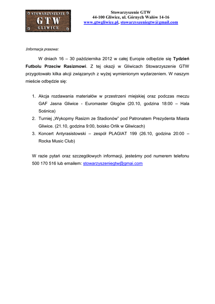 Stowarzyszenie GTW 44-100 Gliwice, ul. Górnych Wałów 14-16 www.gtwgliwice.pl, [email protected] Informacja prasowa: W dniach 16 – 30 października 2012 w całej Europie odbędzie się Tydzień Futbolu Przeciw Rasizmowi. Z tej okazji w Gliwicach Stowarzyszenie GTW przygotowało kilka akcji związanych z wyżej wymienionym wydarzeniem. W naszym mieście odbędzie się: 1. Akcja rozdawania materiałów w przestrzeni miejskiej oraz podczas meczu GAF Jasna Gliwice - Euromaster Głogów (20.10, godzina 18:00 – Hala Sośnica) 2. Turniej „Wykopmy Rasizm ze Stadionów” pod Patronatem Prezydenta Miasta Gliwice. (21.10, godzina 9:00, boisko Orlik w Gliwicach) 3. Koncert Antyrasistowski – zespół PLAGIAT 199 (26.10, godzina 20:00 – Rocka Music Club) W razie pytań oraz szczegółowych informacji, jesteśmy pod numerem telefonu 500 170 516 lub emailem: [email protected]