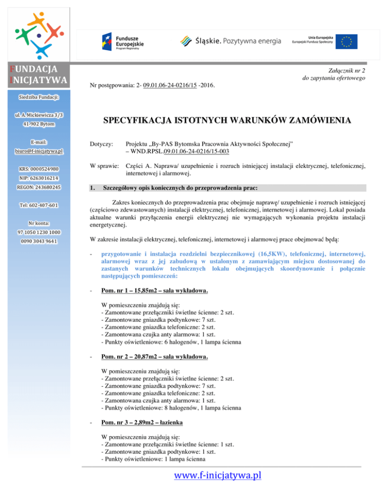 Załącznik nr 2 do zapytania ofertowego Nr postępowania: 2- 09.01.06-24-0216/15 -2016. SiedzibaFundacji: ul.A.Mickiewicza3/3 SPECYFIKACJA ISTOTNYCH WARUNKÓW ZAMÓWIENIA 41-902Bytom E-mail: Dotyczy: Projektu „By-PAS Bytomska Pracownia Aktywności Społecznej” – WND.RPSL.09.01.06-24-0216/15-003 W sprawie: Części A. Naprawa/ uzupełnienie i rozruch istniejącej instalacji elektrycznej, telefonicznej, internetowej i alarmowej. [email protected] KRS:0000524980 NIP:6263016214 REGON:243680245 1. Szczegółowy opis koniecznych do przeprowadzenia prac: Tel:602-407-601 Nrkonta: Zakres koniecznych do przeprowadzenia prac obejmuje naprawę/ uzupełnienie i rozruch istniejącej (częściowo zdewastowanych) instalacji elektrycznej, telefonicznej, internetowej i alarmowej. Lokal posiada aktualne warunki przyłączenia energii elektrycznej nie wymagających wykonania projektu instalacji energetycznej. 97105012301000 009030439641 W zakresie instalacji elektrycznej, telefonicznej, internetowej i alarmowej prace obejmować będą: - przygotowanie i instalacja rozdzielni bezpiecznikowej (16,5KW), telefonicznej, internetowej, alarmowej wraz z jej zabudową w ustalonym z zamawiającym miejscu dostosowanej do zastanych warunków technicznych lokalu obejmujących skoordynowanie i połącznie następujących pomieszczeń: - Pom. nr 1 – 15,85m2 – sala wykładowa. W pomieszczeniu znajdują się: - Zamontowane przełączniki świetlne ścienne: 2 szt. - Zamontowane gniazdka podtynkowe: 7 szt. - Zamontowane gniazdka telefoniczne: 2 szt. - Zamontowana czujka anty alarmowa: 1 szt. - Punkty oświetleniowe: 6 halogenów, 1 lampa ścienna - W pomieszczeniu znajdują się: - Zamontowane przełączniki świetlne ścienne: 2 szt. - Zamontowane gniazdka podtynkowe: 7 szt. - Zamontowane gniazdka telefoniczne: 2 szt. - Zamontowana czujka anty alarmowa: 1 szt. - Punkty oświetleniowe: 8 halogenów, 1 lampa ścienna Pom. nr 2 – 20,87m2 – sala wykładowa. - Pom. nr 3 – 2,89m2 – łazienka W pomieszczeniu znajdują się: - Zamontowane przełączniki świetlne ścienne: 1 szt. - Zamontowane gniazdka podtynkowe: 1 szt. - Punkty oświetleniowe: 1 lampa ścienna www.f-inicjatywa.pl SiedzibaFundacji: - Pom. nr 4 – 20,28m2 – komunikacja - Pom. nr 5 – 3,92m2 – łazienka W pomieszczeniu znajdują się: - Zamontowane przełączniki świetlne ścienne: 1 szt. - Zamontowane gniazdka podtynkowe: 1 szt. - Punkty oświetleniowe: 1 lampa ścienna ul.A.Mickiewicza3/3 41-902Bytom E-mail: - Pom. nr 6 – 2,82m2 – kotłownia/ magazynek [email protected] W pomieszczeniu znajdują się: - Zamontowane przełączniki świetlne ścienne: 1 szt. - Zamontowane gniazdka podtynkowe: 2 szt. - Punkty oświetleniowe: 4 halogeny, 1 lampa ścienna KRS:0000524980 NIP:6263016214 REGON:243680245 - Tel:602-407-601 W pomieszczeniu znajdują się: - Zamontowane przełączniki świetlne ścienne: 3 szt. - Zamontowane gniazdka podtynkowe: 2 szt. - Zamontowane gniazdka telefoniczne: 1 szt. - Punkty oświetleniowe: 8 halogenów, 1 lampa ścienna - Zamontowany naścienny włącznik alarmowy. Nrkonta: 97105012301000 009030439641 Pom. nr 7 – 12,11m2 – wiatrołap + recepcja - Pom. nr 8 – 13,31m2 – sala wykładowa W pomieszczeniu znajdują się: - Zamontowane przełączniki świetlne ścienne: 2 szt. - Zamontowane gniazdka podtynkowe: 3 szt. - Zamontowane gniazdka telefoniczne: 1 szt. - Zamontowana czujka anty alarmowa: 1 szt. - Punkty oświetleniowe: 5 halogenów, 1 lampa ścienna - Pom. nr 9 – 12,65m2 – pomieszczenie zajęciowe W pomieszczeniu znajdują się: - Zamontowane przełączniki świetlne ścienne: 2 szt. - Zamontowane gniazdka podtynkowe: 5 szt. - Zamontowane gniazdka telefoniczne: 2 szt. - Zamontowana czujka anty alarmowa: 1 szt. - Punkty oświetleniowe: 5 halogenów, 1 lampa ścienna - Pom. nr 10 – 5,6m2 – komunikacja - Pom. nr 11 – 8,9m2 – biuro W pomieszczeniu znajdują się: - Zamontowane przełączniki świetlne ścienne: 1 szt. - Zamontowane gniazdka podtynkowe: 5 szt. - Zamontowana czujka anty alarmowa: 1 szt. - Punkty oświetleniowe: 4 halogeny, 1 lampa ścienna www.f-inicjatywa.pl SiedzibaFundacji: - W pomieszczeniu znajdują się: - Zamontowane przełączniki świetlne ścienne: 1 szt. - Zamontowana czujka anty alarmowa: 1 szt - Punkty oświetleniowe: 1 lampa ścienna ul.A.Mickiewicza3/3 41-902Bytom E-mail: - Uzupełnienie okablowania sieci elektrycznej, telefonicznej, internetowej i alarmowej. Instalacje zostały uszkodzone poprzez odcięcie kabli pierwotnie prowadzonych na poziomie sufitów podwieszanych. Obecny stan okablowania wymaga uzupełnień w miejscach odciętych/ przeciętych. - Uzupełnienie brakującego oświetlenia poprzez zakup i montaż nowych halogenów typu LED o jasności światła min. 300 lx z oprawą – kolor ciepły oraz lamp oświetleniowych bocznych z żarówkami energooszczędnymi w ilości dostosowanej do wyżej wskazanych halogenowych punktów oświetleniowych oraz punktów lamp bocznych. - Połączenie instalacji alarmowej z naściennym włącznikiem alarmowym, dialerem, zewnętrzną syreną oraz zakup i montaż centrali alarmowej z uzupełnieniem 1 czujki alarmowej w pomieszczeniu recepcji. - Wypełnienie niezbędnej dokumentacji formalnej o stanie technicznym instalacji w tym zgłoszenie gotowości instalacji do przyłączenia celem umożliwienia spisania umowy na dostarczenie energii elektrycznej do przedmiotowego lokalu użytkowego. [email protected] KRS:0000524980 NIP:6263016214 REGON:243680245 Tel:602-407-601 Nrkonta: 97105012301000 009030439641 Pom. nr 12 – 3,10 – magazyn/archiwum Przed określeniem ceny wykonania usługi potencjalny wykonawca zobowiązany jest dokonać oględzin w tym szczegółowych pomiarów dotyczących niniejszej specyfikacji. www.f-inicjatywa.pl
