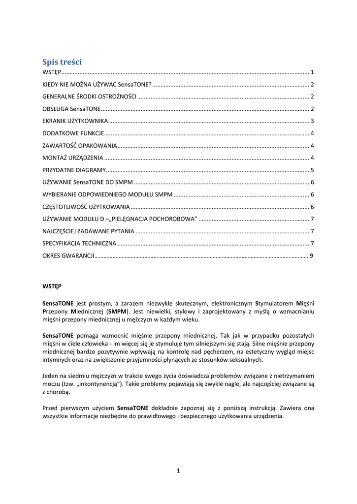 Spis treści WSTĘP...................................................................................................................................................... 1 KIEDY NIE MOŻNA UŻYWAC SensaTONE? ............................................................................................... 2 GENERALNE ŚRODKI OSTROŻNOŚCI ........................................................................................................ 2 OBSŁUGA SensaTONE .............................................................................................................................. 2 EKRANIK UŻYTKOWNIKA ......................................................................................................................... 3 DODATKOWE FUNKCJE............................................................................................................................ 4 ZAWARTOŚĆ OPAKOWANIA .................................................................................................................... 4 MONTAŻ URZĄDZENIA ............................................................................................................................ 4 PRZYDATNE DIAGRAMY........................................................................................................................... 5 UŻYWANIE SensaTONE DO SMPM .......................................................................................................... 6 WYBIERANIE ODPOWIEDNIEGO MODUŁU SMPM .................................................................................. 6 CZĘSTOTLIWOŚĆ UŻYTKOWANIA ............................................................................................................ 6 UŻYWANIE MODUŁU D –„PIELĘGNACJA POCHOROBOWA” ................................................................... 7 NAJCZĘŚCIEJ ZADAWANE PYTANIA ......................................................................................................... 7 SPECYFIKACJA TECHNICZNA .................................................................................................................... 7 OKRES GWARANCJI…………………………………………………………………………………………………………………………… 9 WSTĘP SensaTONE jest prostym, a zarazem niezwykle skutecznym, elektronicznym Stymulatorem Mięśni Przepony Miednicznej (SMPM). Jest niewielki, stylowy i zaprojektowany z myślą o wzmacnianiu mięśni przepony miednicznej u mężczyzn w każdym wieku. SensaTONE pomaga wzmocnić mięśnie przepony miednicznej. Tak jak w przypadku pozostałych mięśni w ciele człowieka - im więcej się je stymuluje tym silniejszymi się stają. Silne mięśnie przepony miednicznej bardzo pozytywnie wpływają na kontrolę nad pęcherzem, na estetyczny wygląd miejsc intymnych oraz na zwiększenie przyjemności płynących ze stosunków seksualnych. Jeden na siedmiu mężczyzn w trakcie swego życia doświadcza problemów związane z nietrzymaniem moczu (tzw. „inkontynencją”). Takie problemy pojawiają się zwykle nagle, ale najczęściej związane są z chorobą. Przed pierwszym użyciem SensaTONE dokładnie zapoznaj się z poniższą instrukcją. Zawiera ona wszystkie informacje niezbędne do prawidłowego i bezpiecznego użytkowania urządzenia. 1 KIEDY NIE MOŻNA UŻYWAC SensaTONE? 1. Nie używaj SensaTONE gdy masz rozrusznik serca. 2. Jeżeli cierpisz na epilepsje, choroby serca, masz metalowe implanty lub cierpisz na ból niewiadomego pochodzenia - skonsultuj się z lekarzem o możliwość stosowania urządzenia. 3. Nie używaj jeśli masz infekcje odbytu lub zakażenie układu moczowego. 4. Nie używaj do uśmierzania bólu niewiadomego pochodzenia, który może wymagać nagłego leczenia. GENERALNE ŚRODKI OSTROŻNOŚCI 1. 2. 3. 4. 5. 6. 7. 8. 9. 10. 11. 12. Nie używać urządzenia bez zapoznania się z instrukcją Obsługi. Nie zanurzać SensaTONE w wodzie lub innym płynie. Nie kłaść urządzenia blisko źródeł ciepła. Nie używać urządzenia w obecności gazów łatwopalnych. Nie upuszczać urządzenia na twardą powierzchnię. Nie otwierać obudowy urządzenia. Używać wyłącznie zgodnych z instrukcją baterii oraz elektrod. W przypadku uszkodzenia, nie używać. Wyciągać baterie kiedy urządzenie jest nieużywane. Nie używać urządzenia w czasie jazdy lub obsługi potencjalnie niebezpiecznych urządzeń. Trzymać z dala od dzieci. Nie umieszczać doodbytniczej sondy na, bądź w pobliżu oczu, w ustach, z przodu czy po bokach szyi, wokół głowy, serca ani na skórze zranionej, przeciętej, w stanie zapalnym itp. 13. Nie używać w przypadku gruźlicy, raków złośliwych, bardzo niskiego bądź bardzo wysokiego ciśnienia krwi, epilepsji ani chorób zapalnych (chyba że pod nadzorem medycznym). OBSŁUGA SensaTONE TESTOWANIE URZĄDZENIA SensaTONE posiada blokadę przed zniszczeniem – nie włącza się na całą moc jeśli sonda nie jest odpowiednio zaaplikowana. Jeśli chcesz sprawdzić działanie urządzenia przed zaaplikowaniem, możesz to zrobić w prosty sposób: Podłącz do urządzenia kabel oraz sondę, właściwie umieść baterie potrzebne do zasilania SensaTONE. Lekko zwilż dłoń wodą, obejmij sondę palcami i mocno zaciśnij. Tak ułożona dłoń imituje odpowiednie zaaplikowanie sondy wewnątrz ciała. Włącz urządzenie, powoli zwiększaj moc w dowolnym trybie pracy. Jeśli czujesz impulsy elektryczne przepływające przez dłoń a urządzenie pracuje na jednym z wyższych stopni mocy to znaczy, że Twoje urządzenie działa jak należy. 2 Sonda doodbytnicza 1. Włącznik / wyłącznik – włącza i wyłącza urządzenie SensaTONE. 2. Wyświetlacz – wskazuje aktualnie używany moduł oraz intensywność impulsów (więcej informacji na diagramie poniżej). 3. Przycisk zmiany modułu pracy – do wyboru program A, B, C lub D. 4. Przyciski zmiany intensywności impulsów – do zwiększania i zmniejszania intensywn