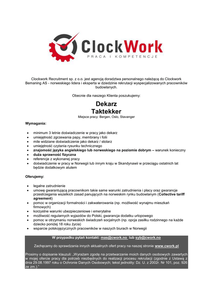 Clockwork Recruitment sp. z o.o. jest agencją doradztwa personalnego należącą do Clockwork Bemaning AS - norweskiego lidera i eksperta w dziedzinie rekrutacji wyspecjalizowanych pracowników budowlanych. Obecnie dla naszego Klienta poszukujemy: Dekarz Taktekker Miejsce pracy: Bergen, Oslo, Stavanger Wymagania: minimum 3 letnie doświadczenie w pracy jako dekarz umiejętność zgrzewania papy, membrany i folii mile widziane doświadczenie jako dekarz / stolarz umiejętność czytania rysunku technicznego znajomość języka angielskiego lub norweskiego na poziomie dobrym – warunek konieczny duża sprawność fizyczna referencje z wykonanej pracy doświadczenie w pracy w Norwegii lub innym kraju w Skandynawii w przeciągu ostatnich lat będzie dodatkowym atutem Oferujemy: legalne zatrudnienie umowę gwarantującą pracownikom takie same warunki zatrudnienia i płacy oraz gwarancje przestrzegania wszelkich zasad panujących na norweskim rynku budowlanym (Collective tariff agreement) pomoc w organizacji formalności i zakwaterowania (np. możliwość wynajmu mieszkań firmowych) korzystne warunki ubezpieczeniowe i emerytalne możliwość regularnych wyjazdów do Polski, gwarancja dodatku urlopowego pomoc w otrzymaniu norweskich świadczeń socjalnych (np. opcja zasiłku rodzinnego na każde dziecko poniżej 18 roku życia) wsparcie polskojęzycznych pracowników w naszych biurach w Norwegii W przypadku pytań kontakt: [email protected] lub [email protected] Zachęcamy do sprawdzania innych aktualnych ofert pracy na naszej stronie www.cwork.pl Prosimy o dopisanie klauzuli: „Wyrażam zgodę na przetwarzanie moich danych osobowych zawartych w mojej ofercie pracy dla potrzeb niezbędnych do realizacji procesu rekrutacji (zgodnie z Ustawą z dnia 29.08.1997 roku o Ochronie Danych Osobowych; tekst jednolity: Dz. U. z 2002r. Nr 101, poz. 926 ze zm.).”