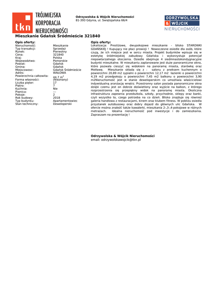 Odrzywolska & Wójcik Nieruchomości 81-393 Gdynia, ul. Świętojańska 66/4 Mieszkanie Gdańsk Śródmieście 321840 Opis oferty: Nieruchomość: Typ transakcji: Rynek: Cena: Kraj: Wojewodztwo: Powiat: Gmina: Miejscowosc: Adres: Powierzchnia całkowita: Forma własności: Liczba pięter: Piętro: Kuchnia: Piwnica: Pokoje: Rok budowy: Typ budynku: Stan techniczny: Opis oferty: Mieszkanie Sprzedaż Pierwotny 321840 Polska Pomorskie Gdańsk Gdańsk Gdańsk Śródmieście WAŁOWA 44.7 m2 (Nieznany) 17 7 Nie --2 2018 Apartamentowiec Deweloperski Lokalizacja: Prestiżowe, dwupokojowe mieszkanie - blisko STAROWKI GDAŃSKIEJ ! Kupujący nie płaci prowizji ! Nowoczesne osiedle dla osób, które czują, że ich miejsce jest w sercu miasta. Projekt budynków wpisuje się w estetykę śródmiejskiej zabudowy Gdańska i wykorzystuje potencjał niepowtarzalnego otoczenia. Osiedle obejmuje 4 siedmnastokondygnacyjne budynki mieszkalne. W mieszkaniu zaplanowane jest duże panoramiczne okno, które pozwala cieszyć się widokiem na panoramę miasta, starówkę oraz Motławę. Mieszkanie składa się z : salonu z aneksem kuchennym o powierzchni 20,89 m2 sypialni o powierzchni 12,17 m2 łazienki o powierzchni 4,19 m2 przedpokoju o powierzchni 7,45 m2 balkonu o powierzchni 3,90 m2Nieruchomość jest w stanie deweloperskim co umożliwia właścicielowi indywidualną aranżację wnętrz. Przestronny salon posiada panoramiczne okna dzięki czemu jest on dobrze doświetlony oraz wyjście na balkon, z którego rozprzestrzenia się przepiękny widok na panoramę miasta. Okoliczna infrastruktura zapewnia przedszkola, szkoły, przychodnie, sklepy oraz banki, czyli wszystko to, czego potrzeba na co dzień. Blisko znajduje się również galeria handlowa z restauracjami, kinem oraz klubem fitness. W pobliżu osiedla przystanek autobusowy oraz dobry dojazd do głównych ulic Gdańska. W ofercie można znaleźć także kawalerki, mieszkania 2-,3-,4-pokojowe w różnych metrażach. Idealna nieruchomość pod inwestycje i do zamieszkania. Zapraszam na prezentację ! Odrzywolska & Wójcik Nieruchomości email: [email protected]