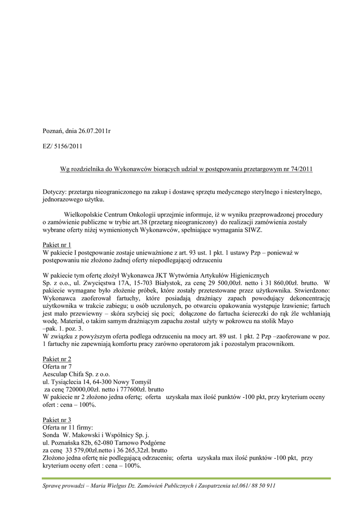 Poznań, dnia 26.07.2011r EZ/ 5156/2011 Wg rozdzielnika do Wykonawców biorących udział w postępowaniu przetargowym nr 74/2011 Dotyczy: przetargu nieograniczonego na zakup i dostawę sprzętu medycznego sterylnego i niesterylnego, jednorazowego użytku.. Wielkopolskie Centrum Onkologii uprzejmie informuje, iż w wyniku przeprowadzonej procedury o zamówienie publiczne w trybie art.38 (przetarg nieograniczony) do realizacji zamówienia zostały wybrane oferty niżej wymienionych Wykonawców, spełniające wymagania SIWZ. Pakiet nr 1 W pakiecie I postępowanie zostaje unieważnione z art. 93 ust. 1 pkt. 1 ustawy Pzp – ponieważ w postępowaniu nie złożono żadnej oferty niepodlegającej odrzuceniu W pakiecie tym ofertę złożył Wykonawca JKT Wytwórnia Artykułów Higienicznych Sp. z o.o., ul. Zwycięstwa 17A, 15-703 Białystok, za cenę 29 500,00zł. netto i 31 860,00zł. brutto. W pakiecie wymagane było złożenie próbek, które zostały przetestowane przez użytkownika. Stwierdzono: Wykonawca zaoferował fartuchy, które posiadają drażniący zapach powodujący dekoncentrację użytkownika w trakcie zabiegu; u osób uczulonych, po otwarciu opakowania występuje łzawienie; fartuch jest mało przewiewny – skóra szybciej się poci; dołączone do fartucha ściereczki do rąk źle wchłaniają wodę. Materiał, o takim samym drażniącym zapachu został użyty w pokrowcu na stolik Mayo –pak. 1. poz. 3. W związku z powyższym oferta podlega odrzuceniu na mocy art. 89 ust. 1 pkt. 2 Pzp –zaoferowane w poz. 1 fartuchy nie zapewniają komfortu pracy zarówno operatorom jak i pozostałym pracownikom. Pakiet nr 2 Oferta nr 7 Aesculap Chifa Sp. z o.o. ul. Tysiąclecia 14, 64-300 Nowy Tomyśl za cenę 720000,00zł. netto i 777600zł. brutto W pakiecie nr 2 złożono jedna ofertę; oferta uzyskała max ilość punktów -100 pkt, przy kryterium oceny ofert : cena – 100%. Pakiet nr 3 Oferta nr 11 firmy: Sonda W. Makowski i Wspólnicy Sp. j. ul. Poznańska 82b, 62-080 Tarnowo Podgórne za cenę 33 579,00zł.netto i 36 265,32zł. brutto Złożono jedna ofertę nie podlegającą odrzuceniu; oferta uzyskała max ilość punktów -100 pkt, przy kryterium oceny ofert : cena – 100%. Sprawę prowadzi – Maria Wielgus Dz. Zamówień Publicznych i Zaopatrzenia tel.061/ 88 50 911 Pakiet nr 4 Oferta nr 12 firmy: Paul Hartmann Polska Sp. z o.o. ul. Partyzancka 133/151, 95-200 Pabianice za cenę 11 960,00zl. netto i 12 916, 80zł. brutto Złożono jedna ofertę nie podlegającą odrzuceniu; oferta uzyskała max ilość punktów -100 pkt, przy kryterium oceny ofert : cena – 100%. Pakiet nr 5 Oferta nr 7 Aesculap Chifa Sp. z o.o. ul. Tysiąclecia 14, 64-300 Nowy Tomyśl za cenę 5 959,20zł. netto i 6 435,94zł. brutto Wybrano ofertę najkorzystniejszą cenowo; oferta uzyskała max ilość punktów -100 pkt, przy kryterium oceny ofert : cena – 100%. W pakiecie nr 5 oferty złożyli niżej wymienieni Wykonawcy: Numer Nazwa i adres Wykonawcy Cena oferty Oferty netto (bez VAT) brutto (z VAT) 7 8 Aesculap Chifa Sp. z o.o. ul. Tysiąclecia 14, 64-300 Nowy Tomyśl Pakiet 5 5 959,20zł. netto 6 435,94zł. brutto Covidien Polska Sp. z o.o. Al. Jerozolimskie 162, 02-342 Warszawa Pakiet 5 6 098,40zł. netto 6 586,27zł. brutto Ilość uzyskanych punktów przy kryterium oceny ofert : cena 100% 100 pkt. 97,72 pkt. Pakiet nr 6 Oferta nr 8 firmy: Covidien Polska Sp. z o.o. Al. Jerozolimskie 162, 02-342 Warszawa za cenę 18 200,00zł. netto i 19 656zł. brutto Złożono jedna ofertę nie podlegającą odrzuceniu; oferta uzyskała max ilość punktów -100 pkt, przy kryterium oceny ofert : cena – 100%. Pakiet nr 7 Oferta nr 14 firmy: Sonda W. Makowski i Wspólnicy Sp. j ul. Poznańska 82b, 62-080 Tarnowo Podgórne za cenę 53 592,00zl. netto i 57 880,23zł. brutto Wybrano ofertę najkorzystniejszą cenowo; oferta uzyskała max ilość punktów -100 pkt, przy kryterium oceny ofert : cena – 100%. W pakiecie nr 6 oferty złożyli niżej wymienieni Wykonawcy: Numer Nazwa i adres Wykonawcy Cena oferty Oferty netto (bez VAT) brutto (z VAT) 10 Centrowet-Cezal Sp. z o.o. ul. Dąbrowskiego 133/135 60-543 Poznań Pakiet VII 29 595,00zł. netto 31 962,60zł. brutto Ilość uzyskanych punktów przy kryterium oceny ofert : cena 100% Oferta wykluczona – art. 22 ust. 2 pkt. 2 i odrzucona – art. 89 ust. 1 pkt. 5 Sprawę prowadzi – Maria Wielgus Dz. Zamówień Publicznych i Zaopatrzenia tel.061/ 88 50 911 11 Sonda W. Makowski i Wspólnicy Sp. j ul. Poznańska 82b, 62-080 Tarnowo Podgórne Pakiet VII 53 592,00zl. netto 57 880,23zł. brutto 100 pkt. Wykonawca Centrowet – Cezal podlega wykluczeniu na mocy art. 24 ust. 2 pkt. 2 ustawy Pzp i w związku z tym, oferta Wykonawcy wykluczonego podlega odrzuceniu na mocy art. 89 ust. 1 pkt. 5 - ponieważ w postępowaniu zostało złożone wadium niezgodnie z wartością określona w siwz dla pakietu 7. Pakiet nr 8 Oferta nr 8 firmy: Covidien Polska Sp. z o.o. Al. Jerozolimskie 162, 02-342 Warszawa za cenę 1 802 656,00zł. netto i 1 946 868,48zł. brutto Złożono jedna ofertę nie podlegającą odrzuceniu; oferta uzyskała max ilość punktów -100 pkt, przy kryterium oceny ofert : cena – 100%. Pakiet nr 9 Oferta nr 1 firmy: EKOMED Sp. z o.o. ul. Łotweska 17/01, 03-918 Warszawa za cenę 37 800, 00zł. netto i 40 824,00zł. brutto Wpłynęła jedna oferta niepodlegająca odrzuceniu; oferta uzyskała max ilość punktów -100 pkt, przy kryterium oceny ofert : cena – 100%. Pakiet nr 10 Oferta nr 9 AKME Sp. z o.o. Sp. k ul. Postępu, 02-676 Warszawa za cenę 30 270,00zl. netto i 32 691,60zł. brutto Wpłynęła jedna oferta niepodlegająca odrzuceniu; oferta uzyskała max ilość punktów -100 pkt, przy kryterium oceny ofert : cena – 100%. Pakiet nr 11 Oferta nr 14 Skamex Sp. z o.o. Sp. K ul. Częstochowska 38/52, 93-121 Łódź za cenę 264 340,00 zł. netto i 285 487,20 zł. brutto Wpłynęła jedna oferta niepodlegająca odrzuceniu; oferta uzyskała max ilość p
