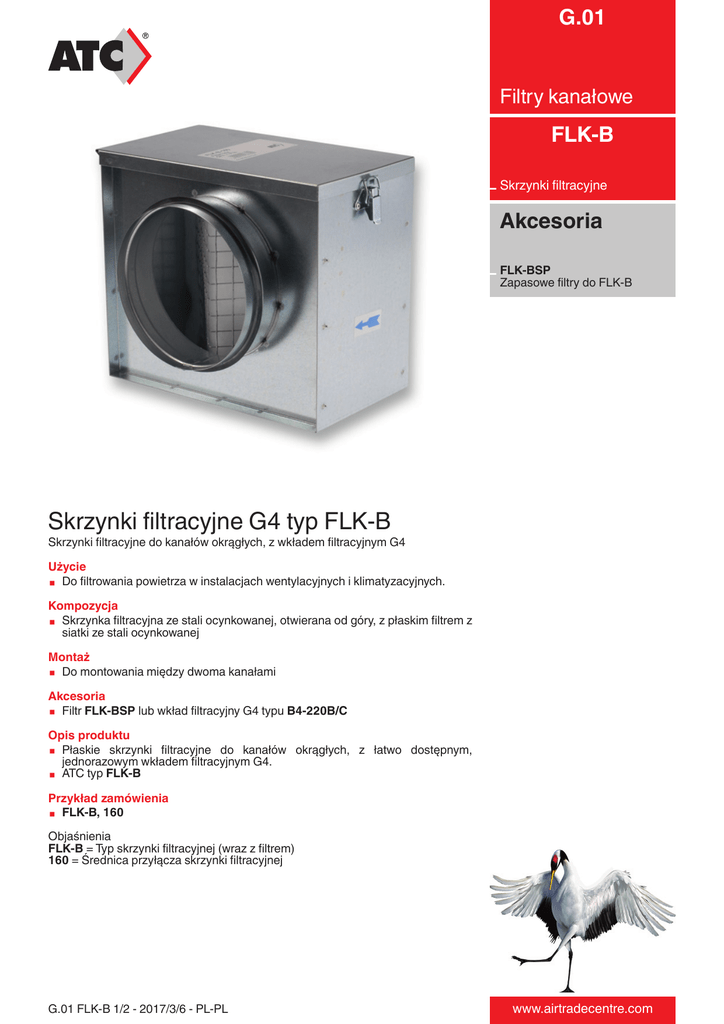 G.01 Filtry kanałowe FLK-B Skrzynki filtracyjne Akcesoria FLK-BSP Zapasowe filtry do FLK-B Skrzynki filtracyjne G4 typ FLK-B Skrzynki filtracyjne do kanałów okrągłych, z wkładem filtracyjnym G4 Użycie ¾ Do filtrowania powietrza w instalacjach wentylacyjnych i klimatyzacyjnych. Kompozycja ¾ Skrzynka filtracyjna ze stali ocynkowanej, otwierana od góry, z płaskim filtrem z siatki ze stali ocynkowanej Montaż ¾ Do montowania między dwoma kanałami Akcesoria ¾ Filtr FLK-BSP lub wkład filtracyjny G4 typu B4-220B/C Opis produktu ¾ Płaskie skrzynki filtracyjne do kanałów okrągłych, z łatwo dostępnym, jednorazowym wkładem filtracyjnym G4. ¾ ATC typ FLK-B Przykład zamówienia ¾ FLK-B, 160 Objaśnienia FLK-B = Typ skrzynki filtracyjnej (wraz z filtrem) 160 = Średnica przyłącza skrzynki filtracyjnej G.01 FLK-B 1/2 - 2017/3/6 - PL-PL www.airtradecentre.com G.01 Filtry kanałowe 0 00 Ø3 Ø4 140 55 15 Ø3 160 Ø25 Ø100 Ø125 Ø150,160 200 Ps [Pa] 180 Ø200 Wykres strat ciśnienia 120 100 80 60 40 20 0 500 1000 1500 2000 Q [m³/h] 2500 3000 3500 4000 B ØD 0 C E A Wymiary FLK-B 100 125 160 200 250 315 355 400 A [mm] 205 215 265 315 365 425 515 515 G.01 FLK-B 2/2 - 2017/3/6 - PL-PL B [mm] 170 205 235 275 325 390 495 495 C [mm] 120 140 155 180 230 330 455 455 ØD [mm] 100 125 160 200 250 315 355 400 E [mm] 277 252 267 302 352 452 587 587 www.airtradecentre.com