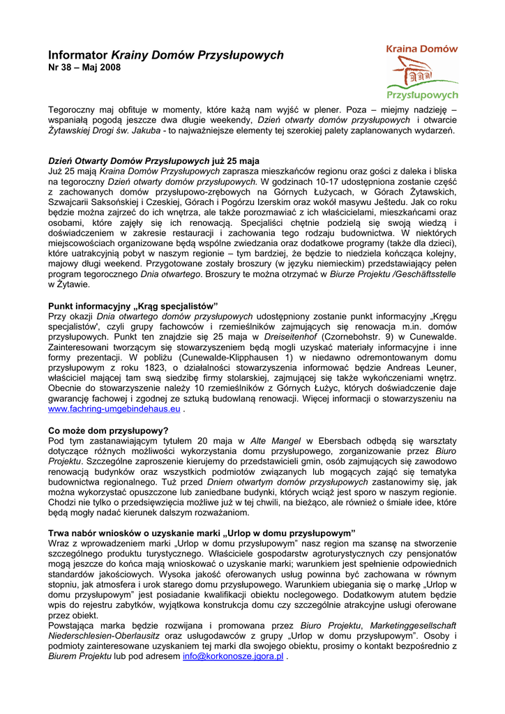Informator Krainy Domów Przysłupowych Nr 38 – Maj 2008 Tegoroczny maj obfituje w momenty, które każą nam wyjść w plener. Poza – miejmy nadzieję – wspaniałą pogodą jeszcze dwa długie weekendy, Dzień otwarty domów przysłupowych i otwarcie Żytawskiej Drogi św. Jakuba - to najważniejsze elementy tej szerokiej palety zaplanowanych wydarzeń. Dzień Otwarty Domów Przysłupowych już 25 maja Już 25 mają Kraina Domów Przysłupowych zaprasza mieszkańców regionu oraz gości z daleka i bliska na tegoroczny Dzień otwarty domów przysłupowych. W godzinach 10-17 udostępniona zostanie część z zachowanych domów przysłupowo-zrębowych na Górnych Łużycach, w Górach Żytawskich, Szwajcarii Saksońskiej i Czeskiej, Górach i Pogórzu Izerskim oraz wokół masywu Ještedu. Jak co roku będzie można zajrzeć do ich wnętrza, ale także porozmawiać z ich właścicielami, mieszkańcami oraz osobami, które zajęły się ich renowacją. Specjaliści chętnie podzielą się swoją wiedzą i doświadczeniem w zakresie restauracji i zachowania tego rodzaju budownictwa. W niektórych miejscowościach organizowane będą wspólne zwiedzania oraz dodatkowe programy (także dla dzieci), które uatrakcyjnią pobyt w naszym regionie – tym bardziej, że będzie to niedziela kończąca kolejny, majowy długi weekend. Przygotowane zostały broszury (w języku niemieckim) przedstawiający pełen program tegorocznego Dnia otwartego. Broszury te można otrzymać w Biurze Projektu /Geschäftsstelle w Żytawie. Punkt informacyjny „Krąg specjalistów” Przy okazji Dnia otwartego domów przysłupowych udostępniony zostanie punkt informacyjny „Kręgu specjalistów', czyli grupy fachowców i rzemieślników zajmujących się renowacja m.in. domów przysłupowych. Punkt ten znajdzie się 25 maja w Dreiseitenhof (Czornebohstr. 9) w Cunewalde. Zainteresowani tworzącym się stowarzyszeniem będą mogli uzyskać materiały informacyjne i inne formy prezentacji. W pobliżu (Cunewalde-Klipphausen 1) w niedawno odremontowanym domu przysłupowym z roku 1823, o działalności stowarzyszenia informować będzie Andreas Leuner, właściciel mającej tam swą siedzibę firmy stolarskiej, zajmującej się także wykończeniami wnętrz. Obecnie do stowarzyszenie należy 10 rzemieślników z Górnych Łużyc, których doświadczenie daje gwarancję fachowej i zgodnej ze sztuką budowlaną renowacji. Więcej informacji o stowarzyszeniu na www.fachring-umgebindehaus.eu . Co może dom przysłupowy? Pod tym zastanawiającym tytułem 20 maja w Alte Mangel w Ebersbach odbędą się warsztaty dotyczące różnych możliwości wykorzystania domu przysłupowego, zorganizowanie przez Biuro Projektu. Szczególne zaproszenie kierujemy do przedstawicieli gmin, osób zajmujących się zawodowo renowacją budynków oraz wszystkich podmiotów związanych lub mogących zająć się tematyka budownictwa regionalnego. Tuż przed Dniem otwartym domów przysłupowych zastanowimy się, jak można wykorzystać opuszczone lub zaniedbane budynki, których wciąż jest sporo w naszym regionie. Chodzi nie tylko o przedsięwzięcia możliwe już w tej chwili, na bieżąco, ale również o śmiałe idee, które będą mogły nadać kierunek dalszym rozważaniom. Trwa nabór wniosków o uzyskanie marki „Urlop w domu przysłupowym” Wraz z wprowadzeniem marki „Urlop w domu przysłupowym” nasz region ma szansę na stworzenie szczególnego produktu turystycznego. Właściciele gospodarstw agroturystycznych czy pensjonatów mogą jeszcze do końca mają wnioskować o uzyskanie marki; warunkiem jest spełnienie odpowiednich standardów jakościowych. Wysoka jakość oferowanych usług powinna być zachowana w równym stopniu, jak atmosfera i urok starego domu przysłupowego. Warunkiem ubiegania się o markę „Urlop w domu przysłupowym” jest posiadanie kwalifikacji obiektu noclegowego. Dodatkowym atutem będzie wpis do rejestru zabytków, wyjątkowa konstrukcja domu czy szczególnie atrakcyjne usługi oferowane przez obiekt. Powstająca marka będzie rozwijana i promowana przez Biuro Projektu, Marketinggesellschaft Niederschlesien-Oberlausitz oraz usługodawców z grupy „Urlop w domu przysłupowym”. Osoby i podmioty zainteresowane uzyskaniem tej marki dla swojego obiektu, prosimy o kontakt bezpośrednio z Biurem Projektu lub pod adresem [email protected] . Drogą św. Jakuba ze Zgorzelca do Pragi Tradycje pątnicze przeżywają w Europie swój renesans. Do grobu św. Jakuba w Santiago de Compostela (Hiszpania) znów wędrują tysiące ludzi. I choć różne są motywy tego pielgrzymowania, cel pozostaje jeden, wspólny. Kolejny odcinek tego międzynarodowego szlaku, Żytawska Droga św. Jakuba, zostanie otwarta 16 maja przy kościele szpitalnym św. Jakuba (Friedensstrasse) w Zittau. Liczący prawie 200 km długości szlak wypełni lukę między odcinkami w Polsce (Gniezno-Zgorzelec i Brzeg-Zgorzelec) a trasą prowadzącą ze stolicy Czech do Bawarii. Po ekumenicznym nabożeństwie (godz. 13:00) zaplanowane jest wspólne przejście ok. 3 kilometrów do przejścia granicznego w Hradku n. Nisou, gdzie oczekiwać będzie drobny poczęstunek. Na godzinę 17:00 zaplanowane jest zwiedzanie Żytawskich Szat Postnych (kościół św. Krzyża, godz. 17:00) oraz wieczorne modlitwy w duchu Taizé (kościół św. Jakuba, godz. 21:00). Na uroczyste otwarcie Drogi Żytawskiej zaprasza „Międzynarodowe Stowarzyszenie na Rzecz Drogi św. Jakuba Gniezno-Zgorzelec-Praga”. Od mają dostępne są nowe broszury na temat domów przysłupowych Wraz z wiosną pojawiły się nowe, długo oczekiwane materiały reklamowe i informacyjne dotyczące domów przysłupowych oraz naszego regionu. Trzy pierwsze to foldery Warto zajrzeć, Warto zobaczyć oraz Warto zamieszkać w polskiej wersji językowej. Mają one przede wszystkim zachęcić do zainteresowania się architekturą regionalną Górnych Łużyc przez osoby, które jeszcze nie mia