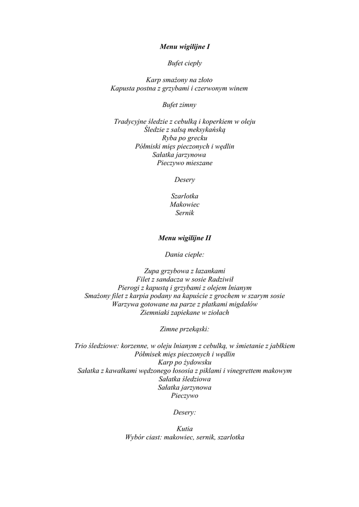 Menu wigilijne I Bufet ciepły Karp smażony na złoto Kapusta postna z grzybami i czerwonym winem Bufet zimny Tradycyjne śledzie z cebulką i koperkiem w oleju Śledzie z salsą meksykańską Ryba po grecku Półmiski mięs pieczonych i wędlin Sałatka jarzynowa Pieczywo mieszane Desery Szarlotka Makowiec Sernik Menu wigilijne II Dania ciepłe: Zupa grzybowa z łazankami Filet z sandacza w sosie Radziwił Pierogi z kapustą i grzybami z olejem lnianym Smażony filet z karpia podany na kapuście z grochem w szarym sosie Warzywa gotowane na parze z płatkami migdałów Ziemniaki zapiekane w ziołach Zimne przekąski: Trio śledziowe: korzenne, w oleju lnianym z cebulką, w śmietanie z jabłkiem Półmisek mięs pieczonych i wędlin Karp po żydowsku Sałatka z kawałkami wędzonego łososia z piklami i vinegrettem makowym Sałatka śledziowa Sałatka jarzynowa Pieczywo Desery: Kutia Wybór ciast: makowiec, sernik, szarlotka Menu wigilijne III Bufet ciepły Zupa grzybowa z łazankami Karp w sosie winnym z rodzynkami i szalotkami Festiwal pierogów Bigos wigilijny z grzybami i śliwką kalifornijską Ziemniaczki pieczone Ryż z warzywami Warzywa gotowane na parze Bufet zimny Matiasy z marynowaną gruszką i goździkami Śledzie pod kołderką z buraczków, jajka i sera gouda Karp po żydowsku Terina z sandacza z koperkiem i bakaliami w galarecie Jajka faszerowane grzybami Jajka z majonezem i szczypiorkiem Płatki z piersi kurczęcia z sezamem i selerem naciowym Półmiski mięs pieczonych i wędlin Sałatka z makaronem penne, salami, suszonymi pomidorami oraz rukolą Sałatka śledziowa z ziemniaczkami, buraczkami, porem oraz jabłkami Bułeczki bankietowe Masło Desery Sernik z brzoskwinią Makowiec z bakaliami Piernik korzenny Ciasto drożdżowe z rodzynkami Kutia