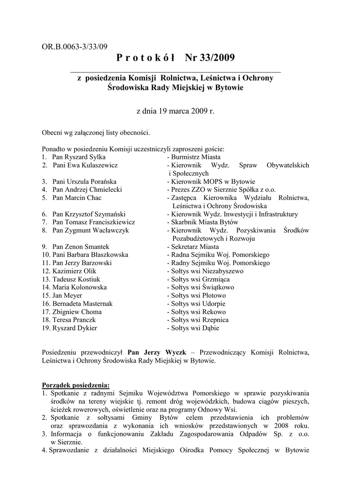 OR.B.0063-3/33/09 P r o t o k ó ł Nr 33/2009 ___________________________________________________ z posiedzenia Komisji Rolnictwa, Leśnictwa i Ochrony Środowiska Rady Miejskiej w Bytowie z dnia 19 marca 2009 r. Obecni wg załączonej listy obecności. Ponadto w posiedzeniu Komisji uczestniczyli zaproszeni goście: 1. Pan Ryszard Sylka - Burmistrz Miasta 2. Pani Ewa Kulaszewicz - Kierownik Wydz. Spraw Obywatelskich i Społecznych 3. Pani Urszula Porańska - Kierownik MOPS w Bytowie 4. Pan Andrzej Chmielecki - Prezes ZZO w Sierznie Spółka z o.o. 5. Pan Marcin Chac - Zastępca Kierownika Wydziału Rolnictwa, Leśnictwa i Ochrony Środowiska 6. Pan Krzysztof Szymański - Kierownik Wydz. Inwestycji i Infrastruktury 7. Pan Tomasz Franciszkiewicz - Skarbnik Miasta Bytów 8. Pan Zygmunt Wacławczyk - Kierownik Wydz. Pozyskiwania Środków PozabudŜetowych i Rozwoju 9. Pan Zenon Smantek - Sekretarz Miasta 10. Pani Barbara Błaszkowska - Radna Sejmiku Woj. Pomorskiego 11. Pan Jerzy Barzowski - Radny Sejmiku Woj. Pomorskiego 12. Kazimierz Olik - Sołtys wsi Niezabyszewo 13. Tadeusz Kostiuk - Sołtys wsi Grzmiąca 14. Maria Kolonowska - Sołtys wsi Świątkowo 15. Jan Meyer - Sołtys wsi Płotowo 16. Bernadeta Masternak - Sołtys wsi Udorpie 17. Zbigniew Choma - Sołtys wsi Rekowo 18. Teresa Pranczk - Sołtys wsi Rzepnica 19. Ryszard Dykier - Sołtys wsi Dąbie Posiedzeniu przewodniczył Pan Jerzy Wyczk – Przewodniczący Komisji Rolnictwa, Leśnictwa i Ochrony Środowiska Rady Miejskiej w Bytowie. Porządek posiedzenia: 1. Spotkanie z radnymi Sejmiku Województwa Pomorskiego w sprawie pozyskiwania środków na tereny wiejskie tj. remont dróg wojewódzkich, budowa ciągów pieszych, ścieŜek rowerowych, oświetlenie oraz na programy Odnowy Wsi. 2. Spotkanie z sołtysami Gminy Bytów celem przedstawienia ich problemów oraz sprawozdania z wykonania ich wniosków przedstawionych w 2008 roku. 3. Informacja o funkcjonowaniu Zakładu Zagospodarowania Odpadów Sp. z o.o. w Sierznie. 4. Sprawozdanie z działalności Miejskiego Ośrodka Pomocy Społecznej w Bytowie za rok 2008. 5. Informacja za 2008 rok w sprawie oceny wdraŜania poszczególnych celów i kierunków działań określonych w „Strategii integracji i rozwiązywania problemów społecznych Gminy Bytów na lata 2005-2010”. 6. Informacja z realizacji Gminnego Programu Profilaktyki i Rozwiązywania Problemów Alkoholowych i Przeciwdziałania Narkomanii za 2008 rok. 7. Raport z realizacji Gminnego Systemu Przeciwdziałania Przemocy w Rodzinie w 2008 r. 8. Zaopiniowanie projektów uchwał na sesję Rady Miejskiej w Bytowie w sprawie: utworzenia obwodu głosowania w szpitalu dla przeprowadzenia wyborów do Parlamentu Europejskiego, zarządzonych na dzień 7 czerwca 2009 r., ustalenia dodatkowych nazw miejscowości w Gminie Bytów w języku kaszubskim, w sprawie złoŜenia wniosku o wpisanie Gminy Bytów do Rejestru gmin, na obszarze, których uŜywane są nazwy w języku mniejszości, zaopiniowania projektu uchwały Rady Powiatu Bytowskiego w sprawie likwidacji Szpitala Powiatu Bytowskiego w Bytowie, rozpatrzenia skargi na działalność Burmistrza Miasta Bytów, zatwierdzenia „Planu odnowy miejscowości Udorpie”, zmiany budŜetu Gminy Bytów na 2009 r. 9. Sprawy bieŜące. Ad.1. _________________ Posiedzenie Komisji otworzył Przewodniczący Komisji Pan Jerzy Wyczk witając zaproszonych gości oraz członków Komisji. Następnie przedstawił porządek posiedzenia, który został przyjęty jednogłośnie. Pierwszym punktem posiedzenia Komisji było spotkanie z radnymi Sejmiku Województwa Pomorskiego w sprawie pozyskiwania środków na tereny wiejskie, tj. remont dróg wojewódzkich, budowa ciągów pieszych, ścieŜek rowerowych, oświetlenie oraz omówienie programów odnowy wsi. Jako pierwsza głos zabrała radna Sejmiku Województwa Pomorskiego Pani Barbara Błaszkowska. Omówiła stan nawierzchni dróg wiejskich oraz przedstawiła plany co do remontów dróg i budowy nowych ciągów pieszych i rowerowych. Zwróciła uwagę obecnym sołtysom na to, iŜ nie ma zarejestrowanych na ziemi bytowskiej ani jednego produktu regionalnego, w przeciwieństwie do innych gmin na terenie całego województwa pomorskiego. Ponadto Pani Barbara Błaszkowska zachęcała do organizowania jak najczęściej zebrań wiejskich, w celu utworzenia mocnego lobbingu. Przewodniczący Jerzy Wyczk zapytał radną Sejmiku, dlaczego Gmina ponosi koszty oświetlenia dróg i skrzyŜowań przy drogach wojewódzkich. Na to pytanie Przewodniczący nie otrzymał wyczerpującej odpowiedzi. Jako kolejny zabrał głos Pan Jerzy Barzowski - radny Sejmiku Województwa Pomorskiego. Podziękował Przewodniczącemu Komisji za zaproszenie i podkreślił, iŜ kontakt radnych Sejmiku z Gminą Bytów odbywa się jedynie za pośrednictwem Komisji Rolnictwa, 2 Leśnictwa i Ochrony Środowiska. Omówił w formie uzupełnienia temat dróg i remontów ich nawierzchni. Poinformował, Ŝe na wykonanie nowych nawierzchni na terenie naszego powiatu w roku 2009 jest przeznaczona kwota ponad 1 mln zł. Sołtys miejscowości Rekowo Pan Zbigniew Choma zadał pytanie radnemu Sejmiku, jak daleko posunęła się sprawa remontu drogi nr 212. Radny udzielając odpowiedzi poinformował, iŜ w Rekowie remontowany będzie odcinek drogi od kilometra 53 do 55. Pani Barbara Błaszkowska zachęciła sołtysów do zakładania kawiarenek internetowych w kaŜdej wsi. Poinformowała, Ŝe kładzie się na to duŜy nacisk oraz moŜna pozyskać na ten cel duŜe środki unijne. Poinformowała równieŜ sołtysów o tym, iŜ specjalnie przeszkolone przez Unię Europejską komisje, będą kontrolować gospodarstwa rolne pod kontem: jak składowane są nawozy, środki ochrony roślin, gdzie się składuje maszyny rolnicze i w jakim stanie się znajdują, czy maszyny rolnicze nie mają przecieków, itp. Za uchybienia w ww. sprawach będą nakładane bardzo duŜe kary grzywny. Następnie zabrał głos Burmistrz Miasta