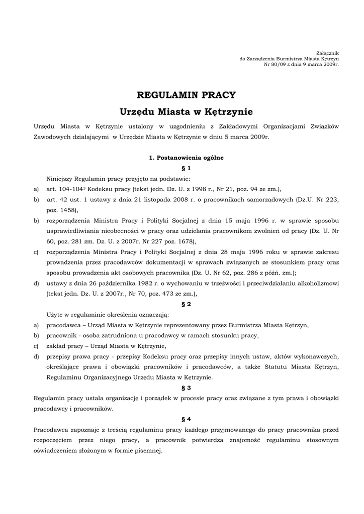 Załącznik do Zarządzenia Burmistrza Miasta Kętrzyn Nr 80/09 z dnia 9 marca 2009r. REGULAMIN PRACY Urzędu Miasta w Kętrzynie Urzędu Miasta w Kętrzynie ustalony w uzgodnieniu z Zakładowymi Organizacjami Związków Zawodowych działającymi w Urzędzie Miasta w Kętrzynie w dniu 5 marca 2009r. 1. Postanowienia ogólne §1 Niniejszy Regulamin pracy przyjęto na podstawie: a) art. 104-1043 Kodeksu pracy (tekst jedn. Dz. U. z 1998 r., Nr 21, poz. 94 ze zm.), b) art. 42 ust. 1 ustawy z dnia 21 listopada 2008 r. o pracownikach samorządowych (Dz.U. Nr 223, poz. 1458), b) rozporządzenia Ministra Pracy i Polityki Socjalnej z dnia 15 maja 1996 r. w sprawie sposobu usprawiedliwiania nieobecności w pracy oraz udzielania pracownikom zwolnień od pracy (Dz. U. Nr 60, poz. 281 zm. Dz. U. z 2007r. Nr 227 poz. 1678), c) rozporządzenia Ministra Pracy i Polityki Socjalnej z dnia 28 maja 1996 roku w sprawie zakresu prowadzenia przez pracodawców dokumentacji w sprawach związanych ze stosunkiem pracy oraz sposobu prowadzenia akt osobowych pracownika (Dz. U. Nr 62, poz. 286 z późń. zm.); d) ustawy z dnia 26 października 1982 r. o wychowaniu w trzeźwości i przeciwdziałaniu alkoholizmowi (tekst jedn. Dz. U. z 2007r., Nr 70, poz. 473 ze zm.), §2 UŜyte w regulaminie określenia oznaczają: a) pracodawca – Urząd Miasta w Kętrzynie reprezentowany przez Burmistrza Miasta Kętrzyn, b) pracownik - osoba zatrudniona u pracodawcy w ramach stosunku pracy, c) zakład pracy – Urząd Miasta w Kętrzynie, d) przepisy prawa pracy - przepisy Kodeksu pracy oraz przepisy innych ustaw, aktów wykonawczych, określające prawa i obowiązki pracowników i pracodawców, a takŜe Statutu Miasta Kętrzyn, Regulaminu Organizacyjnego Urzędu Miasta w Kętrzynie. §3 Regulamin pracy ustala organizację i porządek w procesie pracy oraz związane z tym prawa i obowiązki pracodawcy i pracowników. §4 Pracodawca zapoznaje z treścią regulaminu pracy kaŜdego przyjmowanego do pracy pracownika przed rozpoczęciem przez niego pracy, a pracownik oświadczeniem złoŜonym w formie pisemnej. potwierdza znajomość regulaminu stosownym §5 W indywidualnych sprawach związanych ze stosunkiem pracy, nieuregulowanych szczegółowo niniejszym regulaminem, zastosowanie mają przepisy Kodeksu pracy oraz innych ustaw i aktów wykonawczych z zakresu prawa pracy. 2. Podstawowe obowiązki stron stosunku pracy §6 1. Pracodawca jest obowiązany w szczególności: 1) zaznajamiać pracowników podejmujących pracę z zakresem ich obowiązków, sposobem wykonywania pracy na wyznaczonych stanowiskach oraz ich podstawowymi uprawnieniami, 2) organizować pracę w sposób zapewniający pełne wykorzystanie czasu pracy, jak równieŜ osiąganie przez pracowników, przy wykorzystaniu ich uzdolnień i kwalifikacji, wysokiej wydajności i naleŜytej jakości pracy, 3) organizować pracę w sposób zapewniający zmniejszenie uciąŜliwości pracy, zwłaszcza pracy monotonnej i pracy w ustalonym z góry tempie, 4) przeciwdziałać dyskryminacji w zatrudnieniu, w szczególności ze względu na płeć, wiek, niepełnosprawność, rasę, religię, narodowość, przekonania polityczne, przynaleŜność związkową, pochodzenie etniczne, wyznanie, orientację seksualną, a takŜe ze względu na zatrudnienie na czas określony lub nieokreślony albo w pełnym lub w niepełnym wymiarze czasu pracy, 5) zapewniać bezpieczne i higieniczne warunki pracy oraz prowadzić systematyczne szkolenie pracowników w zakresie bezpieczeństwa i higieny pracy, 6) terminowo i prawidłowo wypłacać wynagrodzenie, 7) ułatwiać pracownikom podnoszenie kwalifikacji zawodowych, 8) stwarzać pracownikom podejmującym zatrudnienie po ukończeniu szkoły prowadzącej kształcenie zawodowe lub szkoły wyŜszej warunki sprzyjające przystosowaniu się do naleŜytego wykonywania pracy, 9) zaspokajać w miarę posiadanych środków socjalne potrzeby pracowników, 10) stosować obiektywne i sprawiedliwe kryteria oceny pracowników oraz wyników ich pracy, 11) prowadzić dokumentację w sprawach związanych ze stosunkiem pracy oraz akta osobowe pracowników, 12) informować pracowników o ryzyku zawodowym, które wiąŜe się z wykonywaną pracą oraz o zasadach ochrony przed tymi zagroŜeniami, 13) 2. wpływać na kształtowanie w zakładzie pracy zasad współŜycia społecznego. Pracodawca ma obowiązek poinformować pracownika na piśmie, nie później niŜ w ciągu 7 dni od dnia zawarcia umowy o pracę, o obowiązującej dobowej i tygodniowej normie czasu pracy, częstotliwości wypłaty wynagrodzenia za pracę, urlopie wypoczynkowym oraz długości okresu wypowiedzenia umowy o pracę. 2 §7 1. Pracodawca ma prawo Ŝądać od osoby ubiegającej się o zatrudnienie podania danych osobowych obejmujących: 2. 1) imię (imiona) i nazwisko, 2) imiona rodziców, 3) datę urodzenia, 4) miejsce zamieszkania (adres do korespondencji), 5) wykształcenie, 6) przebieg dotychczasowego zatrudnienia. Pracodawca ma prawo Ŝądać od pracownika podania, niezaleŜnie od danych osobowych, o których mowa w ust. 1, takŜe: 1) innych danych osobowych pracownika, a takŜe imion i nazwisk oraz dat urodzenia dzieci pracownika, jeŜeli podanie takich danych jest konieczne ze względu na korzystanie przez pracownika ze szczególnych uprawnień przewidzianych w prawie pracy, 2) numeru PESEL pracownika nadanego przez Rządowe Centrum Informatyczne Powszechnego Elektronicznego Systemu Ewidencji Ludności (RCI PESEL). 3. Udostępnienie pracodawcy danych osobowych następuje w formie oświadczenia osoby, której one dotyczą. Pracodawca ma prawo Ŝądać udokumentowania danych osobowych osób, o których mowa w ust. 1 i 2. 4. Pracodawca moŜe Ŝądać podania innych danych osobowych niŜ określone w ust. 1 i 2, jeŜeli obowiązek ich podania wynika z odrębnych przepisów. 5. W zakresie nieuregulowanym w ust. 1-4 do danych osobowych, o których mowa w tych przepisach, stosuje się przepisy o ochronie