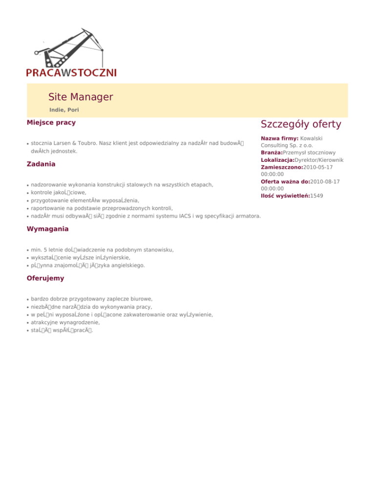 Site Manager Indie, Pori Miejsce pracy ● stocznia Larsen & Toubro. Nasz klient jest odpowiedzialny za nadzĂłr nad budowÄ dwĂłch jednostek. Zadania ● ● ● ● ● ● ● min. 5 letnie doĹwiadczenie na podobnym stanowisku, wyksztaĹcenie wyĹźsze inĹźynierskie, pĹynna znajomoĹÄ jÄzyka angielskiego. Oferujemy ● ● ● ● ● Nazwa firmy: Kowalski Consulting Sp. z o.o. Branża:Przemysł stoczniowy Lokalizacja:Dyrektor/Kierownik Zamieszczono:2010-05-17 00:00:00 Oferta ważna do:2010-08-17 00:00:00 Ilość wyświetleń:1549 nadzorowanie wykonania konstrukcji stalowych na wszystkich etapach, kontrole jakoĹciowe, przygotowanie elementĂłw wyposaĹźenia, raportowanie na podstawie przeprowadzonych kontroli, nadzĂłr musi odbywaÄ siÄ zgodnie z normami systemu IACS i wg specyfikacji armatora. Wymagania ● Szczegóły oferty bardzo dobrze przygotowany zaplecze biurowe, niezbÄdne narzÄdzia do wykonywania pracy, w peĹni wyposaĹźone i opĹacone zakwaterowanie oraz wyĹźywienie, atrakcyjne wynagrodzenie, staĹÄ wspĂłĹpracÄ.
