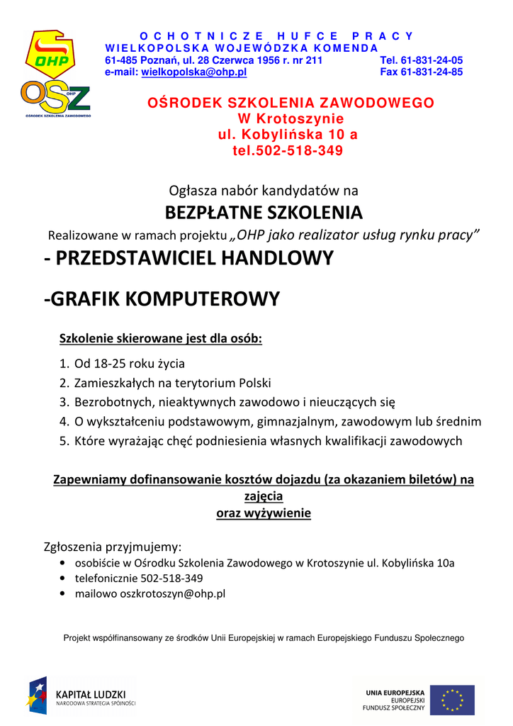 O C H O T N I C Z E H U F C E P R A C Y WIELKOPOLSKA WOJEWÓDZKA KOMENDA 61-485 Poznań, ul. 28 Czerwca 1956 r. nr 211 Tel. 61-831-24-05 e-mail: [email protected] Fax 61-831-24-85 OŚRODEK SZKOLENIA ZAWODOWEGO W Krotoszynie ul. Kobylińska 10 a tel.502-518-349 Ogłasza nabór kandydatów na BEZPŁATNE SZKOLENIA Realizowane w ramach projektu „OHP jako realizator usług rynku pracy” - PRZEDSTAWICIEL HANDLOWY -GRAFIK KOMPUTEROWY Szkolenie skierowane jest dla osób: 1. 2. 3. 4. 5. Od 18-25 roku życia Zamieszkałych na terytorium Polski Bezrobotnych, nieaktywnych zawodowo i nieuczących się O wykształceniu podstawowym, gimnazjalnym, zawodowym lub średnim Które wyrażając chęć podniesienia własnych kwalifikacji zawodowych Zapewniamy dofinansowanie kosztów dojazdu (za okazaniem biletów) na zajęcia oraz wyżywienie Zgłoszenia przyjmujemy: • osobiście w Ośrodku Szkolenia Zawodowego w Krotoszynie ul. Kobylińska 10a • telefonicznie 502-518-349 • mailowo [email protected] Projekt współfinansowany ze środków Unii Europejskiej w ramach Europejskiego Funduszu Społecznego [Wpisz tekst]