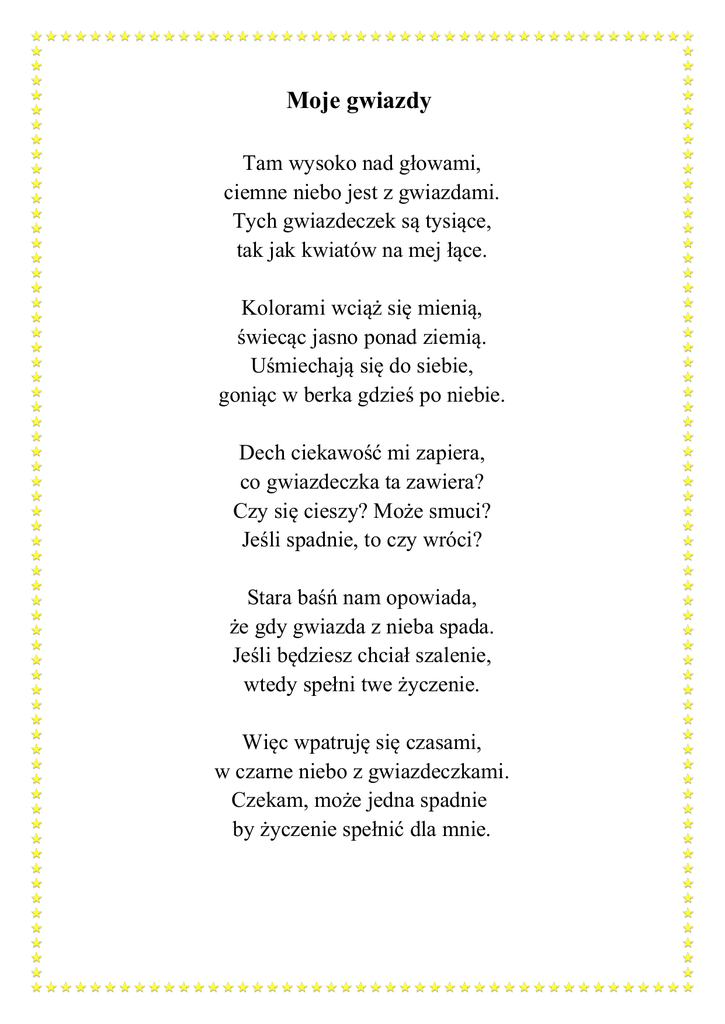 Moje gwiazdy Tam wysoko nad głowami, ciemne niebo jest z gwiazdami. Tych gwiazdeczek są tysiące, tak jak kwiatów na mej łące. Kolorami wciąż się mienią, świecąc jasno ponad ziemią. Uśmiechają się do siebie, goniąc w berka gdzieś po niebie. Dech ciekawość mi zapiera, co gwiazdeczka ta zawiera? Czy się cieszy? Może smuci? Jeśli spadnie, to czy wróci? Stara baśń nam opowiada, że gdy gwiazda z nieba spada. Jeśli będziesz chciał szalenie, wtedy spełni twe życzenie. Więc wpatruję się czasami, w czarne niebo z gwiazdeczkami. Czekam, może jedna spadnie by życzenie spełnić dla mnie.