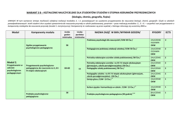 WARIANT 3 B – KSZTAŁCENIE NAUCZYCIELSKIE DLA STUDENTÓW STUDIÓW II STOPNIA KIERUNKÓW PRZYRODNICZNYCH (biologia, chemia, geografia, fizyka) UWAGA! W tym wariancie istnieje możliwość odrębnej realizacji modułów 2. i 3. pozwalających na uzyskanie przygotowania do nauczania biologii, chemii, geografii i fizyki w szkołach ponadpodstawowych. Jeżeli student chce uzyskać uprawnienia do nauczania przyrody w szkole podstawowej, powinien – poza realizacją modułów: 2., 3. i 4. – uzupełnić swe przygotowanie o komponenty niezbędne do nauczania przyrody (moduł 1. merytoryczny). Komponenty te realizowane są przez wydział, z którego rekrutują się uczestnicy BKN-‐u. Moduł Moduł 2. Przygotowanie w zakresie psychologiczno-‐ pedagogicznym Komponenty modułu Ogólne przygotowanie psychologiczno-‐pedagogiczne Przygotowanie psychologiczno-‐ pedagogiczne do nauczania na II, III i IV etapie edukacyjnym Liczba godzin minimalna 90 60+60 Liczba punktów minimalna 15 NAZWA ZAJĘĆ W BKN /WYMIAR GODZIN/ ZALICZENIE EGZAMIN OKM 2 Pedagogiczne podstawy edukacji szkolnej /15W 30 Ćw./ ZALICZENIE EGZAMIN OKM 2 Potrzeby edukacyjne uczniów szkoły podstawowej /30 Ćw./ Potrzeby edukacyjne uczniów na III i IV etapie edukacyjnym (gimnazjum, szkoła ponadgimnazjalna) /30 Ćw./ Pedagogika szkoły podstawowej /30 Ćw./ Pedagogika szkolna na III i IV etapie edukacyjnym (gimnazjum, szkoła ponadgimnazjalna) /30 Ćw./ 1 Emisja głosu /15W 15 Ćw./ ZALICZENIE OKM ZALICZENIE OKM ZALICZENIE OKM ZALICZENIE OKM ZALICZENIE OKM 2 ZALICZENIE OKM ZALICZENIE OKM 1 1 30 Praktyka psychologiczno-‐pedagogiczna (30 godzin) ECTS Podstawy psychologii dla nauczycieli /15W 30 Ćw./ Kultura języka i komunikacja w szkole /15W 15 Ćw./ Praktyka psychologiczno-‐ pedagogiczna RYGORY 2, 4 2 2 2 1 1 Moduł Moduł 3. Przygotowanie w zakresie dydaktycznym Komponenty modułu Podstawy dydaktyki ogólnej Dydaktyka przedmiotu (rodzaju zajęć) na III i IV etapie edukacyjnym (gimnazjum, szkoła ponadgimnazjalna i do kształcenia w zawodzie) Praktyka nauczycielska specjalnościowa na II etapie edukacyjnym (szkoła podstawowa) Praktyka nauczycielska specjalnościowa na III i IV etapie edukacyjnym (gimnazjum, szkoła ponadgimnazjalna i kształcenie w zawodzie) Moduł 4. Przygotowanie do nauczania kolejnego przedmiotu (prowadzenia zajęć) Dydaktyka przedmiotu „przyroda” w szkole podstawowej Praktyka nauczycielska w zakresie przedmiotu „przyroda” w szkole podstawowej Liczba godzin minimalna 30 Liczba punktów minimalna 15 90 120 60 10 60 NAZWA ZAJĘĆ W BKN /WYMIAR GODZIN/ RYGORY ECTS Podstawy dydaktyki ogólnej /15W 15 Ćw./ ZALICZENIE OKM 2 Dydaktyka przedmiotowa (w zakresie przygotowania do nauczania przedmiotu zgodnego z kierunkiem 3 studiów /30 W 60 Ćw./ ZALICZENIE EGZAMIN OKM 10 Praktyka nauczycielska 1 (w zakresie przygotowania do nauczania przedmiotu zgodnego z kierunkiem studiów) 4 /120 godzin/ ZALICZENIE OKM Dydaktyka przedmiotu „PRZYRODA” w szkole 3 podstawowej /60 Ćw./ EGZAMIN OKM 5 Praktyka nauczycielska (w zakresie przedmiotu 5 „PRZYRODA” w szkole podstawowej) ZALICZENIE OKM 5 3 1 Rozporządzenie MNiSW z dn. 17.01.2012 (Dz.U. z 06.02.2012, poz. 131, s.7) przewiduje realizację treści kształcenia z zakresu emisji głosu, kultury języka i komunikacji. Ze względu na specyfikę tych przedmiotów i konieczność ich realizacji przez specjalistów – wydzielono oddzielną pulę godzin wraz z puntami ECTS; 2 3 Realizowana pod opieką pedagoga. Realizowana przez dydaktyków przedmiotowych. 4 Co najmniej 80 godzin praktyk (w tym 30h praktyk psychologiczno-‐pedagogicznych, jeśli realizowane są w trakcie roku akademickiego) odbywa się równolegle z realizacją programu BKN-‐u, aby student miał możliwość konsultacji prowadzonych działań z opiekunem praktyk na uczelni oraz omawiania zgormadzonych doświadczeń w grupie studenckiej. 5 Realizowana samodzielnie w wybranej przez studenta placówce.