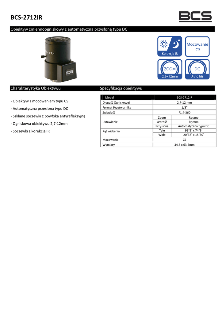 BCS-2712IR Obiektyw zmiennoogniskowy z automatyczna przysłoną typu DC Charakterystyka Obiektywu Specyfikacja obiektywu - Obiektyw z mocowaniem typu CS Model Długość Ogniskowej - Automatyczna przesłona typu DC Format Przetwornika Światłość - Szklane soczewki z powłoka antyrefleksyjną - Ogniskowa obiektywu 2,7-12mm Ustawienie - Soczewki z korekcją IR Kąt widzenia Mocowanie Wymiary BCS-2712IR 2,7-12 mm Zoom Ostrość Przysłona Tele Wide 1/3” F1.4-360 Ręczny Ręczna Automatyczna typu DC 99°9` x 74°9` 20°37` x 15°30` CS 34,5 x 63,5mm