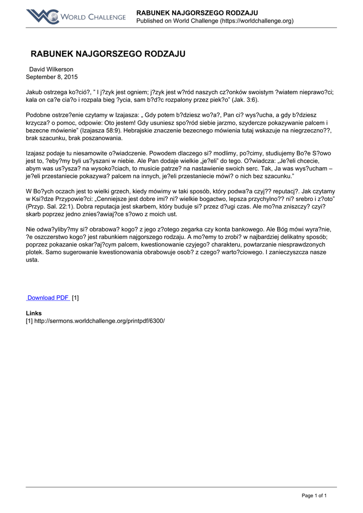 RABUNEK NAJGORSZEGO RODZAJU Published on World Challenge (https://worldchallenge.org) RABUNEK NAJGORSZEGO RODZAJU David Wilkerson September 8, 2015 Jakub ostrzega ko?ció?, ” I j?zyk jest ogniem; j?zyk jest w?ród naszych cz?onków swoistym ?wiatem nieprawo?ci; kala on ca?e cia?o i rozpala bieg ?ycia, sam b?d?c rozpalony przez piek?o” (Jak. 3:6). Podobne ostrze?enie czytamy w Izajasza: „ Gdy potem b?dziesz wo?a?, Pan ci? wys?ucha, a gdy b?dziesz krzycza? o pomoc, odpowie: Oto jestem! Gdy usuniesz spo?ród siebie jarzmo, szydercze pokazywanie palcem i bezecne mówienie” (Izajasza 58:9). Hebrajskie znaczenie bezecnego mówienia tutaj wskazuje na niegrzeczno??, brak szacunku, brak poszanowania. Izajasz podaje tu niesamowite o?wiadczenie. Powodem dlaczego si? modlimy, po?cimy, studiujemy Bo?e S?owo jest to, ?eby?my byli us?yszani w niebie. Ale Pan dodaje wielkie „je?eli” do tego. O?wiadcza: „Je?eli chcecie, abym was us?ysza? na wysoko?ciach, to musicie patrze? na nastawienie swoich serc. Tak, Ja was wys?ucham – je?eli przestaniecie pokazywa? palcem na innych, je?eli przestaniecie mówi? o nich bez szacunku.” W Bo?ych oczach jest to wielki grzech, kiedy mówimy w taki sposób, który podwa?a czyj?? reputacj?. Jak czytamy w Ksi?dze Przypowie?ci: „Cenniejsze jest dobre imi? ni? wielkie bogactwo, lepsza przychylno?? ni? srebro i z?oto” (Przyp. Sal. 22:1). Dobra reputacja jest skarbem, który buduje si? przez d?ugi czas. Ale mo?na zniszczy? czyi? skarb poprzez jedno znies?awiaj?ce s?owo z moich ust. Nie odwa?yliby?my si? obrabowa? kogo? z jego z?otego zegarka czy konta bankowego. Ale Bóg mówi wyra?nie, ?e oszczerstwo kogo? jest rabunkiem najgorszego rodzaju. A mo?emy to zrobi? w najbardziej delikatny sposób; poprzez pokazanie oskar?aj?cym palcem, kwestionowanie czyjego? charakteru, powtarzanie niesprawdzonych plotek. Samo sugerowanie kwestionowania obrabowuje osob? z czego? warto?ciowego. I zanieczyszcza nasze usta. Download PDF [1] Links [1] http://sermons.worldchallenge.org/printpdf/6300/ Page 1 of 1