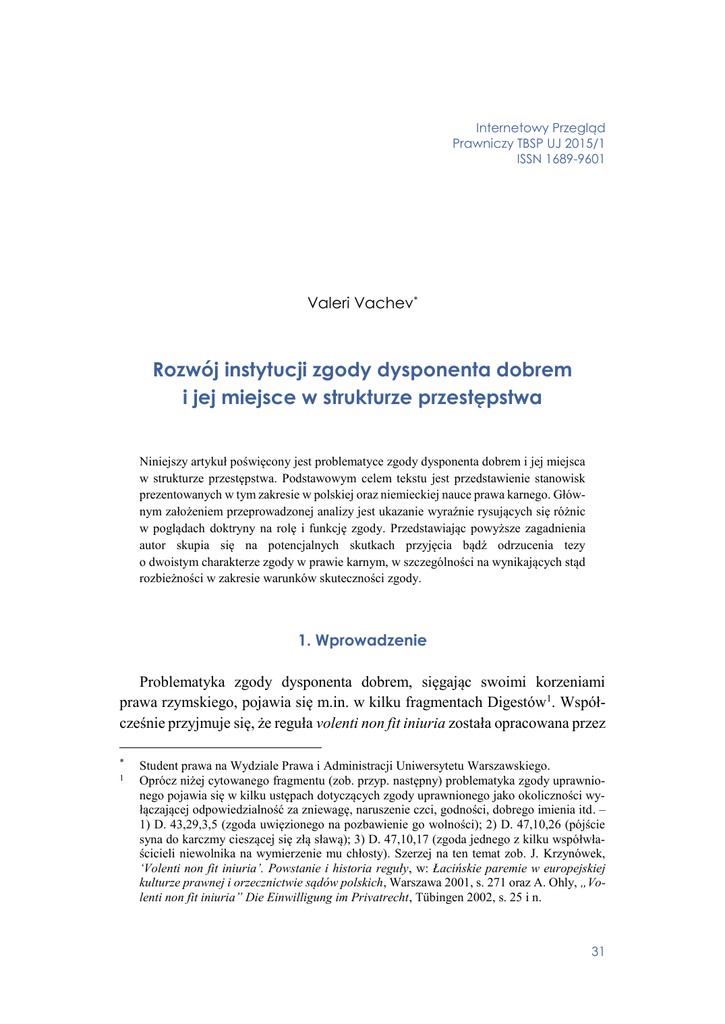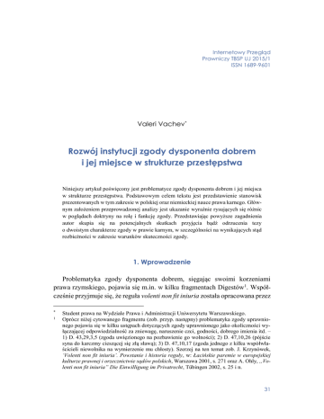 Internetowy Przegląd Prawniczy TBSP UJ 2015/1 ISSN 1689-9601 Valeri Vachev* Rozwój instytucji zgody dysponenta dobrem i jej miejsce w strukturze przestępstwa Niniejszy artykuł poświęcony jest problematyce zgody dysponenta dobrem i jej miejsca w strukturze przestępstwa. Podstawowym celem tekstu jest przedstawienie stanowisk prezentowanych w tym zakresie w polskiej oraz niemieckiej nauce prawa karnego. Głównym założeniem przeprowadzonej analizy jest ukazanie wyraźnie rysujących się różnic w poglądach doktryny na rolę i funkcję zgody. Przedstawiając powyższe zagadnienia autor skupia się na potencjalnych skutkach przyjęcia bądź odrzucenia tezy o dwoistym charakterze zgody w prawie karnym, w szczególności na wynikających stąd rozbieżności w zakresie warunków skuteczności zgody. 1. Wprowadzenie Problematyka zgody dysponenta dobrem, sięgając swoimi korzeniami prawa rzymskiego, pojawia się m.in. w kilku fragmentach Digestów1. Współcześnie przyjmuje się, że reguła volenti non fit iniuria została opracowana przez * 1 Student prawa na Wydziale Prawa i Administracji Uniwersytetu Warszawskiego. Oprócz niżej cytowanego fragmentu (zob. przyp. następny) problematyka zgody uprawnionego pojawia się w kilku ustępach dotyczących zgody uprawnionego jako okoliczności wyłączającej odpowiedzialność za zniewagę, naruszenie czci, godności, dobrego imienia itd. – 1) D. 43,29,3,5 (zgoda uwięzionego na pozbawienie go wolności); 2) D. 47,10,26 (pójście syna do karczmy cieszącej się złą sławą); 3) D. 47,10,17 (zgoda jednego z kilku współwłaścicieli niewolnika na wymierzenie mu chłosty). Szerzej na ten temat zob. J. Krzynówek, ‘Volenti non fit iniuria’. Powstanie i historia reguły, w: Łacińskie paremie w europejskiej kulturze prawnej i orzecznictwie sądów polskich, Warszawa 2001, s. 271 oraz A. Ohly, „Volenti non fit iniuria” Die Einwilligung im Privatrecht, Tübingen 2002, s. 25 i n. 31 Internetowy Przegląd Prawniczy TBSP UJ 2015/1 „Z zagadnień prawa karnego”, red. S. Żółtek rzymskich prawników i stanowi parafrazę następującej wypowiedzi Ulpiana, pochodzącej z księgi 56 komentarza do edyktu pretorskiego: „Usque adeo autem iniuria, quae fit liberis nostris, nostrum pudorem pertingit, ut, etiam si volentem filium quis vendiderit, patri suo quidem nomine competat iniuriarum actio; filio vero nomine non competit, quia nulla iniuria est, quae in volentem fiat”2. Cytowany fragment nie odnosi się bezpośrednio do znaczenia zgody w prawie rzymskim, lecz do przypadków, w których pewne działania naruszające godność syna mogły prowadzić jednocześnie do naruszenia godności (dobrego imienia) ojca3. Dobre imię członków rodziny stanowiło bowiem element dobrego imienia patris familias4. Część komentatorów, omawiając przytoczoną wypowiedź Ulpiana, ogranicza się wyłącznie do tego aspektu, pomijając problematykę zgody i jej znaczenia na gruncie prawa rzymskiego5. To, co współczesna nauka prawa nazywa usprawiedliwiającym charakterem zgody (niem. rechtfertigende Wirkung der Eienwilligung), Rzymianie i późniejsi komentatorzy traktowali jako coś oczywistego, w związku z czym w starszej romanistyce prawniczej problem ten był przedstawiany jedynie na marginesie innych zagadnień6. W romanistyce panuje zgoda co do tego, że użyte w omawianym fragmencie pojęcie iniuria powinno być rozumiane wąsko. Uwzględniając kontekst tego sformułowania oraz systematykę Digestów, nieporozumieniem byłoby odno- 2 3 4 5 6 Ulp. D. 47,10,1,5. W powołanym fragmencie chodzi o sprzedaż wolnego syna przez osobę trzecią jako niewolnika za jego zgodą jako zdarzenie naruszające godność ojca. Jak wiadomo, w prawie rzymskim człowiek (nie tylko niewolnicy) mógł stanowić przedmiot czynności prawnych. Ponadto z przytoczonego fragmentu Digestów wynika, że niektórzy członkowie rodziny (w omawianym przypadku syn) mogli dysponować swoją wolnością, skoro wyrażonej przez nich zgodzie przypisywane były skutki prawne. Szerzej na ten temat zob. A. Ohly, „Volenti non fit iniuria” Die Einwilligung im Privatrecht, Tübingen 2002, s. 26 oraz A. Pernice, Labeo: Römisches Privatrecht im ersten Jahrhunderte der Kaiser Zeit, Bd. 1, Halle 1895, s. 86. J. Krzynówek, ‘Volenti non fit iniuria’. Powstanie i historia reguł, w: Łacińskie paremie w europejskiej kulturze prawnej i orzecznictwie sądów polskich, Warszawa 2001, s. 272. Por. Friedrich Carl von Savigny, System des heutigen Römischen Rechts. Bd. 2. Berlin, 1840, s. 122. Zob. A. Pernice, Labeo: Römisches Privatrecht im ersten Jahrhunderte der Kaiser Zeit, Bd. 1, Halle 1895, s. 85. 32 Internetowy Przegląd Prawniczy TBSP UJ 2015/1 „Z zagadnień prawa karnego”, red. S. Żółtek szenie powyższej formuły do całego prawa rzymskiego i tym samym uczynienie z niej zasady prawnej 7 . Wątpliwości co do jej zakresu wynikają przede wszystkim z wieloznaczności pojęcia iniuria w prawie rzymskim8. W przytoczonej formule określenie to z pewnością nie nawiązuje do bezprawia (niem. Unrecht) w ogólnym znaczeniu tego pojęcia, lecz oznacza każde naruszenie praw (dóbr) osobistych9. Choć pierwotnie, w okresie przedklasycznym, iniuria miała charakter prywatnoprawny, późniejszy rozwój tej instytucji – będącej już samodzielnym deliktem zawierającym w sobie elementy dzisiejszego zniesławienia, zniewagi, czy też naruszenia nietykalności cielesnej – sprawił, że dorobek prawa rzymskiego w tym zakresie jest użyteczny również na potrzeby współczesnej nauki prawa karnego10. Rozwój iniurii doprowadził bowiem do 7 8 9 10 A. Zob. Ohly, „Volenti non fit iniuria” Die Einwilligung im Privatrecht, Tübingen 2002, s. 25; Zob. także P. Daniluk, Kryteria określające zakres dóbr prawnych będących przedmiotem dyspozycji w warunkach kontratypu zgody uprawnionego. Przegląd Sądowy 2007, nr. 4, s. 90. W Instytucjach justyniańskich (I. 4, 4 pr