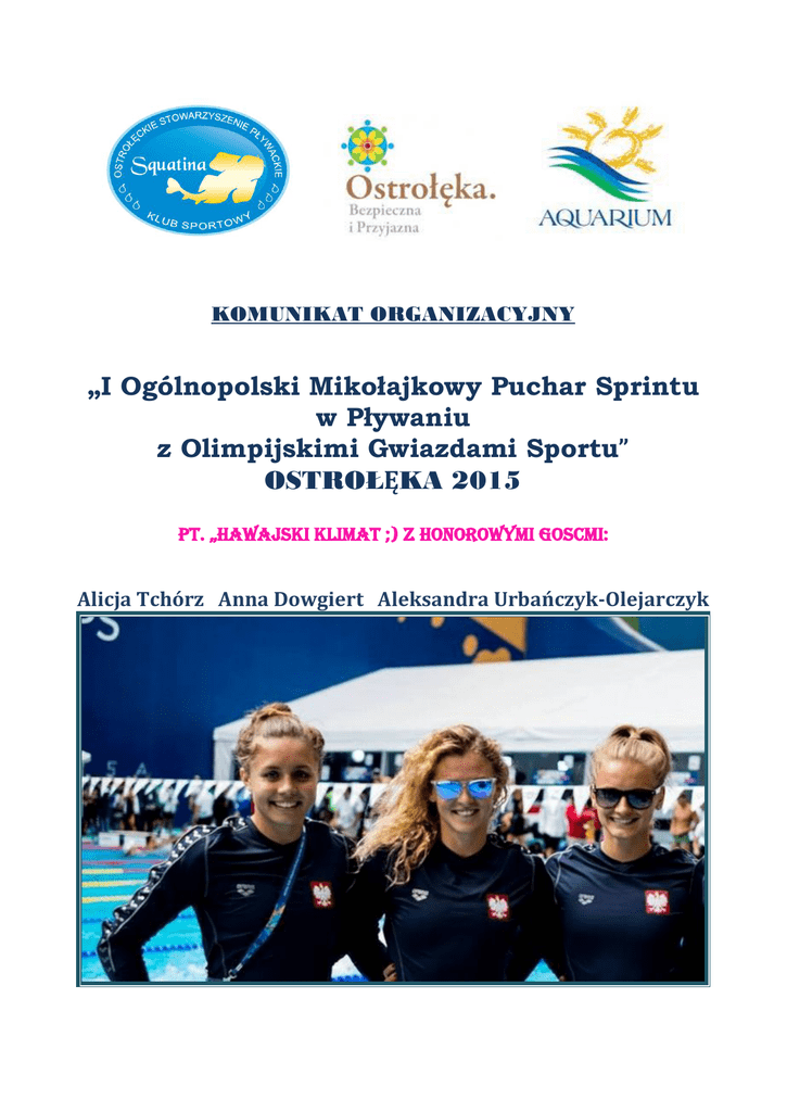 KOMUNIKAT ORGANIZACYJNY „I Ogólnopolski Mikołajkowy Puchar Sprintu w Pływaniu z Olimpijskimi Gwiazdami Sportu” OSTROŁĘKA 2015 Pt. „HAWAJSKI KLIMAt ;) z Honorowymi Goscmi: Alicja Tchórz Anna Dowgiert Aleksandra Urbańczyk-Olejarczyk TERMIN I MIEJSCE PUCHARU SPRINTU: 12 grudzień SOBOTA godz. 14.00 – 20.00 Park Wodny Aquarium ul.Witosa 3 07-410 Ostrołęka Długość pływalni: 25 metrów, 8 torów; temperatura wody: 27st. C pomiar czasu: elektroniczny ORGANIZATORZY: Klub Sportowy Ostrołęckie Stowarzyszenie Pływackie “Squatina” Ostrołęka Park Wodny Aquarium ul. Witosa 3 PATRONAT HONOROWY: Prezydent Miasta Ostrołęka Janusz Kotowski Wiceprezydent Miasta Grzegorz Płocha Prezes Unii Związków Sportowych Warszawy i Mazowsza Zbigniew Pacelt SPONSORZY I PARTNERZY: PARTNERZY MEDIALNI: CEL ZAWODÓW: popularyzacja radości zabawy z pływania wśród dzieci i młodzieży popularyzacja pływania na Mazowszu promocja Miasta Ostrołęka i Parku Wodnego „Aquarium” Integracja Środowisk Pływackich Komisja Sędziowska: Komisję sędziowską wyznacza Podkolegium Sędziowskie w Ciechanowie w porozumieniu z Kolegium Sędziowskim WMOZP Uczestnictwo: W Pucharze Sprintu mogą uczestniczyd wszystkie kluby zrzeszone w PZP, zawodnicy posiadający licencję PZP, urodzeni w latach 2003,2004,2005,2006 i 2007, posiadający aktualne badania lekarskie. Za aktualne badania lekarskie odpowiadają kierownicy/trenerzy drużyn. Każdy zawodnik ma prawo do 4 startów indywidualnych , rocznik 2007 bez stylu motylkowego-3 starty WAŻNE! Ubieramy się w pastelowe kolory żółty, zielony, błękitny, itp. - czarne, granatowe, itp koszulki zostawiamy w szafie (będzie kolorowo) Trenerzy zabierają ze sobą super humor, szalone zawodniczki i wesołych zawodników ;) na tą super imprezę ;) Wielkie Pływackie Widowisko będzie uwiecznione przez latającego DRONA GRZECHOTKI I MAŁE TRĄBKI MILE WIDZIANE Zgłoszenia do zawodów w formie pliku lxf należy dostarczyd drogą elektroniczną na adres [email protected] w nieprzekraczalnym terminie do dnia : 7 grudnia 2015 Zgłoszenie musi zawierad: imię i nazwisko zawodnika, pełną datę urodzenia DD/MM/RRRR, numer licencji, nazwę klubu, konkurencje oraz najlepszy wynik uzyskany w ostatnich 12 miesiącach. Zmiany przyjmowane będą do 8 grudnia, po tym terminie opłaty będą pobierane według ilości zgłoszeo. Wyniki on-line: www.omegatiming.pl Każdy uczestnik zawodów musi byd ubezpieczony za co odpowiedzialni są Trenerzy Klubów lub ich Opiekunowie. Dojazd i ubezpieczenie zawodników na koszt własny. PROGRAM ZAWODÓW: 15.00 – Uroczyste powitanie zaproszonych Gości. Wystąpienia Gości. (Defilada Zawodników).Pokazy Mistrzowskich Sprintów. 15.30 – rozpoczęcie wyścigów 1 2 3 4 5 6 7 8 50m st. dowolnym 50m st. dowolnym 50m st. grzbietowym 50m st. grzbietowym 50m st. klasycznym 50m st. klasycznym 50m st. motylkowym 50m st. motylkowym dziewcząt chłopców dziewcząt chłopców dziewcząt chłopców dziewcząt chłopców 2003 2003 2003 2003 2003 2003 2003 2003 2004 2004 2004 2004 2004 2004 2004 2004 2005 2005 2005 2005 2005 2005 2005 2005 2006 2006 2006 2006 2006 2006 2006 2006 2007 2007 2007 2007 2007 2007 xxxx xxxx NAGRODY: Medale i Dyplomy za miejsca 1-3 w każdej konkurencji i kategorii wiekowej + atrakcyjne nagrody Mikołajkowe Nagroda dla Najmłodszego 2007 Najlepszego zawodnika suma punktów FINA w trzech startach Nagroda Prezesa Unii Związków Warszawy i Mazowsza Pana Zbigniewa Pacelta dla najlepszej zawodniczki i zawodnika za najlepszy wynik punktowy w czterech konkurencjach (open) Nagroda dla Trenera Najlepszej Zawodniczki Mazowsza (open) Nagroda – Słodki Tort dla Najweselszej i Najatrakcyjniej ubranej w stylu Hawajskim Drużyny Dla Wszystkich uczestników niezapomniane chwile, sesje zdjęciowe z Olimpijskimi Gwiazdami Sportu, autografy, wesoła muzyka, zabawa i dużo niespodzianek z animatorami. Przewidziana balonowa zabawa: Konkurs szybkości dmuchania balona – 3 Nagrody główne – talony na lody. SPRAWY TECHNICZNO - ORGANIZACYJNE Rozgrzewka 14.00-14.20 dziewcząt, 14.20-14.40 chłopców; tor 1,2 – są torami w jednym kierunku i służą do wykonywania startów. Na pozostałych torach ustalono zakaz skoków pod rygorem wykluczenia ze startów. Puchar Sprintu zostanie przeprowadzony seriami na czas. Zawodnicy zostaną rozstawieni na podstawie zgłoszonych czasów. Dekoracje będą przeprowadzone w trakcie trwania wyścigów. Odprawa techniczna w dniu zawodów o godz.14.40 w Sali Konferencyjnej (Ipiętro) W sprawach nie określonych regulaminem, komunikatami oraz innymi przepisami decyzje podejmuje organizator. W przypadku dużej liczby zgłoszeo organizator zastrzega sobie prawo wcześniejszego zamknięcia listy zgłoszeo. Sprawy ważne – kontakt z organizatorem: Maja Bieżuoska (Kuriata) - wiceprezes klubu+ 48- 666-353-028, e-mail [email protected] Organizator przewidział poczęstunek dla Trenerów w Sali Konferencyjnej od godz.14.00 do 20.00 KOSZTY: Opłata startowa wynosi 40 złotych płatna w biurze przed rozpoczęciem zawodów. Koszty organizacyjne pokrywa organizator. Koszty dojazdu pokrywają Kluby w zakresie własnym. Istnieje możliwośd wykupienia posiłków dla zawodników w Parku Wodnym w Restauracji „Nemo”, wcześniejsze rezerwacje pod nr Tel. (29)760 06 66 (pon. - czw. w godzinach 10.00 - 20.00, pt. - nd. w godzinach 11.00 - 21.30) Przyjazd przedstawicieli H2Oshop.pl specjalistycznego sklepu pływackiego http://www.h2oshop.pl