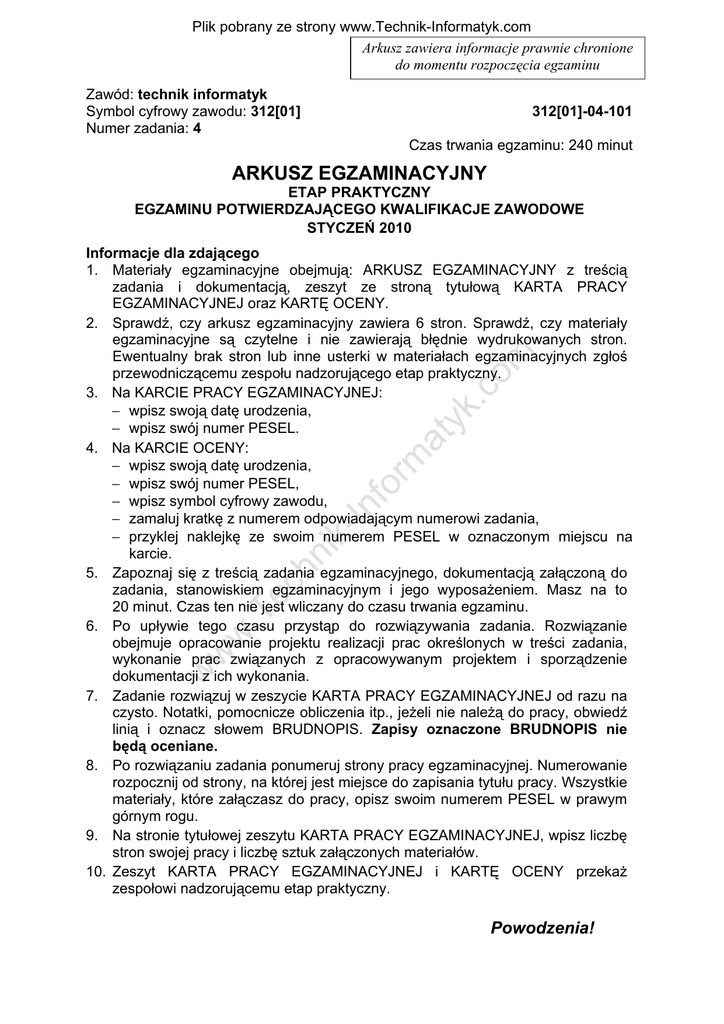 Plik pobrany ze strony www.Technik-Informatyk.com Arkusz zawiera informacje prawnie chronione do momentu rozpoczęcia egzaminu Zawód: technik informatyk Symbol cyfrowy zawodu: 312[01] Numer zadania: 4 312[01]-04-101 Czas trwania egzaminu: 240 minut ARKUSZ EGZAMINACYJNY ETAP PRAKTYCZNY EGZAMINU POTWIERDZAJĄCEGO KWALIFIKACJE ZAWODOWE STYCZEŃ 2010 w w w .T ec hn ik -In fo rm at yk .c om Informacje dla zdającego 1. Materiały egzaminacyjne obejmują: ARKUSZ EGZAMINACYJNY z treścią zadania i dokumentacją, zeszyt ze stroną tytułową KARTA PRACY EGZAMINACYJNEJ oraz KARTĘ OCENY. 2. Sprawdź, czy arkusz egzaminacyjny zawiera 6 stron. Sprawdź, czy materiały egzaminacyjne są czytelne i nie zawierają błędnie wydrukowanych stron. Ewentualny brak stron lub inne usterki w materiałach egzaminacyjnych zgłoś przewodniczącemu zespołu nadzorującego etap praktyczny. 3. Na KARCIE PRACY EGZAMINACYJNEJ: − wpisz swoją datę urodzenia, − wpisz swój numer PESEL. 4. Na KARCIE OCENY: − wpisz swoją datę urodzenia, − wpisz swój numer PESEL, − wpisz symbol cyfrowy zawodu, − zamaluj kratkę z numerem odpowiadającym numerowi zadania, − przyklej naklejkę ze swoim numerem PESEL w oznaczonym miejscu na karcie. 5. Zapoznaj się z treścią zadania egzaminacyjnego, dokumentacją załączoną do zadania, stanowiskiem egzaminacyjnym i jego wyposażeniem. Masz na to 20 minut. Czas ten nie jest wliczany do czasu trwania egzaminu. 6. Po upływie tego czasu przystąp do rozwiązywania zadania. Rozwiązanie obejmuje opracowanie projektu realizacji prac określonych w treści zadania, wykonanie prac związanych z opracowywanym projektem i sporządzenie dokumentacji z ich wykonania. 7. Zadanie rozwiązuj w zeszycie KARTA PRACY EGZAMINACYJNEJ od razu na czysto. Notatki, pomocnicze obliczenia itp., jeżeli nie należą do pracy, obwiedź linią i oznacz słowem BRUDNOPIS. Zapisy oznaczone BRUDNOPIS nie będą oceniane. 8. Po rozwiązaniu zadania ponumeruj strony pracy egzaminacyjnej. Numerowanie rozpocznij od strony, na której jest miejsce do zapisania tytułu pracy. Wszystkie materiały, które załączasz do pracy, opisz swoim numerem PESEL w prawym górnym rogu. 9. Na stronie tytułowej zeszytu KARTA PRACY EGZAMINACYJNEJ, wpisz liczbę stron swojej pracy i liczbę sztuk załączonych materiałów. 10. Zeszyt KARTA PRACY EGZAMINACYJNEJ i KARTĘ OCENY przekaż zespołowi nadzorującemu etap praktyczny. Powodzenia! Plik pobrany ze strony www.Technik-Informatyk.com Zadanie egzaminacyjne W firmie spedycyjnej KOMETA komputer używany jest do prac biurowych. Z komputera korzystają koordynator i jego dwaj współpracownicy kierowca i magazynier. Stwierdzono usterkę systemu komputerowego, w związku z tym koordynator wezwał serwis komputerowy w celu jej zdiagnozowania i usunięcia. Opracuj projekt realizacji prac prowadzących do lokalizacji i usunięcia usterki systemu komputerowego obejmujący: • diagnozę wstępną, • ustalenie przyczyn usterki, om • usunięcie usterki, .c • sprawdzenie poprawności działania systemu po usunięciu usterki. ik -In fo rm at yk W projekcie uwzględnij objawy wadliwej pracy systemu oraz informacje przekazane pracownikowi serwisu. Wykonaj czynności związane z opracowanym projektem i sporządź dokumentację z ich realizacji. Potwierdzenie wykonania prac związanych z opracowaniem projektu udokumentuj wykonaniem zrzutów obrazów ekranu monitora. hn Projekt realizacji prac powinien zawierać: ec 1. Tytuł pracy egzaminacyjnej zgodny z treścią zadania. .T 2. Założenia do projektu realizacji prac wynikające z treści zadania i załączników. w 3. Listę przyczyn usterki systemu komputerowego. w w 4. Wykaz działań prowadzących do usunięcia usterki systemu komputerowego. Dokumentacja z wykonania prac powinna zawierać: 5. Wykaz i opis wykonanych czynności prowadzących do usunięcia usterki systemu komputerowego. Do każdej czynności należy obowiązkowo dołączyć wydrukowany zrzut obrazu z ekranu monitora (lub zrzuty obrazów z ekranu monitora) dokumentujący wykonaną czynność. 6. Wskazania i instrukcje dla użytkowników komputera. Strona 2 z 6 Plik pobrany ze strony www.Technik-Informatyk.com Uwaga: Potwierdzenie wykonania prac udokumentuj wykorzystując zrzuty obrazów z ekranu monitora ilustrujące poszczególne etapy Twojej pracy. - Wykonane zrzuty obrazów z ekranu monitora skopiuj do edytora MS Word po dwa na jednej stronie wydruku. Wydrukuj 2 zrzuty na stronie, każdą ze stron wydruku podpisz cyfrowo swoim numerem PESEL. Pamiętaj o wykonaniu opisu zrzutów obrazu z ekranu monitora (czego dotyczą) oraz o ich czytelności. - Dokument zawierający wykonane zrzuty obrazów z ekranu monitora ilustrujących poszczególne etapy Twojej pracy zapisz jako „Zrzuty.doc” w folderze o nazwie odpowiadającej Twojemu numerowi PESEL, w katalogu C:\. yk Do wykonania zadania możesz wykorzystać: .c om - rm at Informacje przekazane przez użytkowników komputera firmy spedycyjnej KOMETA pracownikowi serwisu – Załącznik 1. Skrócony opis rejestru Windows. -In fo Artykuły z oficjalnych portali: Microsoft TechNet, Pomoc techniczna Windows firmy Microsoft – Załącznik 2. hn ik Zestaw komputerowy na stanowisku egzaminacyjnym. ec Oprogramowanie zainstalowane na komputerze. .T Oprogramowanie antywirusowe. w Instrukcję obsługi monitora wchodzącego w skład zestawu. w Dokumentację techniczną płyty głównej. w Do opracowania projektu realizacji prac przygotowano biurko do pisania, a do lokalizacji i usunięcia usterki systemu komputerowego przygotowano stanowisko komputerowe z systemem operacyjnym i standardowymi narzędziami. Komputer nie jest podłączony do Internetu i sieci lokalnej. Czas przeznaczony na wykonanie zadania wynosi 240 minut. Strona 3 z 6 Plik pobrany ze strony www.Technik-Informatyk.com Załącznik 1 I. Informacje przekazane przez koordynatora firmy spedycyjnej KOMETA pracownikowi serwisu komputerowego 1. Komputer powinie