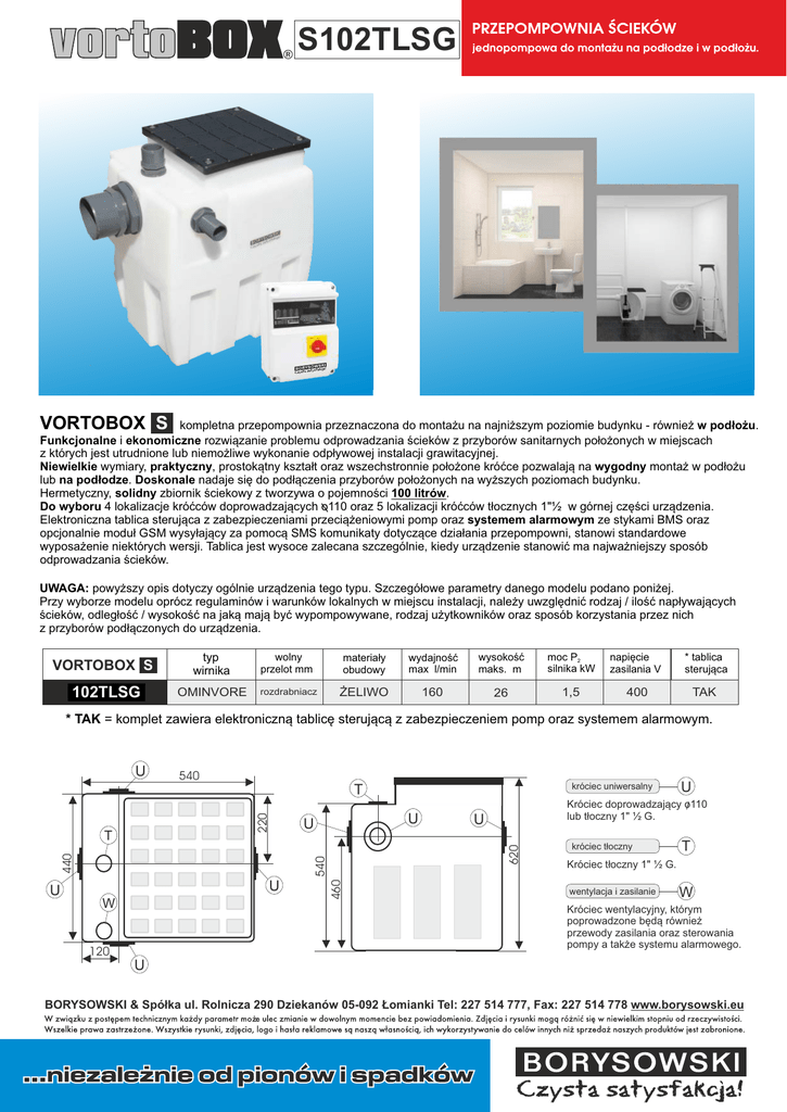 S102TLSG VORTOBOX S kompletna przepompownia przeznaczona do montażu na najniższym poziomie budynku - również w podłożu. Funkcjonalne i ekonomiczne rozwiązanie problemu odprowadzania ścieków z przyborów sanitarnych położonych w miejscach z których jest utrudnione lub niemożliwe wykonanie odpływowej instalacji grawitacyjnej. Niewielkie wymiary, praktyczny, prostokątny kształt oraz wszechstronnie położone króćce pozwalają na wygodny montaż w podłożu lub na podłodze. Doskonale nadaje się do podłączenia przyborów położonych na wyższych poziomach budynku. Hermetyczny, solidny zbiornik ściekowy z tworzywa o pojemności 100 litrów. Do wyboru 4 lokalizacje króćców doprowadzających o110 oraz 5 lokalizacji króćców tłocznych 1"½ w górnej części urządzenia. Elektroniczna tablica sterująca z zabezpieczeniami przeciążeniowymi pomp oraz systemem alarmowym ze stykami BMS oraz opcjonalnie moduł GSM wysyłający za pomocą SMS komunikaty dotyczące działania przepompowni, stanowi standardowe wyposażenie niektórych wersji. Tablica jest wysoce zalecana szczególnie, kiedy urządzenie stanowić ma najważniejszy sposób odprowadzania ścieków. UWAGA: powyższy opis dotyczy ogólnie urządzenia tego typu. Szczegółowe parametry danego modelu podano poniżej. Przy wyborze modelu oprócz regulaminów i warunków lokalnych w miejscu instalacji, należy uwzględnić rodzaj / ilość napływających ścieków, odległość / wysokość na jaką mają być wypompowywane, rodzaj użytkowników oraz sposób korzystania przez nich z przyborów podłączonych do urządzenia. VORTOBOX S typ wirnika wolny przelot mm materiały obudowy wydajność max l/min wysokość maks. m moc P2 silnika kW napięcie zasilania V * tablica sterująca 102TLSG OMINVORE rozdrabniacz ŻELIWO 160 26 1,5 400 TAK * TAK = komplet zawiera elektroniczną tablicę sterującą z zabezpieczeniem pomp oraz systemem alarmowym. U 540 króciec uniwersalny U W 460 U 540 440 T U U U Króciec doprowadzający o110 lub tłoczny 1" ½ G. U 620 220 T króciec tłoczny T Króciec tłoczny 1" ½ G. wentylacja i zasilanie W Króciec wentylacyjny, którym poprowadzone będą również przewody zasilania oraz sterowania pompy a także systemu alarmowego. 120 U BORYSOWSKI & Spółka ul. Rolnicza 290 Dziekanów 05-092 Łomianki Tel: 227 514 777, Fax: 227 514 778 www.borysowski.eu S102TLSG VORTOBOX S102TLSG wyposażony to ekonomiczne i przyjazne dla środowiska rozwiązanie szczególnie polecane w systemach kanalizacji ciśnieniowej jak również innych typach przepompowni. Charakteryzuje się bardzo duża wysokością podnoszenia i doskonałą zdolnością rozdrabniania ścieków. System rozdrabniania OMNIVORE to obecnie najskuteczniejszy system rozdrabniająco-tłoczący na świecie. Wykorzystuje opatentowany, nie-blokujący się rozdrabniacz V-Slice Cutter. Podczas jednego obrotu następuje nawet 108 niezależnych cięć materiału przez ostre odpowiednio wyprofilowane otwory i cztero-łopatkowy nóż tnący. Cząsteczki są „rozszarpywane” do minimalnych rozmiarów pozwalających na ich wypompowanie rurociągiem tłocznym lub odrzucane od wirnika, nie blokując go. Taka konstrukcja nie powoduje zatrzymywania się niemożliwych do rozdrobnienia materiałów na wirniku pompy tak jak to się dzieje w systemach innych producentów. Wykorzystane surowce. Uchwyt: stal nierdzewna z gumową osłoną; Obudowa silnika: stal żeliwna klasy 25, pompy: stal żeliwna klasy 25; Olej: ISO VG32; Wał wirnika: stal nierdzewna serii 300; Uszczelnienie górne: węglik krzemu, dolne: podwójna VITON (Dupont) Rozdrabniacz: stal nierdzewna serii 440 utwardzona do Rockwell 58c Łożysko górne: jednorzędowe, dolne: skośne; Mocowania: stal nierdzewna serii 300; Malowanie zewnętrzne: proszkowe; Kabel zasilający długość: 10m H07RN-F (HAR) Podwodny 1O: 3/C 2,5 mm2 WYKRES PRZEPŁYWU Projektując rurociąg tłoczny należy zwrócić uwagę na zapewnienie odpowiedniej prędkości przepływu która nie powinna być mniejsza niż 0,6m/s. Zapobiegnie to powstawaniu osadów we wnętrzu rurociągu! Uwaga ! Wszelkie prawa zastrzeżone. Wszystkie nazwy, logo, hasła reklamowe, znaki towarowe, rysunki i zdjęcia zawarte w tym katalogu są własnością naszą lub naszych dostawców. Ich wykorzystanie do jakichkolwiek celów innych niż sprzedaż naszych produktów jest zabronione i będzie ścigane z całą surowością prawa. Wszelkie ilustracje zamieszczone w naszych materiałach reklamowych, katalogach, folderach, ogłoszeniach itp. należy traktować jako nie wiążące. Ze względu na postęp techniczny każdy parametr może ulec zmianie w dowolnym momencie bez powiadomienia. Nie ponosimy odpowiedzialności za błędną interpretację informacji oraz danych technicznych przez nas podanych. Za właściwy dobór produktów oraz ich prawidłowe wykorzystanie jest odpowiedzialny wyłącznie zamawiający. Prosimy o potwierdzenie u nas istotnych dla Państwa parametrów bezpośrednio przed złożeniem zamówienia. Sprzedaż następuje wyłącznie w oparciu o aktualne warunki sprzedaży obowiązujące w firmie BORYSOWSKI & Spółka. BORYSOWSKI & Spółka ul. Rolnicza 290 Dziekanów 05-092 Łomianki Tel: 227 514 777, Fax: 227 514 778 www.borysowski.eu
