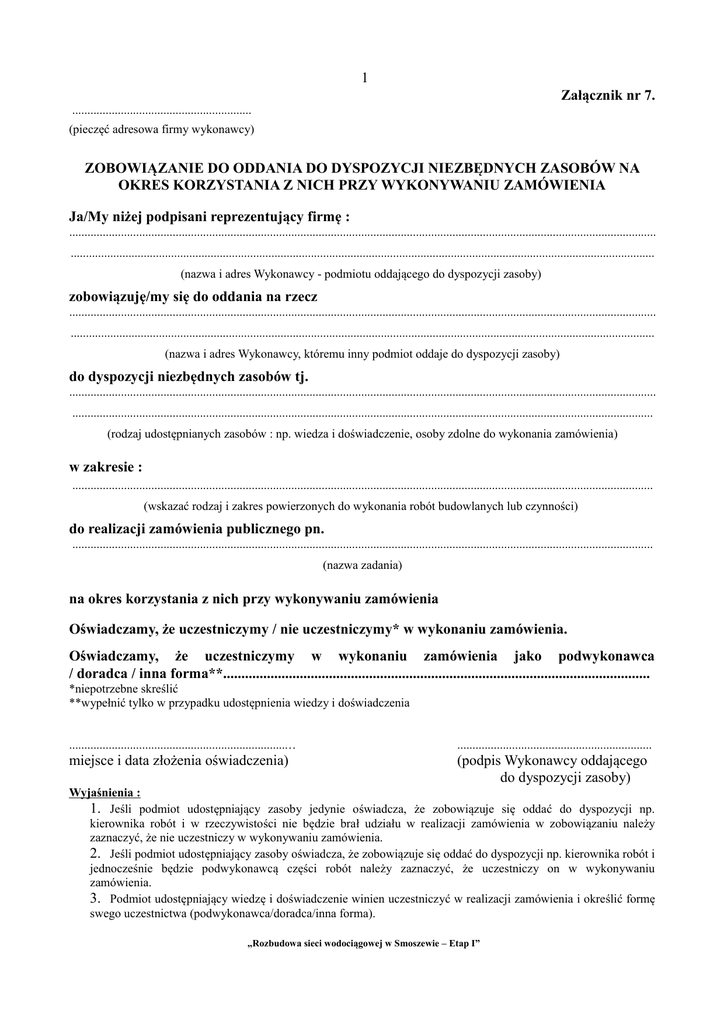 1 Załącznik nr 7. ........................................................... (pieczęć adresowa firmy wykonawcy) ZOBOWIĄZANIE DO ODDANIA DO DYSPOZYCJI NIEZBĘDNYCH ZASOBÓW NA OKRES KORZYSTANIA Z NICH PRZY WYKONYWANIU ZAMÓWIENIA Ja/My niżej podpisani reprezentujący firmę : ................................................................................................................................................................................................. ................................................................................................................................................................................................ (nazwa i adres Wykonawcy - podmiotu oddającego do dyspozycji zasoby) zobowiązuję/my się do oddania na rzecz ................................................................................................................................................................................................. ................................................................................................................................................................................................ (nazwa i adres Wykonawcy, któremu inny podmiot oddaje do dyspozycji zasoby) do dyspozycji niezbędnych zasobów tj. ................................................................................................................................................................................................. ............................................................................................................................................................................................... (rodzaj udostępnianych zasobów : np. wiedza i doświadczenie, osoby zdolne do wykonania zamówienia) w zakresie : ............................................................................................................................................................................................... (wskazać rodzaj i zakres powierzonych do wykonania robót budowlanych lub czynności) do realizacji zamówienia publicznego pn. ............................................................................................................................................................................................... (nazwa zadania) na okres korzystania z nich przy wykonywaniu zamówienia Oświadczamy, że uczestniczymy / nie uczestniczymy* w wykonaniu zamówienia. Oświadczamy, że uczestniczymy w wykonaniu zamówienia jako podwykonawca / doradca / inna forma**..................................................................................................................... *niepotrzebne skreślić **wypełnić tylko w przypadku udostępnienia wiedzy i doświadczenia .......................................................................... ................................................................ miejsce i data złożenia oświadczenia) (podpis Wykonawcy oddającego do dyspozycji zasoby) Wyjaśnienia : 1. Jeśli podmiot udostępniający zasoby jedynie oświadcza, że zobowiązuje się oddać do dyspozycji np. kierownika robót i w rzeczywistości nie będzie brał udziału w realizacji zamówienia w zobowiązaniu należy zaznaczyć, że nie uczestniczy w wykonywaniu zamówienia. 2. Jeśli podmiot udostępniający zasoby oświadcza, że zobowiązuje się oddać do dyspozycji np. kierownika robót i jednocześnie będzie podwykonawcą części robót należy zaznaczyć, że uczestniczy on w wykonywaniu zamówienia. 3. Podmiot udostępniający wiedzę i doświadczenie winien uczestniczyć w realizacji zamówienia i określić formę swego uczestnictwa (podwykonawca/doradca/inna forma). „Rozbudowa sieci wodociągowej w Smoszewie – Etap I”