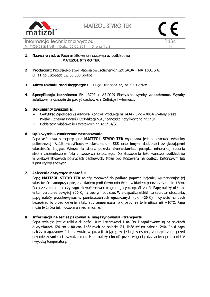 MATIZOL STYRO TEK Informacja techniczna wyrobu Nr IT-CE-32.2/14/G Data: 03.03.2014 Strona 1 z 2 1434 11 1. Nazwa wyrobu: Papa asfaltowa samoprzylepna, podkładowa MATIZOL STYRO TEK 2. Producent: Przedsiębiorstwo Materiałów Izolacyjnych IZOLACJA – MATIZOL S.A. ul. 11-go Listopada 32, 38-300 Gorlice 3. Adres zakładu produkcyjnego: ul. 11-go Listopada 32, 38-300 Gorlice 4. Specyfikacja techniczna: EN 13707 + A2:2009 Elastyczne wyroby wodochronne. Wyroby asfaltowe na osnowie do pokryć dachowych. Definicje i własności. 5. Dokumenty związanie: Certyfikat Zgodności Zakładowej Kontroli Produkcji nr 1434 - CPR – 0054 wydany przez Polskie Centrum Badań i Certyfikacji S.A., jednostkę notyfikowaną nr 1434 Deklaracja właściwości użytkowych nr 32.1/14/G 6. Opis wyrobu, zamierzone zastosowanie: Papa asfaltowa samoprzylepna MATIZOL STYRO TEK wykonana jest na osnowie włókniny poliestrowej. Asfalt modyfikowany elastomerem SBS oraz innymi dodatkami zwiększającymi właściwości klejące. Wierzchnia strona pokryta drobnoziarnistą posypką mineralną, spodnia strona zabezpieczona folią z tworzywa sztucznego. Do stosowania jako warstwa podkładowa w wielowarstwowych pokryciach dachowych. Może być stosowana na podłożu betonowym lub z płyt styropianowych. 7. Zalecenia dotyczące montażu: Papę MATIZOL STYRO TEK należy mocować do podłoża poprzez klejenie, wykorzystując jej właściwości samoprzylepne, z zakładem podłużnym min 8cm i zakładem poprzecznym min 12cm. Podłoże z betonu należy zagruntować roztworem gruntującym, np. Abizol R. Papę należy układać w temperaturze powyżej +10oC, na suchym podłożu. W przypadku niskich temperatur otoczenia, papę należy przechowywać w pomieszczeniach ogrzewanych (ok. +20 oC) i wynosić na dach bezpośrednio przed klejeniem tak, aby temperatura rolki papy nie była niższa niż +10oC. Papa może być również mocowana mechanicznie. 8. Informacja na temat pakowania, magazynowania i transportu: Papa zwinięta jest w rolki o długości 10 m i szerokości 1 m. Rolki zapakowane są na paletach o wymiarach 120 cm x 80 cm. Ilość rolek na palecie: 24; ilość m2 na palecie: 240. Rolki papy należy magazynować i przewozić w pozycji stojącej, w jednej warstwie, zabezpieczone przed przemieszczaniem i uszkodzeniem. Papę należy chronić przed wilgocią, działaniem promieni UV i wysoką temperaturą. MATIZOL STYRO TEK Informacja techniczna wyrobu Nr IT-CE-32.2/14/G 9. Data: 03.03.2014 1434 Strona 2 z 2 11 Deklarowane właściwości użytkowe Lp. Zasadnicze charakterystyki 1. Oddziaływanie ognia zewnętrznego 2. Reakcja na ogień 3. Wodoszczelność w 10 kPa Maksymalna siłą rozciągająca 4. - kierunek wzdłuż - kierunek w poprzek Wydłużenie przy maksymalnej sile rozciągającej 5. - kierunek wzdłuż - kierunek w poprzek 6. Odporność na przerastanie korzeni 7. Odporność na obciążenie statyczne 8. Odporność na uderzenie Wytrzymałość na rozdzieranie gwoździem 9. - kierunek wzdłuż - kierunek w poprzek 10. Wytrzymałość złącza na oddzieranie 11. Wytrzymałość złącza na ścinanie 12. Giętkość w niskiej temperaturze 13. Substancje niebezpieczne Właściwości użytkowe Zharmonizowana specyfikacja techniczna NPD Klasa E Wynik pozytywny (900 ± 200) N/50mm (700 ± 200) N/50mm (65 ± 15) % (65 ± 15) % NPD NPD NPD EN 13707:2004+A2:2009 (180 ± 50) N (200 ± 50) N NPD NPD ≤ - 25oC spełnia normę 10. Inne właściwości Lp. Właściwości Wymiary - długość 1. - szerokość - prostoliniowość 2. Grubość w pasie z posypką Odporność na spływanie w podwyższonej 3. temperaturze Wymagania ≥ 10 m ≥0,99 m (1,00 ± 0,01) ≤ 20mm/10m (2,6 ± 0,2) mm o ≥ 90 C Metody badań PN-EN 1848-1:2002 PN-EN 1849-1:2002 PN-EN 1110:2011