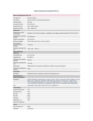 Dane techniczne drukarki AP 4.4 Dane technincze AP 4.4 Typ głowicy Głowica płaska Typ druku Druk termiczny lub termotransferowy Rozdzielczość 203 dpi Szerokość druku Do 105 mm Prędkość druku max. 200 mm/sec Długość etykiety Max. 1000 mm Materiał Obsługiwane typy materiałów Etykiety na roli lub na taśmie, z odstępem lub ciągłe, etykiety foliowe PP, PVC, PE, PA Obsługiwana grubość etykiet 60-240 g/m² MoŜliwe szerokości Do 120 mm MoŜliwe długości Od 10 mm (0,4") do 1.143 mm (45") Max średnica zewnętrzna roli etykiet 210 mm Średnica wewnętrzna roli 38,1 mm – 100 m Specyfikacja ribbonu Szerokość folii Do 114 mm Długość folii Do 500 m Zewnętrzna średnica ribbonu 80 mm Średnica wewnętrzna roli 25 mm Nawinięcie Standardowo nawinięcie wewnętrzne moŜliwe uŜycie zewnętrzne Funkcja oszczędzania ribbonu Brak Czcionki Standard MoŜliwość druku wszystkich czcionek komputerowych. Obsługiwane kody kreskowe Standard EAN 8 and EAN 13 with add on 2 and 5, UPC-A, UPC-E, Code 39, Code 39 Ratio 3:1 and Ratio 2,5:1, Code ITF, Codabar, UPS Code 128, Code 2/5, Code 2/5 1, Code 2/5 5, Code 2/5 Interleaved Ratio 1:3, Code 2/5 Matrix Ratio 1:2,5; Code 2/5 Matrix Ratio 1:3; Code MSI, Code EAN 128, Postcode, UPS Code 128, wszystkie kody skalowalne. 2-D Data Matrix Code, Maxi Code, PDF 417, Codablock F Interfejsy Parallel Centronics Tak Serial RS 232 Tak RS 422 Brak RS 485 Brak Ethernet brak USB Slave 1.1 Tak Internal Interfaces Inne Slot na karty CF Brak Procesor 32 bitowy Emulacja ZPL Sterowniki Windows 95/98/2000/NT/XP Dodatkowe akcesoria Samoinicjujący czujnik foto Brak Emulacja EASY PLUG Tak Sztaplarka (Jumbo/Power) Brak Nawijak etykiet Opcja NóŜ Brak Dyspenzer Brak Full size light sensor Brak Czujnik refleksyjny Brak Zegar czasu rzeczywistego Brak Print server Tak MoŜliwość pracy bez komputera brak Zintegrowana krawędź do oddzierania etykiet Wymiary (Dł. x Szer. x Wys.) mm 272 x 260 x 462 Waga w kg 14 DANE TECHNICZNE DRUKARKI AP 5.4 Dane technincze AP 5.4 Typ głowicy Głowica płaska Typ druku Druk termiczny lub termotransferowy Rozdzielczość Dostępne wersje 203 i 300 dpi Szerokość druku Do 105 mm Prędkość druku max. 200 mm/sec Długość etykiety Max. 1000 mm Materiał Obsługiwane typy materiałów Etykiety na roli lub na taśmie, z odstępem lub ciągłe, etykiety foliowe PP, PVC, PE, PA Obsługiwana grubość etykiet 60-240 g/m² MoŜliwe szerokości Do 120 mm MoŜliwe długości Od 10 mm (0,4") do 1.143 mm (45") Max średnica zewnętrzna roli etykiet 210 mm Średnica wewnętrzna roli 38,1 mm – 100 m Specyfikacja ribbonu Szerokość folii Do 114 mm Długość folii Do 500 m Zewnętrzna średnica ribbonu 80 mm Średnica wewnętrzna roli 25 mm Nawinięcie Standardowo nawinięcie wewnętrzne moŜliwe uŜycie zewnętrzne Funkcja oszczędzania ribbonu Brak Czcionki Standard MoŜliwość druku wszystkich czcionek komputerowych. Obsługiwane kody kreskowe Standard EAN 8 and EAN 13 with add on 2 and 5, UPC-A, UPC-E, Code 39, Code 39 Ratio 3:1 and Ratio 2,5:1, Code ITF, Codabar, UPS Code 128, Code 2/5, Code 2/5 1, Code 2/5 5, Code 2/5 Interleaved Ratio 1:3, Code 2/5 Matrix Ratio 1:2,5; Code 2/5 Matrix Ratio 1:3; Code MSI, Code EAN 128, Postcode, UPS Code 128, wszystkie kody skalowalne. 2-D Data Matrix Code, Maxi Code, PDF 417, Codablock F Interfejsy Parallel Centronics Tak Serial RS 232 Tak RS 422 Tak RS 485 Tak Ethernet Tak USB Slave 1.1 Tak Internal Interfaces Inne Slot na karty CF Tak Procesor 32 bitowy Emulacja ZPL Sterowniki Windows 95/98/2000/NT/XP Dodatkowe akcesoria samoinicjujący czujnik foto Brak Emulation EASY PLUG Tak Sztaplarka(Jumbo/Power) Brak Nawijak etykiet Opcja NóŜ Opcja Dyspenzer Opcja Full size light sensor Opcja Czujnik refleksyjny Opcja Zegar czasu rzeczywistego Standard Print server Tak MoŜliwość pracy bez komputera Tak Zintegrowana krawędź do oddzierania etykiet Tak Wymiary (Dł. x Szer. x Wys.) mm 272 x 260 x 462 Waga w kg 14