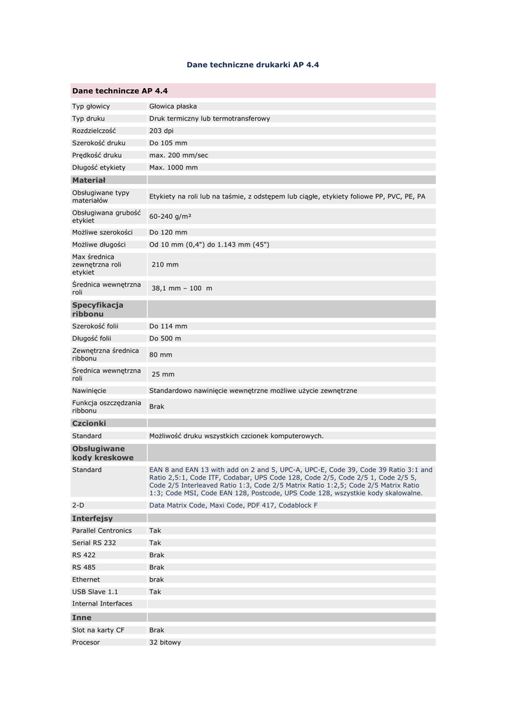 Dane techniczne drukarki AP 4.4 Dane technincze AP