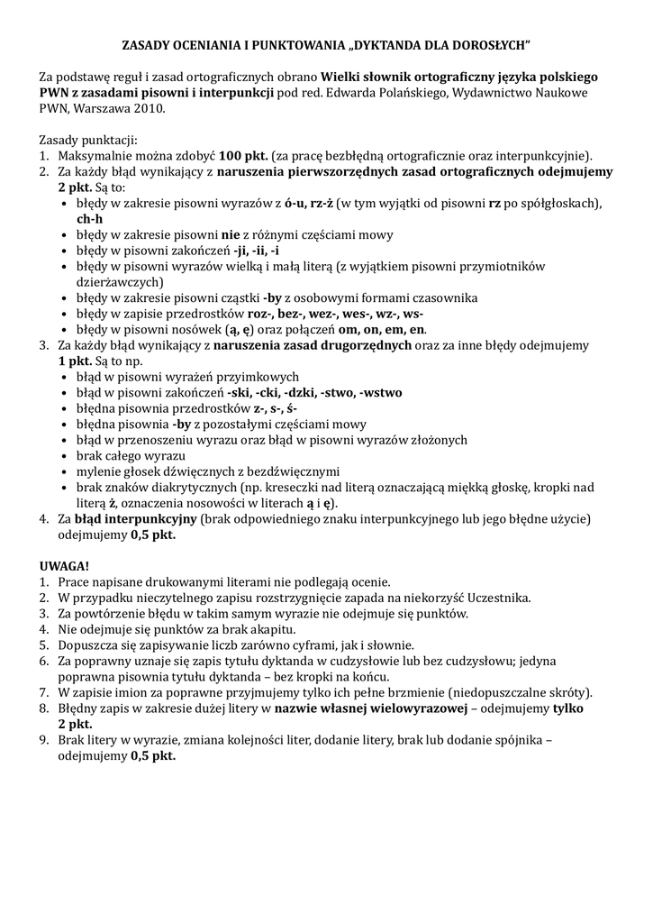 ZASADY OCENIANIA I PUNKTOWANIA „DYKTANDA DLA DOROSŁYCH” Za podstawę reguł i zasad ortograficznych obrano Wielki słownik ortograficzny języka polskiego PWN z zasadami pisowni i interpunkcji pod red. Edwarda Polańskiego, Wydawnictwo Naukowe PWN, Warszawa 2010. Zasady punktacji: 1. Maksymalnie można zdobyć 100 pkt. (za pracę bezbłędną ortograficznie oraz interpunkcyjnie). 2. Za każdy błąd wynikający z naruszenia pierwszorzędnych zasad ortograficznych odejmujemy 2 pkt. Są to: • błędy w zakresie pisowni wyrazów z ó-u, rz-ż (w tym wyjątki od pisowni rz po spółgłoskach), ch-h • błędy w zakresie pisowni nie z różnymi częściami mowy • błędy w pisowni zakończeń -ji, -ii, -i • błędy w pisowni wyrazów wielką i małą literą (z wyjątkiem pisowni przymiotników dzierżawczych) • błędy w zakresie pisowni cząstki -by z osobowymi formami czasownika • błędy w zapisie przedrostków roz-, bez-, wez-, wes-, wz-, ws• błędy w pisowni nosówek (ą, ę) oraz połączeń om, on, em, en. 3. Za każdy błąd wynikający z naruszenia zasad drugorzędnych oraz za inne błędy odejmujemy 1 pkt. Są to np. • błąd w pisowni wyrażeń przyimkowych • błąd w pisowni zakończeń -ski, -cki, -dzki, -stwo, -wstwo • błędna pisownia przedrostków z-, s-, ś• błędna pisownia -by z pozostałymi częściami mowy • błąd w przenoszeniu wyrazu oraz błąd w pisowni wyrazów złożonych • brak całego wyrazu • mylenie głosek dźwięcznych z bezdźwięcznymi • brak znaków diakrytycznych (np. kreseczki nad literą oznaczającą miękką głoskę, kropki nad literą ż, oznaczenia nosowości w literach ą i ę). 4. Za błąd interpunkcyjny (brak odpowiedniego znaku interpunkcyjnego lub jego błędne użycie) odejmujemy 0,5 pkt. UWAGA! 1. Prace napisane drukowanymi literami nie podlegają ocenie. 2. W przypadku nieczytelnego zapisu rozstrzygnięcie zapada na niekorzyść Uczestnika. 3. Za powtórzenie błędu w takim samym wyrazie nie odejmuje się punktów. 4. Nie odejmuje się punktów za brak akapitu. 5. Dopuszcza się zapisywanie liczb zarówno cyframi, jak i słownie. 6. Za poprawny uznaje się zapis tytułu dyktanda w cudzysłowie lub bez cudzysłowu; jedyna poprawna pisownia tytułu dyktanda – bez kropki na końcu. 7. W zapisie imion za poprawne przyjmujemy tylko ich pełne brzmienie (niedopuszczalne skróty). 8. Błędny zapis w zakresie dużej litery w nazwie własnej wielowyrazowej – odejmujemy tylko 2 pkt. 9. Brak litery w wyrazie, zmiana kolejności liter, dodanie litery, brak lub dodanie spójnika – odejmujemy 0,5 pkt.