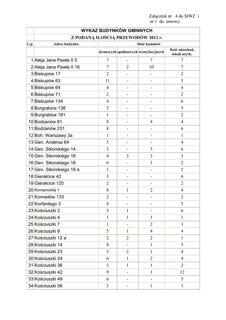 Załącznik nr 4 do SIWZ i nr 1 do umowy WYKAZ BUDYNKÓW GMINNYCH Z PODANĄ ILOŚCIĄ PRZEWODÓW 2012 r. L.p. Adres budynku Ilość kominów dymowych spalinowych wentylacyjnych Ilość mieszkań, lokali uŜytk. 1 Aleja Jana Pawła II 5 2 Aleja Jana Pawła II 16 7 7 2 7 10 7 7 3 Biskupów 17 4 Biskupów 63 5 Biskupów 64 6 Biskupów 71 2 11 4 2 - - 2 5 4 2 7 Biskupów 134 8 Burgrabice 138 9 Burgrabice 181 10 Bodzanów 81 4 5 1 8 8 - 4 - 6 5 2 4 6 1 3 3 4 3 5 3 1 4 6 3 6 1 3 2 - 1 - 2 2 6 2 8 2 8 5 1 1 1 1 2 1 4 2 5 6 1 1 - 2 1 28 Kościuszki 14 29 Kościuszki 23 30 Kościuszki 24 5 2 8 5 6 1 2 2 1 4 2 1 1 2 4 1 5 4 4 31 Kościuszki 36 32 Kościuszki 42 33 Kościuszki 49 34 Kościuszki 56 3 9 6 2 1 - 1 1 1 2 12 5 1 11 Bodzanów 231 12 Boh. Warszawy 3a 13 Gen. Andersa 64 14 Gen. Sikorskiego 14 15 Gen. Sikorskiego 16 16 Gen. Sikorskiego 18 17 Gen. Sikorskiego 18 a 18 Gierałcice 42 19 Gierałcice 120 20 Konopnickiej 1 21 Konradów 133 22 Korfantego 3 23 Kościuszki 2 24 Kościuszki 4 25 Kościuszki 7 26 Kościuszki 8 27 Kościuszki 12 a Załącznik nr 4 do SIWZ i nr 1 do umowy 35 Kościuszki 58 3 - 1 4 36 Kościuszki 60 37 Kościuszki 61 38 Kościuszki 80 39 Kościuszki 82 Kraszewskiego 27 (9 40 mieszk.+1 lok.uŜytk) 41 Kraszewskiego 27 a 42 Ligonia 5 5 6 6 5 1 2 2 2 1 4 5 2 6 6 7 6 - 1 13 10 40 6 - 19 2 17 5 43 Ligonia 6 44 Ligonia 13 45 Mickiewicza 2 a 46 Mickiewicza 10 9 7 1 41 - 1 3 1 19 7 8 1 17 47 Nowy Świętów 37 a 48 Nowy Świętów 88 49 Opolska 7 50 Opolska 12 51 Opolska 13 17 4 4 2 4 - 4 3 11 4 3 3 5 52 Opolska 39 53 Opolska 39 a 54 Podlesie 54 55 Podlesie 55 4 2 8 10 1 - 6 - 7 2 5 5 56 Podlesie 81 57 Podlesie 84 58 Podlesie 86 59 Podlesie 86 a 2 4 3 3 6 6 - 2 3 4 2 5 4 2 5 10 4 8 5 4 6 9 3 3 2 1 1 1 1 10 2 3 1 4 5 2 2 2 3 3 5 - 2 2 1 1 5 3 - - 2 60 Podlesie 87 61 Polski Świętów 18 B 62 Powstańców Śląskich. 9 63 Prymasa Wyszyńskiego 14 64 Rynek 10 65 Rynek 16 66 Rynek 35 a 67 Rynek 37 68 Skłodowskiej 42 69 Skłodowskiej 46 a 70 Skłodowskiej 48 a 71 Skłodowskiej 52 72 Sławniowice 24 Załącznik nr 4 do SIWZ i nr 1 do umowy 73 Sławniowice 69 9 - - 4 74 Sławniowice 92 75 Sławniowice 100 D 76 Sławniowice 100 I 77 Sobieskiego 2 5 1 1 3 - 2 4 3 1 6 5 78 Sobieskiego 5 79 Sobieskiego 15 80 Strz. Bytomskich 2 81 Strz. Bytomskich 6 3 9 3 9 1 - 4 4 5 5 6 5 8 82 Tylna 1 83 Stary Las 33 a 84 Stary Las 56 a 85 Jarnołtówek 109 2 1 1 6 1 1 2 2 2 1 1 1 86 Jarnołtówek 112 87 Damrota 13 Razem 3 - 1 2 2 1 1 469 35 190 375