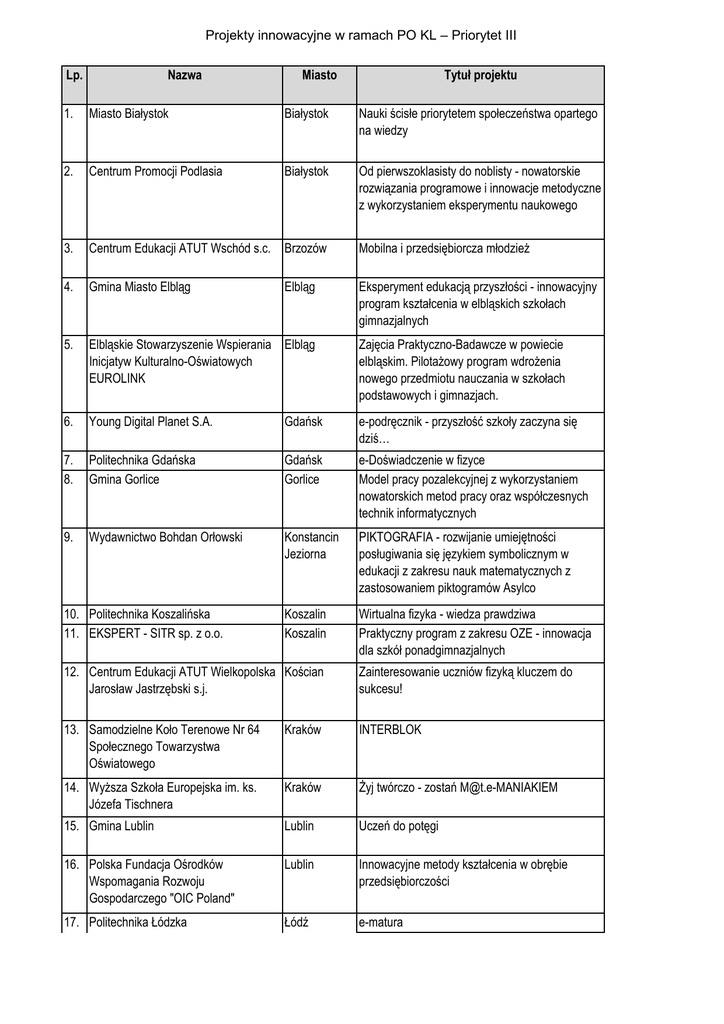 Projekty innowacyjne w ramach PO KL – Priorytet III Lp. Nazwa Miasto Tytuł projektu 1. Miasto Białystok Białystok Nauki ścisłe priorytetem społeczeństwa opartego na wiedzy 2. Centrum Promocji Podlasia Białystok Od pierwszoklasisty do noblisty - nowatorskie rozwiązania programowe i innowacje metodyczne z wykorzystaniem eksperymentu naukowego 3. Centrum Edukacji ATUT Wschód s.c. Brzozów Mobilna i przedsiębiorcza młodzieŜ 4. Gmina Miasto Elbląg Elbląg Eksperyment edukacją przyszłości - innowacyjny program kształcenia w elbląskich szkołach gimnazjalnych 5. Elbląskie Stowarzyszenie Wspierania Elbląg Inicjatyw Kulturalno-Oświatowych EUROLINK Zajęcia Praktyczno-Badawcze w powiecie elbląskim. PilotaŜowy program wdroŜenia nowego przedmiotu nauczania w szkołach podstawowych i gimnazjach. 6. Young Digital Planet S.A. Gdańsk e-podręcznik - przyszłość szkoły zaczyna się dziś… 7. 8. Politechnika Gdańska Gmina Gorlice Gdańsk Gorlice e-Doświadczenie w fizyce Model pracy pozalekcyjnej z wykorzystaniem nowatorskich metod pracy oraz współczesnych technik informatycznych 9. Wydawnictwo Bohdan Orłowski Konstancin Jeziorna PIKTOGRAFIA - rozwijanie umiejętności posługiwania się językiem symbolicznym w edukacji z zakresu nauk matematycznych z zastosowaniem piktogramów Asylco Koszalin Koszalin Wirtualna fizyka - wiedza prawdziwa Praktyczny program z zakresu OZE - innowacja dla szkół ponadgimnazjalnych 10. Politechnika Koszalińska 11. EKSPERT - SITR sp. z o.o. 12. Centrum Edukacji ATUT Wielkopolska Kościan Jarosław Jastrzębski s.j. Zainteresowanie uczniów fizyką kluczem do sukcesu! 13. Samodzielne Koło Terenowe Nr 64 Społecznego Towarzystwa Oświatowego Kraków INTERBLOK 14. WyŜsza Szkoła Europejska im. ks. Józefa Tischnera Kraków śyj twórczo - zostań [email protected] 15. Gmina Lublin Lublin Uczeń do potęgi 16. Polska Fundacja Ośrodków Wspomagania Rozwoju Gospodarczego "OIC Poland" Lublin Innowacyjne metody kształcenia w obrębie przedsiębiorczości 17. Politechnika Łódzka Łódź e-matura Projekty innowacyjne w ramach PO KL – Priorytet III 18. Firma Edukacyjno-Wydawnicza ELITMAT Dariusz Kulma Mińsk Mazowiecki Matematyka innego wymiaru - organizacja Matematycznych Mistrzostw Polski Dzieci i ModzieŜy 19. WyŜsza Szkoła Logistyki 20. Uniwersytet Adama Mickiewicza Poznań Poznań Wirtualne laboratoria - sukces innowacji E-nauczyciel przyrody. Zintegrowane środowisko edukacyjne dla rozwijania myślenia naukowego, umiejętności informacyjnych oraz kompetencji językowych uczniów II i III etapu edukacyjnego 21. Fundacja Wolnego i Otwartego Oprogramowania Poznań Strategia Wolnych i Otwartych Implementacji jako innowacyjny model zainteresowania kierunkami informatyczno-technicznymi oraz wspierania uczniów i uczennic w kształtowaniu kompetencji kluczowych 22. Politechnika Radomska Radom Uczniowie poznają chemię poprzez jej zastosowanie, rozwiązywanie problemów oraz wizualizację 23. WyŜsza Szkoła Informatyki i Zarządzania Rzeszów Przedsiębiorcze szkoły 24. Akademia Podlaska Siedlce 25. Samorząd Województwa Podlaskiego Suwałki Chemia - wiem, umiem, rozumiem ICT w nauczaniu przedmiotów matematycznych i przyrodniczych w gimnazjach 26. Zachodniopomorska Szkoła Biznesu Szczecin Uczestnik społeczeństwa wiedzy - zintegrowany system kształcenia przedsiębiorczości w szkołach ponadgimnazjalnych 27. Wojewódzki Zakład Doskonalenia Zawodowego Szczecin Era Entera - e-learning dla młodzieŜy 28. Nowa Era Sp. z o.o. 29. Kuratorium Oświaty w Warszawie Warszawa Warszawa Krok w przedsiębiorczość Szukając Einsteina - Akademia Umysłów Ścisłych 30. Fundacja MłodzieŜowej Przedsiębiorczości Warszawa Szkoła praktycznej ekonomii - MłodzieŜowe Miniprzedsiębiorstwo 31. Towarzystwo Produkcyjno - Handlowe Warszawa Sp. z o.o. Ekonomia i finanse - innowacyjny moduł programowy dla przedmiotu podstawy przedsiebiorczości 32. Politechnika Warszawska 33. ECORYS Polska Sp. z o.o. Archipelag matematyki Rozwój zainteresowań uczniów gimnazjum drogą do kariery Warszawa Warszawa 34. Wydawnictwa Szkolne PWN Sp. z o.o. Warszawa Matematyka z pasją Projekty innowacyjne w ramach PO KL – Priorytet III 35. Instytut Geofizyki PAN Warszawa Podnoszenie kompetencji uczniowskich w dziedzinie nauk matematyczno-przyrodniczych i technicznych z wykorzystaniem innowacyjnych metod i technologii EDUSCIENCE. 36. Fundacja MłodzieŜowej Warszawa Przedsiębiorczości Junior Achivement Foundation Zostać przedsiębiorczym - program edukacyjny z multimedialnym pakietem dydaktycznym dla gimnazjum. 37. Fundacja Edukacji Międzynarodowej Wrocław Szlifowanie diamentów - innowacyjne programy wsparcia uczniów uzdolnionych w zakresie nauk matematycznych i przyrodniczych 38. Ogólnopolska Fundacja Edukacji Komputerowej Wrocław Kolegium Śniadeckich - innowacyjny program nauczania przedmiotów przyrodniczych 39. Dobre Kadry. Centrum badawczo szkoleniowe sp. z o.o. Wrocław Projekt EKOLOGIA - innowacyjny, interdyscyplinarny program nauczania przedmiotów matematyczno-przyrodniczych metodą projektu 40. pwn.pl sp. z o.o. Wrocław Być przedsiębiorczym - nauka przez działanie, innowacyjny program nauczania przedsiębiorczości w szkołach ponadgimnazjalnych
