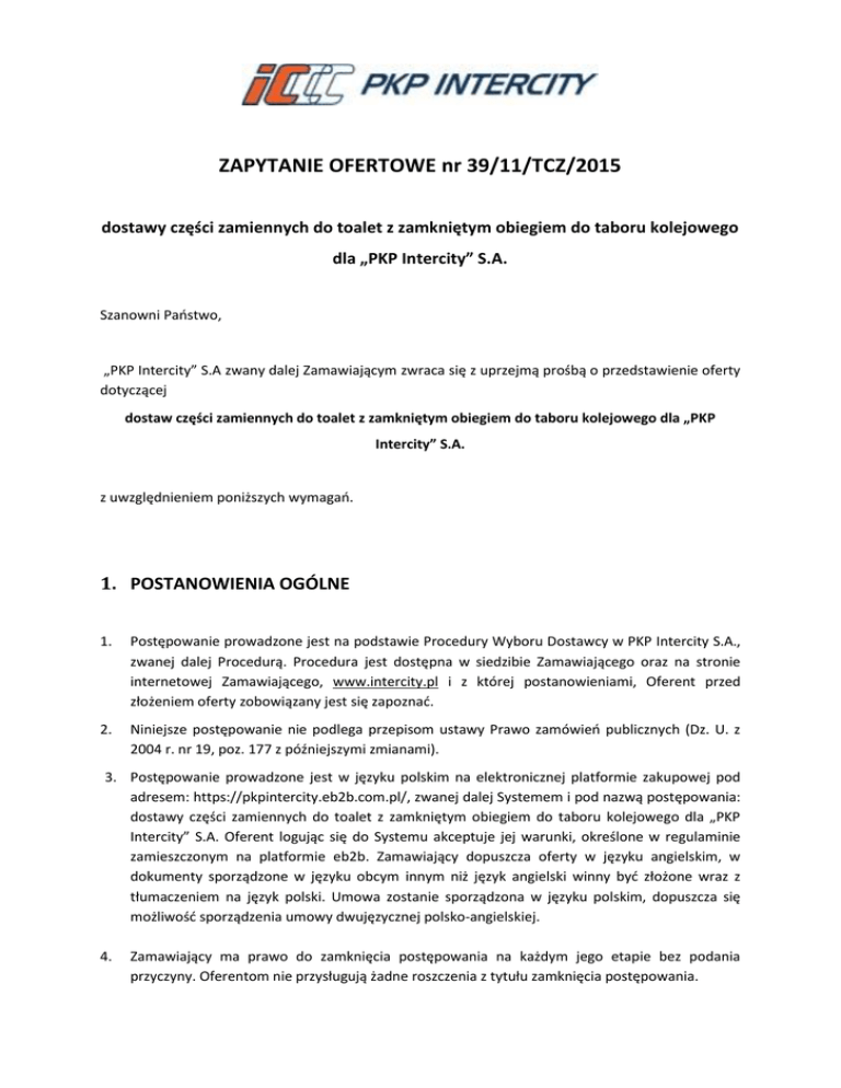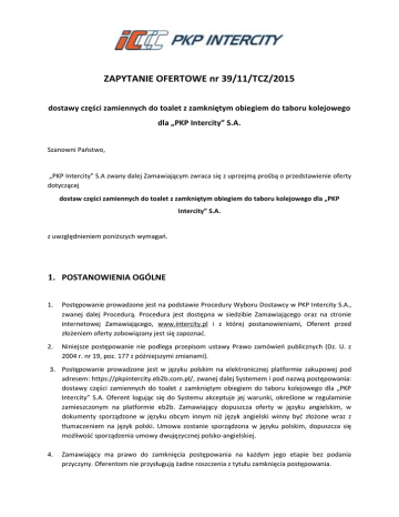 ZAPYTANIE OFERTOWE nr 39/11/TCZ/2015 dostawy części zamiennych do toalet z zamkniętym obiegiem do taboru kolejowego dla „PKP Intercity” S.A. Szanowni Państwo, „PKP Intercity” S.A zwany dalej Zamawiającym zwraca się z uprzejmą prośbą o przedstawienie oferty dotyczącej dostaw części zamiennych do toalet z zamkniętym obiegiem do taboru kolejowego dla „PKP Intercity” S.A. z uwzględnieniem poniższych wymagań. 1. POSTANOWIENIA OGÓLNE 1. Postępowanie prowadzone jest na podstawie Procedury Wyboru Dostawcy w PKP Intercity S.A., zwanej dalej Procedurą. Procedura jest dostępna w siedzibie Zamawiającego oraz na stronie internetowej Zamawiającego, www.intercity.pl i z której postanowieniami, Oferent przed złożeniem oferty zobowiązany jest się zapoznać. 2. Niniejsze postępowanie nie podlega przepisom ustawy Prawo zamówień publicznych (Dz. U. z 2004 r. nr 19, poz. 177 z późniejszymi zmianami). 3. Postępowanie prowadzone jest w języku polskim na elektronicznej platformie zakupowej pod adresem: https://pkpintercity.eb2b.com.pl/, zwanej dalej Systemem i pod nazwą postępowania: dostawy części zamiennych do toalet z zamkniętym obiegiem do taboru kolejowego dla „PKP Intercity” S.A. Oferent logując się do Systemu akceptuje jej warunki, określone w regulaminie zamieszczonym na platformie eb2b. Zamawiający dopuszcza oferty w języku angielskim, w dokumenty sporządzone w języku obcym innym niż język angielski winny być złożone wraz z tłumaczeniem na język polski. Umowa zostanie sporządzona w języku polskim, dopuszcza się możliwość sporządzenia umowy dwujęzycznej polsko-angielskiej. 4. Zamawiający ma prawo do zamknięcia postępowania na każdym jego etapie bez podania przyczyny. Oferentom nie przysługują żadne roszczenia z tytułu zamknięcia postępowania. 5. Zamawiający zastrzega sobie możliwość dokonania zmian lub odwołania warunków zawartych w niniejszym zapytaniu ofertowym. W przypadku wprowadzenia zmian Zamawiający przekaże informację o zmianach wszystkim Oferentom zaproszonym do złożenia oferty. Każda zmiana staje się wiążąca od chwili przekazania informacji o jej dokonaniu. 6. Warunki wyboru ofert określone niniejszym zapytaniem nie mogą być zmienione przez Oferenta pod rygorem odrzucenia oferty. 7. Oferent, którego oferta zostanie wybrana, jest zobowiązany do uwzględnienia niniejszych warunków w umowie o wykonanie przedmiotu zamówienia pod rygorem unieważnienia wyboru. 8. O udzielenie zamówienia Oferenci mogą się ubiegać wspólnie. Wspólnie ubiegający się o udzielenie zamówienia Oferenci ustanawiają pełnomocnika do reprezentowania ich w postępowaniu, albo reprezentowania w postępowaniu i zawarcia umowy. Treść pełnomocnictwa musi jednoznacznie wskazywać czynności, do wykonywania których pełnomocnik jest upoważniony (zakres umocowania). Do Oferentów wspólnie ubiegających się o udzielenie zamówienia stosuje się odpowiednio postanowienia dotyczące Oferenta. 9. 2. SPECYFIKACJA PRZEDMIOTU MERYTORYCZNE I HANDLOWE 1. 2. POSTĘPOWANIA oraz WYMAGANIA Przedmiotem zamówienia jest zawarcie umowy ramowej na dostawę części zamiennych do toalet z zamkniętym obiegiem do taboru kolejowego dla „PKP Intercity” S.A. Zamawiający dopuszcza składanie ofert częściowych. Wykonawca może złożyć ofertę na wszystkie części/zadania zamówienia. 3. Szczegółowe informacje dotyczące przedmiotu zamówienia zostały określone w Załączniku nr 1 do niniejszego zapytania ofertowego . 4. Zamawiający wymaga realizacji przedmiotu zamówienia na warunkach szczegółowo określonych w projekcie umowy stanowiącym Załącznik nr 4 do niniejszego zapytania ofertowego. 3. MIEJSCE I TERMIN WYKONANIA REALIZACJI DOSTAW 1. Termin realizacji zamówienia ustanawia się od dnia zawarcia umowy ramowej przez okres 12 miesięcy. 2. Realizacja poszczególnych dostaw na bazie zamówień cząstkowych odbywać się będzie cyklicznie wg potrzeb Zamawiającego. 3. Miejsce dostaw: wg. załącznika nr 3 do umowy ramowej. 4. Minimum logistyczne dla jednej dostawy do każdego magazynu, określonego w załączniku nr 2 do umowy ramowej, wynosi 500,00 zł netto. 5. Wymagany termin dostawy zostanie określony dla każdej pozycji asortymentowej odrębnie, po zakończeniu etapu I postępowania. 6. Zamawiający przewiduje możliwość przedłużenia terminu realizacji umowy do 6 miesięcy lub do wyczerpania przed tym okresem maksymalnej kwoty przeznaczonej na realizację zamówienia, pod warunkiem nie wyczerpania tej kwoty w podstawowym okresie obowiązywania umowy określonym w zapytaniu ofertowym. 2 / 20 7. Dostawa nastąpi na koszt i ryzyko Oferenta. 4. WARUNKI PŁATNOŚCI 1. „PKP Intercity” S.A. nie przewiduje możliwości udzielenia zaliczki na poczet realizacji przedmiotu niniejszego zapytania. 2. Wykonawca będzie mógł wystawić faktury po podpisaniu przez obie Strony protokołu odbioru dostawy. 3. Wynagrodzenie za wykonanie prac będzie płatne na podstawie faktury, wystawionej zgodnie z obowiązującymi przepisami, przelewem na rachunek bankowy Wykonawcy, w terminie 30 dni od daty dostarczenia prawidłowo wystawionej faktury do Zamawiającego. 4. Za dzień zapłaty uznaje się dzień obciążenia rachunku bankowego Zamawiającego. 5. WYMAGANIA FORMALNE 1. O udzielenie zamówienia mogą ubiegać się Oferenci, którzy spełniają poniższe warunki: 2. a) posiadają uprawnienia do wykonywania określonej działalności lub czynności; b) posiadają wiedzę i doświadczenie niezbędne do wykonania zamówienia, tj. Zamawiający wymaga, aby Oferent wykazał, że w okresie ostatnich 3 lat przed upływem terminu składania ofert wstępnych, a jeżeli okres prowadzenia działalności jest krótszy - to w tym okresie, wykonał zamówienie lub zamówienia o podobnym przedmiocie do przedmiotu zamówienia, którego(-ych) łączna wartość wynosi co najmniej 100.000,00 złotych netto; c) dysponują odpowiednim pot