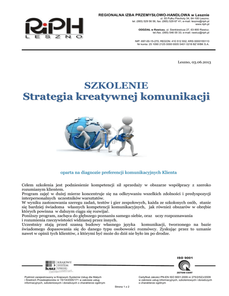 REGIONALNA IZBA PRZEMYSŁOWO-HANDLOWA w Lesznie ul. 55 Pułku Piechoty 34, 64-100 Leszno; tel. (065) 529 56 56, fax: (065) 529 67 41; e-mail: [email protected] www.riph.pl ODDZIAŁ w Rawiczu, ul. Sienkiewicza 27, 63-900 Rawicz; tel./fax. (065) 546 00 33; e-mail: [email protected] NIP: 697-00-15-270; REGON: 410 512 932; KRS 0000155113 Nr konta: 25 1090 2125 0000 0005 5401 0218 BZ WBK S.A. Leszno, 03.06.2013 SZKOLENIE Strategia kreatywnej komunikacji oparta na diagnozie preferencji komunikacyjnych Klienta Celem szkolenia jest podniesienie kompetencji sił sprzedaży w obszarze współpracy z szeroko rozumianym klientem. Program zajęć w dużej mierze koncentruje się na odkrywaniu wszelkich zdolności i predyspozycji interpersonalnych uczestników warsztatów. W wyniku zastosowania szeregu zadań, testów i gier zespołowych, każda ze szkolonych osób, stanie się bardziej świadoma własnych kompetencji komunikacyjnych, jak również obszarów w obrębie których powinna w dalszym ciągu się rozwijać. Poniższy program, zachęca do głębszego poznaniu samego siebie, oraz uczy rozpoznawania i rozumienia rzeczywistości widzianej przez innych. Uczestnicy stają przed szansą budowy własnego języka komunikacji, tworzonego na bazie świadomego dopasowania się do danego typu osobowości rozmówcy. Zyskując przez to uznanie nawet w opinii tych klientów, z którymi być może do dziś nie było im po drodze. ISO 9001 ZETOM-CERT Podmiot zarejestrowany w Krajowym Systemie Usług dla Małych i Średnich Przedsiębiorstw nr 15/14/2005/171 w zakresie usług informacyjnych, szkoleniowych i doradczych o charakterze ogólnym Certyfikat Jakości PN-EN ISO 9001:2009 nr 275/2/SZJ/2009 w zakresie usług informacyjnych, szkoleniowych i doradczych o charakterze ogólnym Strona 1 z 2 Program szkolenia: 1. Wprowadzenie do przedmiotu komunikacji społecznej. 2. Podstawy kreatywnej komunikacji. Empatia - podstawowym tworzywem do budowy poprawnej komunikacji. Przykłady błędnej komunikacji (problem naruszania terytorium osobistego rozmówcy). 3. Próba określenia własnego typu osobowości – test. 4. Analiza transakcyjna- test. 5. Charakterystyka i analiza podstawowych typów osobowości oraz metody ich rozpoznawania. 6. Próba budowy własnego języka komunikacji, dopasowanego do typu osobowości rozmówcy. 7. Realizacja zadań praktycznych, utrwalających zakres zdobytej wiedzy. Termin szkolenia: 26 czerwiec 2013, od godz. 9.00 do 15.00 Prowadzący: Marek Wachowski: wieloletni praktyk w obszarze budowy i zarządzania zespołami pracowników, realizacja szeregu projektów w ramach prowadzonych badań socjologicznych, tworzenie licznych projektów szkoleniowych Miejsce szkolenia: siedziba RIPH Leszno, ul. 55 Pułku Piechoty 34 Koszt szkolenia: 190,00 zł brutto od osoby dla firm członkowskich płacących miesięcznie składkę w wysokości 20,00 i 40,00 zł 170,00 zł brutto od osoby dla firm członkowskich płacących miesięcznie składkę w wysokości 60,00 i 80,00 zł 150,00 zł brutto od osoby dla firm członkowskich płacących miesięcznie składkę w wysokości 120,00 i 160,00 zł 220,00 zł brutto od osoby dla firm niezrzeszonych w Izbie Wpłaty należy dokonywać na konto nr 25 1090 2125 0000 0005 5401 0218. Zgłoszenia prosimy przesyłać faksem (65/ 529 67 41) na formularzu zgłoszeniowym dostępnym na stronie www.riph.pl do dnia 21.06.2013 r. 2/2