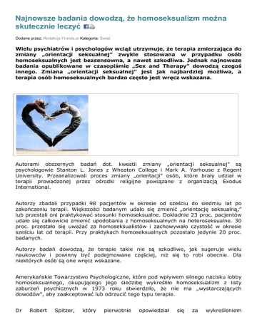Najnowsze badania dowodzą, dowodzą ą że ż homoseksualizm można możż skutecznie leczyć Dodane przez: Redakcja Fronda.pl Kategoria: Świat Wielu psychiatrów i psychologów wciąż utrzymuje, że terapia zmierzająca do zmiany „orientacji seksualnej” zwykle stosowana w przypadku osób homoseksualnych jest bezsensowna, a nawet szkodliwa. Jednak najnowsze badania opublikowane w czasopiśmie „Sex and Therapy” Therapy” dowodzą czegoś innego. Zmiana „orientacji seksualnej” jest jak najbardziej możliwa, a terapia osób homoseksualnych bardzo często jest wręcz wskazana. Autorami obszernych badań dot. kwestii zmiany „orientacji seksualnej” są psychologowie Stanton L.. Jones z Wheaton College i Mark A. Yarhouse z Regent University. Przeanalizowali proces zmiany „orientacji” osób, które brały udział w terapii prowadzonej przez ośrodki religijne powiązane z organizacją Exodus International. Autorzy zbadali przypadki 98 pacjentów w okresie od sześciu do siedmiu lat po zakończeniu terapii. Większości badanym udało się zmienić „orientację seksualną,” lub przestali oni praktykować stosunki homoseksualne. Dokładnie 23 proc. pacjentów udało się całkowicie zmienić upodobania z homoseksualnych na heteroseksualne. 30 proc. przestało się uważać za homoseksualistów i zachowywało czystość w okresie sześciu lat od terapii. Przy praktykach homoseksualnych pozostało jedynie 20 proc. badanych. Autorzy badań dowodzą, że terapie takie nie są szkodliwe, jak sugeruje wielu naukowców i powinny być podejmowane częściej, niż się to robi obecnie. Dla niektórych osób są one wręcz wskazane. Amerykańskie Towarzystwo Psychologiczne, które pod wpływem silnego nacisku lobby homoseksualnego, okupującego okupującego jego siedzibę wykreśliło homoseksualizm z listy zaburzeń psychicznych w 1973 roku stwierdziło, że nie ma „wystarczających dowodów", aby zaakceptować lub odrzucić tego typu terapie. Dr Robert Spitzer, który pierwotnie opowiedział się za wykreśleniem homoseksualizmu z listy zaburzeń psychicznych, obecnie pod wpływem własnej praktyki zmienił poglądy i zachęca do prowadzenia terapii. eMBe/LifeSiteNews