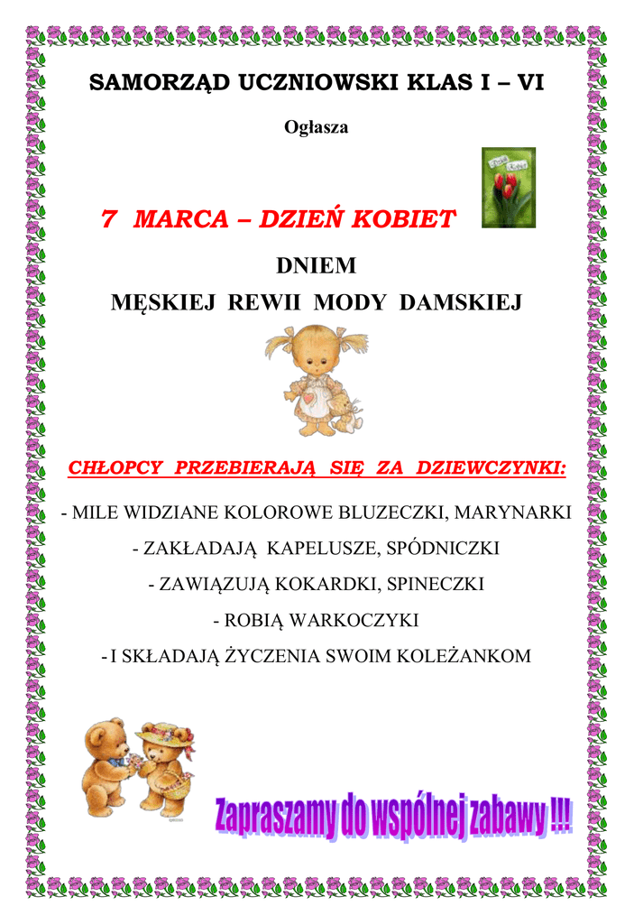 SAMORZĄD UCZNIOWSKI KLAS I – VI Ogłasza 7 MARCA – DZIEŃ KOBIET DNIEM MĘSKIEJ REWII MODY DAMSKIEJ CHŁOPCY PRZEBIERAJĄ SIĘ ZA DZIEWCZYNKI: - MILE WIDZIANE KOLOROWE BLUZECZKI, MARYNARKI - ZAKŁADAJĄ KAPELUSZE, SPÓDNICZKI - ZAWIĄZUJĄ KOKARDKI, SPINECZKI - ROBIĄ WARKOCZYKI - I SKŁADAJĄ ŻYCZENIA SWOIM KOLEŻANKOM