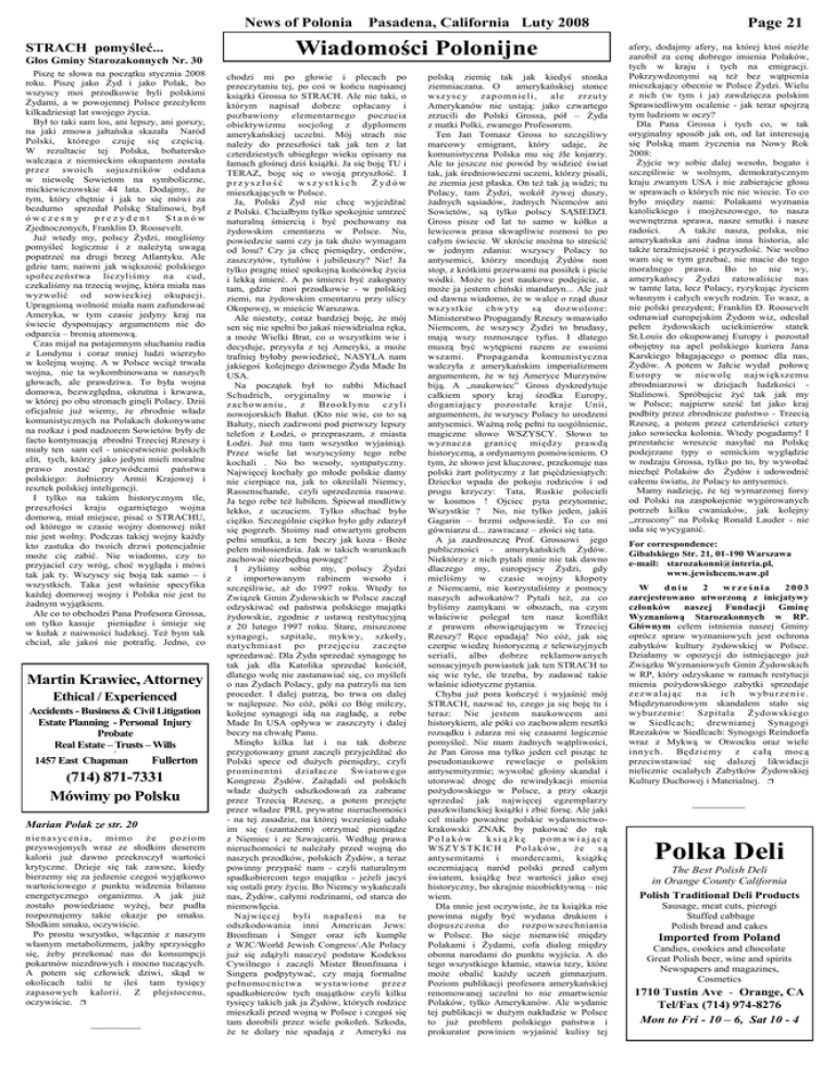 Page 21 News of Polonia Pasadena, California Luty 2008 STRACH pomyśleć... Głos Gminy Starozakonnych Nr. 30 Piszę te słowa na początku stycznia 2008 roku. Piszę jako Żyd i jako Polak, bo wszyscy moi przodkowie byli polskimi Żydami, a w powojennej Polsce przeżyłem kilkadziesiąt lat swojego życia. Był to taki sam los, ani lepszy, ani gorszy, na jaki zmowa jałtańska skazała Naród Polski, którego czuję się częścią. W rezultacie tej Polska, bohatersko walcząca z niemieckim okupantem została przez swoich sojuszników oddana w niewolę Sowietom na symboliczne, mickiewiczowskie 44 lata. Dodajmy, że tym, który chętnie i jak to się mówi za bezdurno sprzedał Polskę Stalinowi, był ówczesny prezydent Stanów Zjednoczonych, Franklin D. Roosevelt. Już wtedy my, polscy Żydzi, mogliśmy pomyśleć logicznie i z należytą uwagą popatrzeć na drugi brzeg Atlantyku. Ale gdzie tam; naiwni jak większość polskiego społeczeństwa liczyliśmy na cud, czekaliśmy na trzecią wojnę, która miała nas wyzwolić od sowieckiej okupacji. Upragnioną wolność miała nam zafundować Ameryka, w tym czasie jedyny kraj na świecie dysponujący argumentem nie do odparcia – bronią atomową. Czas mijał na potajemnym słuchaniu radia z Londynu i coraz mniej ludzi wierzyło w kolejną wojnę. A w Polsce wciąż trwała wojna, nie ta wykombinowana w naszych głowach, ale prawdziwa. To była wojna domowa, bezwzględna, okrutna i krwawa, w której po obu stronach ginęli Polacy. Dziś oficjalnie już wiemy, że zbrodnie władz komunistycznych na Polakach dokonywane na rozkaz i pod nadzorem Sowietów były de facto kontynuacją zbrodni Trzeciej Rzeszy i miały ten sam cel - unicestwienie polskich elit, tych, którzy jako jedyni mieli moralne prawo zostać przywódcami państwa polskiego: żołnierzy Armii Krajowej i resztek polskiej inteligencji. I tylko na takim historycznym tle, przeszłości kraju ogarniętego wojna domową, miał miejsce, pisać o STRACHU, od którego w czasie wojny domowej nikt nie jest wolny. Podczas takiej wojny każdy kto zastuka do twoich drzwi potencjalnie może cię zabić. Nie wiadomo, czy to przyjaciel czy wróg, choć wygląda i mówi tak jak ty. Wszyscy się boją tak samo – i wszystkich. Taka jest właśnie specyfika każdej domowej wojny i Polska nie jest tu żadnym wyjątkiem. Ale co to obchodzi Pana Profesora Grossa, on tylko kasuje pieniądze i śmieje się w kułak z naiwności ludzkiej. Też bym tak chciał, ale jakoś nie potrafię. Jedno, co Martin Krawiec, Attorney Ethical / Experienced Accidents - Business & Civil Litigation Estate Planning - Personal Injury Probate Real Estate – Trusts – Wills 2 1457 East Chapman Fullerton (714) 871-7331 Mówimy po Polsku Marian Polak ze str. 20 n i en as ycen i a, mi mo że p o zi o m przyswojonych wraz ze słodkim deserem kalorii już dawno przekroczył wartości krytyczne. Dzieje się tak zawsze, kiedy bierzemy się za jedzenie czegoś wyjątkowo wartościowego z punktu widzenia bilansu energetycznego organizmu. A jak już zostało powiedziane wyżej, bez pudła rozpoznajemy takie okazje po smaku. Słodkim smaku, oczywiście. Po prostu wszystko, włącznie z naszym własnym metabolizmem, jakby sprzysięgło się, żeby przekonać nas do konsumpcji pokarmów niezdrowych i mocno tuczących. A potem się człowiek dziwi, skąd w okolicach talii te ileś tam tysięcy zapasowych kalorii. Z plejstocenu, oczywiście. ❒ __________ Wiadomości Polonijne chodzi mi po głowie i plecach po przeczytaniu tej, po coś w końcu napisanej książki Grossa to STRACH. Ale nie taki, o którym napisał dobrze opłacany i pozbawiony elementarnego poczucia obiektywizmu socjolog z dyplomem amerykańskiej uczelni. Mój strach nie należy do przeszłości tak jak ten z lat czterdziestych ubiegłego wieku opisany na łamach głośnej dziś książki. Ja się boję TU i TERAZ, boję się o swoją przyszłość. I prz yszłość wsz ystkich Żydów mieszkających w Polsce. Ja, Polski Żyd nie chcę wyjeżdżać z Polski. Chciałbym tylko spokojnie umrzeć naturalną śmiercią i być pochowany na żydowskim cmentarzu w Polsce. Nu, powiedzcie sami czy ja tak dużo wymagam od losu? Czy ja chcę pieniędzy, orderów, zaszczytów, tytułów i jubileuszy? Nie! Ja tylko pragnę mieć spokojną końcówkę życia i lekką śmierć. A po śmierci być zakopany tam, gdzie moi przodkowie - w polskiej ziemi, na żydowskim cmentarzu przy ulicy Okopowej, w mieście Warszawa. Ale niestety, coraz bardziej boję, że mój sen się nie spełni bo jakaś niewidzialna ręka, a może Wielki Brat, co o wszystkim wie i decyduje, przysyła z tej Ameryki, a może trafniej byłoby powiedzieć, NASYŁA nam jakiegoś kolejnego dziwnego Żyda Made In USA. Na początek był to rabbi Michael Schudrich, oryginalny w mowie i zacho w aniu , z B roo klyn u cz yl i nowojorskich Bałut. (Kto nie wie, co to są Bałuty, niech zadzwoni pod pierwszy lepszy telefon z Łodzi, o przepraszam, z miasta Łodzi. Już mu tam wszystko wyjaśnią). Przez wiele lat wszyscyśmy tego rebe kochali . No bo wesoły, sympatyczny. Najwięcej kochały go młode polskie damy nie cierpiące na, jak to określali Niemcy, Rassenschande, czyli uprzedzenia rasowe. Ja tego rebe też lubiłem. Śpiewał modlitwy lekko, z uczuciem. Tylko słuchać było ciężko. Szczególnie ciężko było gdy zdarzył się pogrzeb. Stoimy nad otwartym grobem pełni smutku, a ten beczy jak koza - Boże pełen miłosierdzia. Jak w takich warunkach zachować niezbędną powagę? I żyliśmy sobie my, polscy Żydzi z importowanym rabinem wesoło i szczęśliwie, aż do 1997 roku. Wtedy to Związek Gmin Żydowskich w Polsce zaczął odzyskiwać od państwa polskiego majątki żydowskie, zgodnie z ustawą restytucyjną z 20 lutego 1997 roku. Stare, zniszczone synagogi, szpitale, mykwy, szkoły, natychmiast po przejęciu zaczęto sprzedawać. Dla Żyda sprzedać synagogę to tak jak dla Katolika sprzedać kości