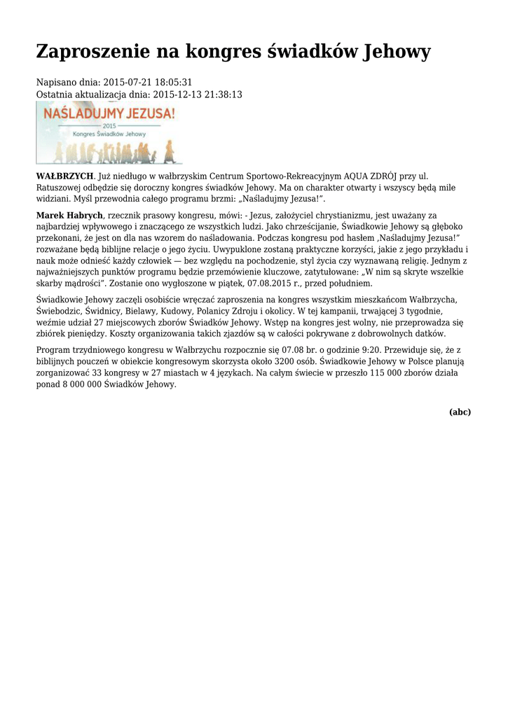 Zaproszenie na kongres świadków Jehowy Napisano dnia: 2015-07-21 18:05:31 Ostatnia aktualizacja dnia: 2015-12-13 21:38:13 WAŁBRZYCH. Już niedługo w wałbrzyskim Centrum Sportowo-Rekreacyjnym AQUA ZDRÓJ przy ul. Ratuszowej odbędzie się doroczny kongres świadków Jehowy. Ma on charakter otwarty i wszyscy będą mile widziani. Myśl przewodnia całego programu brzmi: „Naśladujmy Jezusa!”. Marek Habrych, rzecznik prasowy kongresu, mówi: - Jezus, założyciel chrystianizmu, jest uważany za najbardziej wpływowego i znaczącego ze wszystkich ludzi. Jako chrześcijanie, Świadkowie Jehowy są głęboko przekonani, że jest on dla nas wzorem do naśladowania. Podczas kongresu pod hasłem ‚Naśladujmy Jezusa!” rozważane będą biblijne relacje o jego życiu. Uwypuklone zostaną praktyczne korzyści, jakie z jego przykładu i nauk może odnieść każdy człowiek — bez względu na pochodzenie, styl życia czy wyznawaną religię. Jednym z najważniejszych punktów programu będzie przemówienie kluczowe, zatytułowane: „W nim są skryte wszelkie skarby mądrości”. Zostanie ono wygłoszone w piątek, 07.08.2015 r., przed południem. Świadkowie Jehowy zaczęli osobiście wręczać zaproszenia na kongres wszystkim mieszkańcom Wałbrzycha, Świebodzic, Świdnicy, Bielawy, Kudowy, Polanicy Zdroju i okolicy. W tej kampanii, trwającej 3 tygodnie, weźmie udział 27 miejscowych zborów Świadków Jehowy. Wstęp na kongres jest wolny, nie przeprowadza się zbiórek pieniędzy. Koszty organizowania takich zjazdów są w całości pokrywane z dobrowolnych datków. Program trzydniowego kongresu w Wałbrzychu rozpocznie się 07.08 br. o godzinie 9:20. Przewiduje się, że z biblijnych pouczeń w obiekcie kongresowym skorzysta około 3200 osób. Świadkowie Jehowy w Polsce planują zorganizować 33 kongresy w 27 miastach w 4 językach. Na całym świecie w przeszło 115 000 zborów działa ponad 8 000 000 Świadków Jehowy. (abc)