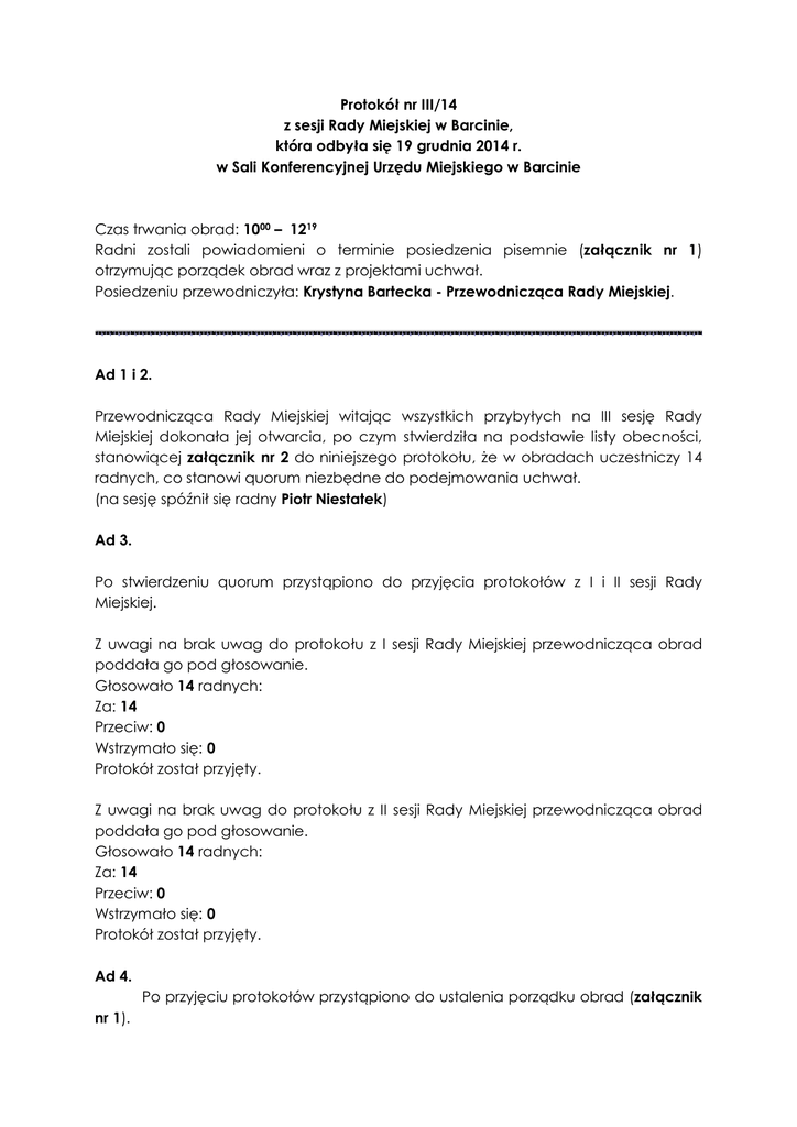 Protokół nr III/14 z sesji Rady Miejskiej w Barcinie
