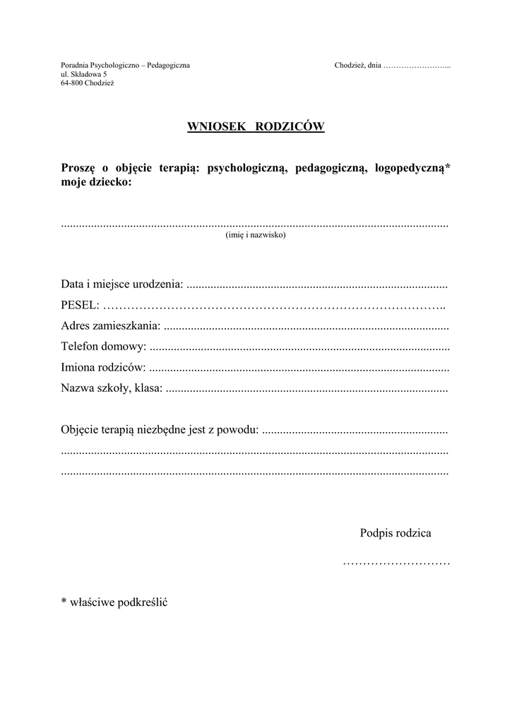 Poradnia Psychologiczno – Pedagogiczna ul. Składowa 5 64-800 Chodzież Chodzież, dnia ……………………... WNIOSEK RODZICÓW Proszę o objęcie terapią: psychologiczną, pedagogiczną, logopedyczną* moje dziecko: ................................................................................................................................. (imię i nazwisko) Data i miejsce urodzenia: ....................................................................................... PESEL: ………………………………………………………………………….. Adres zamieszkania: ............................................................................................... Telefon domowy: .................................................................................................... Imiona rodziców: .................................................................................................... Nazwa szkoły, klasa: .............................................................................................. Objęcie terapią niezbędne jest z powodu: .............................................................. ................................................................................................................................. ................................................................................................................................. Podpis rodzica ……………………… * właściwe podkreślić