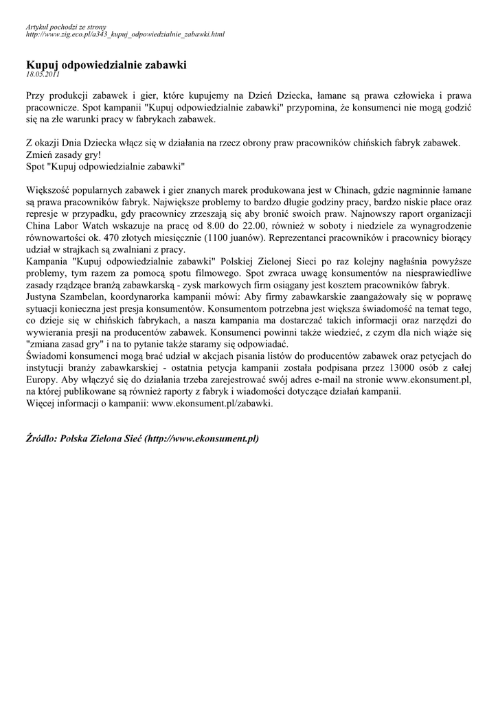Artykuł pochodzi ze strony http://www.zig.eco.pl/a343_kupuj_odpowiedzialnie_zabawki.html Kupuj odpowiedzialnie zabawki 18.05.2011 Przy produkcji zabawek i gier, które kupujemy na Dzień Dziecka, łamane są prawa człowieka i prawa pracownicze. Spot kampanii "Kupuj odpowiedzialnie zabawki" przypomina, że konsumenci nie mogą godzić się na złe warunki pracy w fabrykach zabawek. Z okazji Dnia Dziecka włącz się w działania na rzecz obrony praw pracowników chińskich fabryk zabawek. Zmień zasady gry! Spot "Kupuj odpowiedzialnie zabawki" Większość popularnych zabawek i gier znanych marek produkowana jest w Chinach, gdzie nagminnie łamane są prawa pracowników fabryk. Największe problemy to bardzo długie godziny pracy, bardzo niskie płace oraz represje w przypadku, gdy pracownicy zrzeszają się aby bronić swoich praw. Najnowszy raport organizacji China Labor Watch wskazuje na pracę od 8.00 do 22.00, również w soboty i niedziele za wynagrodzenie równowartości ok. 470 złotych miesięcznie (1100 juanów). Reprezentanci pracowników i pracownicy biorący udział w strajkach są zwalniani z pracy. Kampania "Kupuj odpowiedzialnie zabawki" Polskiej Zielonej Sieci po raz kolejny nagłaśnia powyższe problemy, tym razem za pomocą spotu filmowego. Spot zwraca uwagę konsumentów na niesprawiedliwe zasady rządzące branżą zabawkarską - zysk markowych firm osiągany jest kosztem pracowników fabryk. Justyna Szambelan, koordynarorka kampanii mówi: Aby firmy zabawkarskie zaangażowały się w poprawę sytuacji konieczna jest presja konsumentów. Konsumentom potrzebna jest większa świadomość na temat tego, co dzieje się w chińskich fabrykach, a nasza kampania ma dostarczać takich informacji oraz narzędzi do wywierania presji na producentów zabawek. Konsumenci powinni także wiedzieć, z czym dla nich wiąże się "zmiana zasad gry" i na to pytanie także staramy się odpowiadać. Świadomi konsumenci mogą brać udział w akcjach pisania listów do producentów zabawek oraz petycjach do instytucji branży zabawkarskiej - ostatnia petycja kampanii została podpisana przez 13000 osób z całej Europy. Aby włączyć się do działania trzeba zarejestrować swój adres e-mail na stronie www.ekonsument.pl, na której publikowane są również raporty z fabryk i wiadomości dotyczące działań kampanii. Więcej informacji o kampanii: www.ekonsument.pl/zabawki. Źródło: Polska Zielona Sieć (http://www.ekonsument.pl)