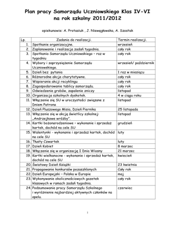 Plan pracy Samorządu Uczniowskiego Klas IV-VI na rok szkolny 2011/2012 opiekunowie: A. Protasiuk , J. Niewęgłowska, A. Szostak Lp. Zadania do realizacji. 1. Spotkanie organizacyjne. 2. Zaplanowanie i realizacja zadań tygodnia. 3. Spotkania Samorządu Uczniowskiego – raz w tygodniu 4. Wybory i zaprzysiężenie Samorządu Uczniowskiego. 5. Dzień bez pytania 6. Różnorodne akcje charytatywne. 7. Wspieranie akcji recyklingu 8. Zagospodarowanie tablicy samorządu. 9. Odwiedzenie grobów, zapalenie zniczy 10. Organizacja szkolnych dyskotek. 11. Włączenie się SU w uroczystości związane z Dniem Patrona 12. Dzień Pluszowego Misia, Dzień Piernika 13. Włączenie się w akcję świetlicy szkolnej: „Andrzejkowe wróżby”. 14. Kartki bożonarodzeniowe – wykonanie i sprzedaż kartek, dochód na cele SU 15. Walentynki - wykonanie i sprzedaż kartek, dochód na cele SU 16. Tłusty Czwartek 17. Dzień Kobiet 18. Włączenie się w organizację I Dnia Wiosny 19. Kartki wielkanocne - wykonanie i sprzedaż kartek, dochód na cele SU 20. Światowy Dzień Książki 21. Propagowanie konkursów pozaszklonych 22. Dzień Europejski – Polska w Europie 23. Wykonywanie okolicznościowych gazetek klasowych w ramach zadań tygodnia. 24. Podsumowanie pracy Samorządu Szkolnego i wyróżnienie najbardziej aktywnych członków na apelu. 1 Termin realizacji. wrzesień cały rok cały rok wrzesień/ październik 1 raz w miesiącu cały rok cały rok cały rok listopad 4 w ciągu roku listopad 25 listopada listopad grudzień luty luty 8 marzec 21 marzec kwiecień 23 kwietnia Cały rok maj cały rok czerwiec