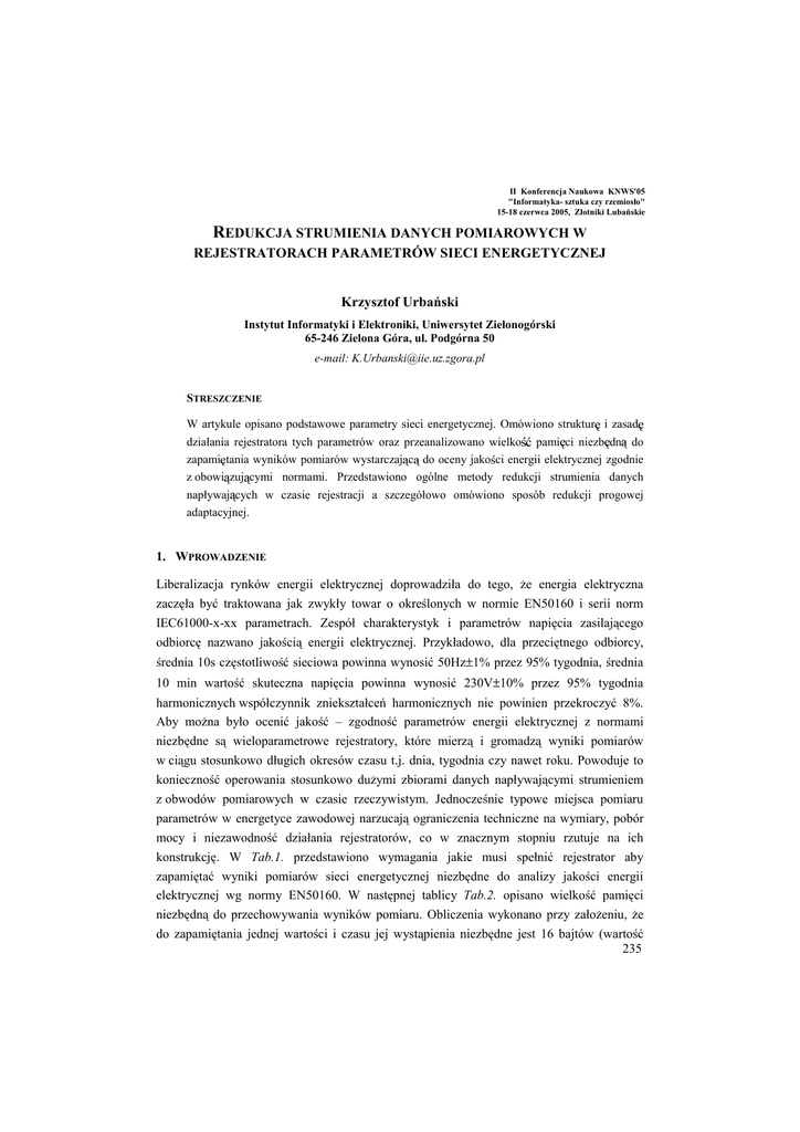 II Konferencja Naukowa KNWS'05 "Informatyka- sztuka czy rzemiosáo" 15-18 czerwca 2005, Záotniki LubaĔskie REDUKCJA STRUMIENIA DANYCH POMIAROWYCH W REJESTRATORACH PARAMETRÓW SIECI ENERGETYCZNEJ Krzysztof Urbański Instytut Informatyki i Elektroniki, Uniwersytet Zielonogórski 65-246 Zielona Góra, ul. Podgórna 50 e-mail: [email protected] STRESZCZENIE W artykule opisano podstawowe parametry sieci energetycznej. Omówiono struktur i zasad działania rejestratora tych parametrów oraz przeanalizowano wielko pami ci niezb dn do zapami tania wyników pomiarów wystarczaj c do oceny jako ci energii elektrycznej zgodnie z obowi zuj cymi normami. Przedstawiono ogólne metody redukcji strumienia danych napływaj cych w czasie rejestracji a szczegółowo omówiono sposób redukcji progowej adaptacyjnej. 1. WPROWADZENIE Liberalizacja rynków energii elektrycznej doprowadziła do tego, że energia elektryczna zaczęła być traktowana jak zwykły towar o określonych w normie EN50160 i serii norm IEC61000-x-xx parametrach. Zespół charakterystyk i parametrów napięcia zasilającego odbiorcę nazwano jakością energii elektrycznej. Przykładowo, dla przeciętnego odbiorcy, średnia 10s częstotliwość sieciowa powinna wynosić 50Hz±1% przez 95% tygodnia, średnia 10 min wartość skuteczna napięcia powinna wynosić 230V±10% przez 95% tygodnia harmonicznych współczynnik zniekształceń harmonicznych nie powinien przekroczyć 8%. Aby można było ocenić jakość – zgodność parametrów energii elektrycznej z normami niezbędne są wieloparametrowe rejestratory, które mierzą i gromadzą wyniki pomiarów w ciągu stosunkowo długich okresów czasu t.j. dnia, tygodnia czy nawet roku. Powoduje to konieczność operowania stosunkowo dużymi zbiorami danych napływającymi strumieniem z obwodów pomiarowych w czasie rzeczywistym. Jednocześnie typowe miejsca pomiaru parametrów w energetyce zawodowej narzucają ograniczenia techniczne na wymiary, pobór mocy i niezawodność działania rejestratorów, co w znacznym stopniu rzutuje na ich konstrukcję. W Tab.1. przedstawiono wymagania jakie musi spełnić rejestrator aby zapamiętać wyniki pomiarów sieci energetycznej niezbędne do analizy jakości energii elektrycznej wg normy EN50160. W następnej tablicy Tab.2. opisano wielkość pamięci niezbędną do przechowywania wyników pomiaru. Obliczenia wykonano przy założeniu, że do zapamiętania jednej wartości i czasu jej wystąpienia niezbędne jest 16 bajtów (wartość 235 w formacie zmiennoprzecinkowym, czas i data z rozdzielczością 1ms, kod identyfikujący wielkość mierzoną) a rejestracja odbywa się dla sieci trójfazowej. Tab.1. Liczba wyników pomiarów przy rejestracji wg. EN50160 Parametr Zmiany cz stotliwo ci Zakres / tolerancja Czas u redniania 50Hz ± 1% 10 s tydzie Liczba danych w Okres obserwacji okresie obserwacji 60.480 wyników 50Hz +4%/-6% 10 s tydzie Wolne zmiany napi cia UN ± 10% 10 min tydzie Szybkie zmiany napi cia UN ± 5% 10 ms dzie - Plt≤ 1 2h tydzie 252 wyniki Fluktuacje napi cia - flicker Zapady napi cia 3.024 wyników (1% - 90%) UN 10ms..1s 10 ms rok 3.000 wyników Krótkie przerwy w zasilaniu <1% UN przez < 3min 10 ms rok 300 wyników Długie przerwy w zasilaniu <1% UN przez > 3min 10 ms rok 150 wyników Przepi cia < 200% UN (<1.5kV) 10 ms - - < 6 kV - - - < 2% 10 min tydzie 2.016 wyników Przepi cia „szpilkowe” Asymetria THD THD < 8% 10 min tydzie 3.024 wyników Harmoniczne 0,5...5% 10 min tydzie 75.600 wyników Interharmoniczne 0,5...5% 10 min tydzie 75.600 wyników < 9% 3s dzie 604.800 wyników Napi cie sygnałowe UN – znamionowe napi cie skuteczne sieci energetycznej Tab.2. Minimalna wielko Kryterium pami ci niezb dna przy rejestracji wg. EN50160 Liczba danych w okresie obserwacji Niezb dna wielko pami ci Zmiany cz stotliwo ci 60.480 wyników 1 MB Wolne zmiany napi cia 3.024 wyników 0,05 MB 252 wyniki 0,004 MB Fluktuacje napi cia - flicker Zapady napi cia Krótkie przerwy w zasilaniu Długie przerwy w zasilaniu 3.000 wyników 0,05 MB 300 wyników 0,005 MB 150 wyników 0,002 MB Asymetria 2.016 wyników 0,032 MB THD 3.024 wyników 0,05 MB Harmoniczne 75.600 wyników 1,21 MB Interharmoniczne 75.600 wyników 1,21 MB Napi cie sygnałowe 604.800 wyników RAZEM 9,68 MB 13.29 MB Z wyników obliczeń zaprezentowanych w tablicach wynika, że minimalna wielkość pamięci dla zapamiętania niezbędnych parametrów wynosi około 13 MB na komplet danych w ciągu 1 tygodnia rejestracji. Przy czym określenie „minimalna” zakłada, że jest to wystarczająca liczba danych do sprawdzenia zgodności ze standardami, ale zbyt mała do analizy przyczyn 236 zakłóceń. W praktyce danych tych musi być kilkakrotnie więcej zwłaszcza, że analizy wykonuje się porównując wyniki z poszczególnych tygodni, które trzeba pamiętać. Duża liczba danych a także środki transmisji za pomocą których są pozyskiwane z punktów pomiarowych (modemy) wymuszają potrzebę minimalizacji liczby danych przy ograniczeniu strat najbardziej istotnych informacji. 2. STRUKTURA REJESTRATORA DO POMIARU PARAMETRÓW SIECI ENERGETYCZNEJ Struktura rejestratora do pomiaru parametrów sieci energetycznej przedstawiona jest na Rys.1. Napięcie i prąd sieci trójfazowej, po znormalizowaniu wartości w układach wejściowych doprowadzone są do przetworników A/C, a następnie do procesora DSP (Slave). Procesor ten na podstawie próbek wylicza chwilowe (20ms) wartości parametrów sieci energetycznej takich jak: wartość skuteczna napięcia i prądu, częstotliwość sieci, moc czynną, bierną i pozorną, kąty przesunięcia fazowego, harmoniczne i interharmoniczne, napięcie sygnałowe, flicker. Wartości te przesyłane są do procesora głównego (Master), który zależnie od założonego algorytmu pracy porównuje je z progami redukcji lub uśrednia w określonym czasie. Wyniki wraz z czasem pomiaru gromadzone są w buforze pamięci RAM, skąd po wykonaniu kompresji cyfrow