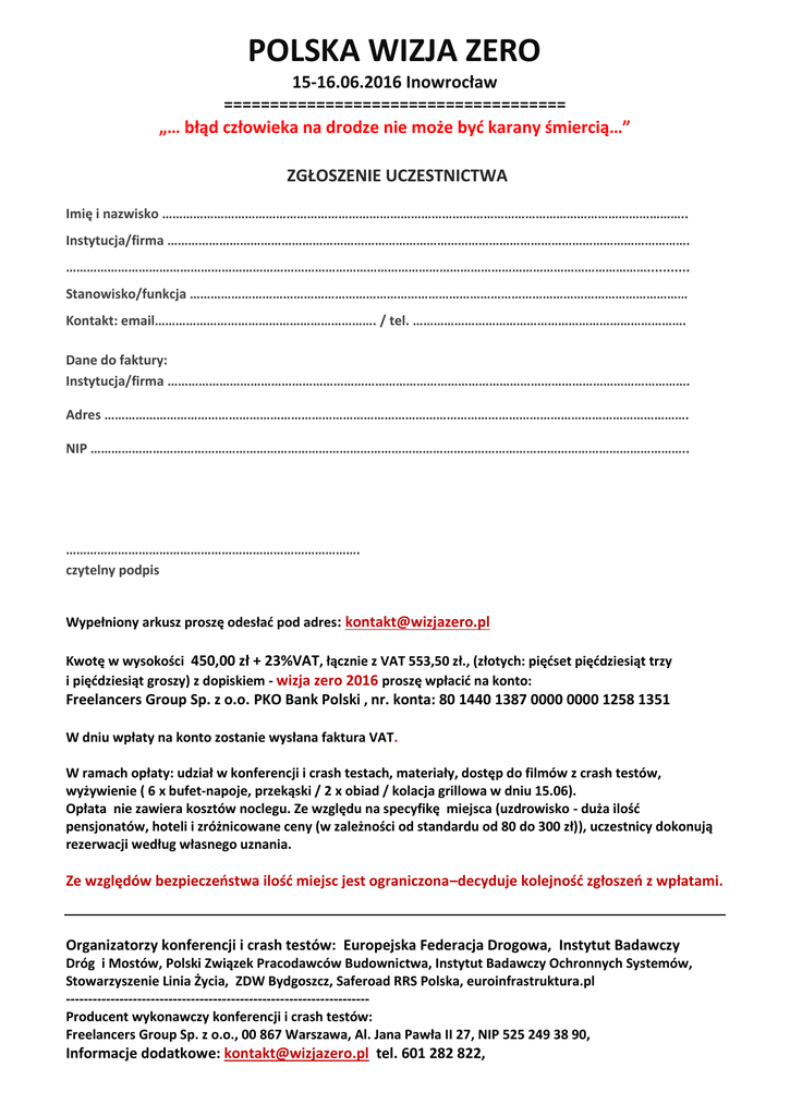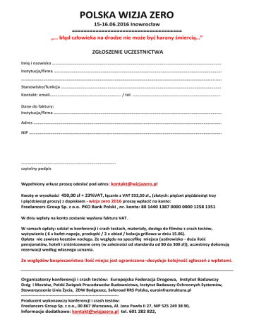 POLSKA WIZJA ZERO 15-16.06.2016 Inowrocław ===================================== „… błąd człowieka na drodze nie może być karany śmiercią…” ZGŁOSZENIE UCZESTNICTWA Imię i nazwisko …………………………………………………………………………………………………………………………………….. Instytucja/firma ……………………………………………………………………………………………………………………………………. ……………………………………………………………………………………………………………………………………………………........... Stanowisko/funkcja ……………………………………………………………………………………………………………………………… Kontakt: email………………………………………………………. / tel. ……………………………………………………………………. Dane do faktury: Instytucja/firma ……………………………………………………………………………………………………………………………………. Adres ……………………………………………………………………………………………………………………………………………………. NIP ……………………………………………………………………………………………………………………………………………………….. …………………………………………………………………………. czytelny podpis Wypełniony arkusz proszę odesłać pod adres: [email protected] Kwotę w wysokości 450,00 zł + 23%VAT, łącznie z VAT 553,50 zł., (złotych: pięćset pięćdziesiąt trzy i pięćdziesiąt groszy) z dopiskiem - wizja zero 2016 proszę wpłacić na konto: Freelancers Group Sp. z o.o. PKO Bank Polski , nr. konta: 80 1440 1387 0000 0000 1258 1351 W dniu wpłaty na konto zostanie wysłana faktura VAT. W ramach opłaty: udział w konferencji i crash testach, materiały, dostęp do filmów z crash testów, wyżywienie ( 6 x bufet-napoje, przekąski / 2 x obiad / kolacja grillowa w dniu 15.06). Opłata nie zawiera kosztów noclegu. Ze względu na specyfikę miejsca (uzdrowisko - duża ilość pensjonatów, hoteli i zróżnicowane ceny (w zależności od standardu od 80 do 300 zł)), uczestnicy dokonują rezerwacji według własnego uznania. Ze względów bezpieczeństwa ilość miejsc jest ograniczona–decyduje kolejność zgłoszeń z wpłatami. Organizatorzy konferencji i crash testów: Europejska Federacja Drogowa, Instytut Badawczy Dróg i Mostów, Polski Związek Pracodawców Budownictwa, Instytut Badawczy Ochronnych Systemów, Stowarzyszenie Linia Życia, ZDW Bydgoszcz, Saferoad RRS Polska, euroinfrastruktura.pl -------------------------------------------------------------------Producent wykonawczy konferencji i crash testów: Freelancers Group Sp. z o.o., 00 867 Warszawa, Al. Jana Pawła II 27, NIP 525 249 38 90, Informacje dodatkowe: [email protected] tel. 601 282 822,