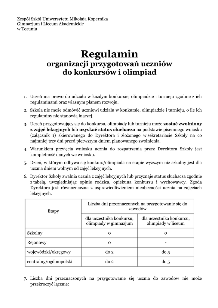Zespół Szkół Uniwersytetu Mikołaja Kopernika Gimnazjum i Liceum Akademickie w Toruniu Regulamin organizacji przygotowań uczniów do konkursów i olimpiad 1. Uczeń ma prawo do udziału w każdym konkursie, olimpiadzie i turnieju zgodnie z ich regulaminami oraz własnym planem rozwoju. 2. Szkoła nie może odmówić uczniowi udziału w konkursie, olimpiadzie i turnieju, o ile ich regulaminy nie stanowią inaczej. 3. Uczeń przygotowujący się do konkursu, olimpiady lub turnieju może zostać zwolniony z zajęć lekcyjnych lub uzyskać status słuchacza na podstawie pisemnego wniosku (załącznik 1) skierowanego do Dyrektora i złożonego w sekretariacie Szkoły na co najmniej trzy dni przed pierwszym dniem planowanego zwolnienia. 4. Warunkiem przyjęcia wniosku ucznia do rozpatrzenia przez Dyrektora Szkoły jest kompletność danych we wniosku. 5. Dzień, w którym odbywa się konkurs/olimpiada na etapie wyższym niż szkolny jest dla ucznia dniem wolnym od zajęć lekcyjnych. 6. Dyrektor Szkoły zwalnia ucznia z zajęć lekcyjnych lub przyznaje status słuchacza zgodnie z tabelą, uwzględniając opinie rodzica, opiekuna konkursu i wychowawcy. Zgoda Dyrektora jest równoznaczna z usprawiedliwieniem nieobecności ucznia na zajęciach lekcyjnych. Etapy Liczba dni przeznaczonych na przygotowanie się do zawodów dla uczestnika konkursu, olimpiady w gimnazjum dla uczestnika konkursu, olimpiady w liceum Szkolny 0 0 Rejonowy 0 - wojewódzki/okręgowy do 2 do 5 centralny/ogólnopolski do 2 do 5 7. Liczba dni przeznaczonych na przygotowanie się ucznia do zawodów nie może przekroczyć łącznie: a) dla uczestnika konkursu, olimpiady w gimnazjum – 6 dni, b) dla uczestnika konkursu, olimpiady w liceum – 15 dni. 8. Wychowawca ucznia odnotowuje fakt zwolnienia w dzienniku zajęć lekcyjnych wpisując: „zwolniony/a”, w przypadku ucznia – słuchacza: „słuchacz”. 9. Nieobecność ucznia na lekcjach, związana z udziałem w konkursie, olimpiadzie lub turnieju, nie jest liczona do frekwencji. Wychowawca ucznia odnotowuje ten fakt w dzienniku zajęć lekcyjnych wpisując „konkurs” lub „olimpiada”. 10. Uczeń, który uzyskał status słuchacza, jest zwolniony z odpowiedzi ustnych i prac pisemnych oraz prac domowych we wskazanych dniach. 11. Uczeń zwolniony z zajęć i uczeń – słuchacz mają obowiązek ustalić z właściwymi nauczycielami przedmiotów treści Podstawy programowej, które powinni opanować i zaliczyć w ustalonym czasie. 12. W szczególnych i uzasadnionych przypadkach (np. kilka konkursów, olimpiad) uczeń może wystąpić z pisemną prośbą (załącznik 2) do Dyrektora Szkoły o wydłużenie czasu na przygotowanie się do konkursu lub olimpiady. 13. Kwestie sporne rozstrzyga Dyrektor Szkoły w porozumieniu z nauczycielem przedmiotu, opiekunem konkursu, wychowawcą i zainteresowanym uczniem. Niniejszy Regulamin został opracowany przez Zespół ds. Prawa Wewnątrzszkolnego w składzie: pani Bożena Staszkiewicz i pani Anna Zaklikiewicz, zatwierdzony przez Dyrektora Szkoły oraz Radę Pedagogiczną i wchodzi w życie z dniem 26 listopada 2010r. Załącznik 1 do Regulaminu organizacji przygotowań uczniów do konkursów i olimpiad ………………………………………………… ………… Imię i nazwisko ucznia Klasa Toruń, dnia ………………………… ………………………………………………… Opiekun konkursu/olimpiady ………………………………………………… Wychowawca klasy Dyrektor ZS UMK Gimnazjum i Liceum Akademickie Zwracam się z uprzejmą prośbą (podkreśl właściwe): a) o zwolnienie z zajęć lekcyjnych b) o przyznanie mi statusu słuchacza w dniach ……………………………………………, w związku z moim udziałem w etapie …………………… konkursu/olimpiady ………………………………………………………………………………………………………... który odbędzie się dnia …………………………………………………………………………………………………….. Zobowiązuję się do opanowania treści Podstawy programowej z poszczególnych przedmiotów zgodnie z ustaleniami nauczycieli. …………………………………………… …………………………………………… podpis ucznia podpis opiekuna …………………………………………… …………………………………………… podpis rodzica podpis wychowawcy Wyrażam zgodę/Nie wyrażam zgody Dyrektor Szkoły …………………………………… Załącznik 2 do Regulaminu organizacji przygotowań uczniów do konkursów i olimpiad ………………………………………………… ………… Imię i nazwisko ucznia Klasa Toruń, dnia ………………………… ………………………………………………… Opiekun konkursu/olimpiady ………………………………………………… Wychowawca klasy Dyrektor ZS UMK Gimnazjum i Liceum Akademickie Zwracam się z uprzejmą prośbą (podkreśl właściwe): c) o zwolnienie z zajęć lekcyjnych d) o przyznanie mi statusu słuchacza w dniach ……………………………………………… w związku z moim udziałem w …………………………… ………………………………………………………………………………………………………………………………………… Uzasadnienie prośby: ………………………………………………………………………………………………………………………………………… ………………………………………………………………………………………………………………………………………… ………………………………………………………………………………………………………………………………………… …………………………………