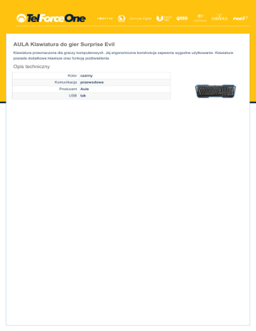 AULA Klawiatura do gier Surprise Evil Klawiatura przeznaczona dla graczy komputerowych. Jej ergonomiczna konstrukcja zapewnia wygodne użytkowanie. Klawiatura posiada dodatkowe klawisze oraz funkcję podświetlenia. Opis techniczny Kolor czarny Komunikacja przewodowa Producent Aula USB tak