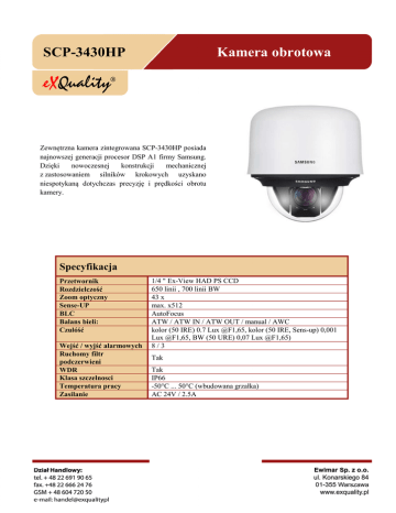 SCP-3430HP Kamera obrotowa Zewnętrzna kamera zintegrowana SCP-3430HP posiada najnowszej generacji procesor DSP A1 firmy Samsung. Dzięki nowoczesnej konstrukcji mechanicznej z zastosowaniem silników krokowych uzyskano niespotykaną dotychczas precyzję i prędkości obrotu kamery. Specyfikacja Przetwornik Rozdzielczość Zoom optyczny Sense-UP BLC Balans bieli: Czułóść Wejść / wyjść alarmowych Ruchomy filtr podczerwieni WDR Klasa szczelnosci Temperatura pracy Zasilanie 1/4 " Ex-View HAD PS CCD 650 linii , 700 linii BW 43 x max. x512 AutoFocus ATW / ATW IN / ATW OUT / manual / AWC kolor (50 IRE) 0.7 Lux @F1,65, kolor (50 IRE, Sens-up) 0,001 Lux @F1,65, BW (50 URE) 0,07 Lux @F1,65) 8/3 Tak Tak IP66 -50°C ... 50°C (wbudowana grzałka) AC 24V / 2.5A