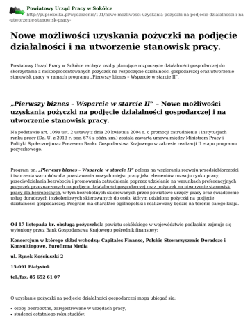 Powiatowy Urząd Pracy w Sokółce http://pupsokolka.pl/wydarzenie/101/nowe-możliwosci-uzyskania-pożyczki-na-podjecie-dzialalnosci-i-na -utworzenie-stanowisk-pracy- Nowe możliwości uzyskania pożyczki na podjęcie działalności i na utworzenie stanowisk pracy. Powiatowy Urząd Pracy w Sokółce zachęca osoby planujące rozpoczęcie działalności gospodarczej do skorzystania z niskooprocentowanych pożyczek na rozpoczęcie działalności gospodarczej oraz utworzenie stanowisk pracy w ramach programu „Pierwszy biznes – Wsparcie w starcie II”. „Pierwszy biznes – Wsparcie w starcie II” – Nowe możliwości uzyskania pożyczki na podjęcie działalności gospodarczej i na utworzenie stanowisk pracy. Na podstawie art. 109e ust. 2 ustawy z dnia 20 kwietnia 2004 r. o promocji zatrudnienia i instytucjach rynku pracy (Dz. U. z 2013 r. poz. 674 z późn. zm.) została zawarta umowa między Ministrem Pracy i Polityki Społecznej oraz Prezesem Banku Gospodarstwa Krajowego w zakresie realizacji II etapu programu pożyczkowego. Program pn. „Pierwszy biznes – Wsparcie w starcie II” polega na wspieraniu rozwoju przedsiębiorczości i tworzenia warunków dla powstawania nowych miejsc pracy jako elementów rozwoju rynku pracy, przeciwdziałania bezrobociu i promowania zatrudnienia poprzez udzielanie na warunkach preferencyjnych pożyczek przeznaczonych na podjęcie działalności gospodarczej oraz pożyczek na utworzenie stanowisk pracy dla bezrobotnych, w tym bezrobotnych skierowanych przez powiatowe urzędy pracy oraz świadczenie usług doradczych i szkoleniowych skierowanych do osób, którym udzielono pożyczki na podjęcie działalności gospodarczej. Program ma charakter ogólnopolski i realizowany będzie na terenie całego kraju. Od 17 listopada br. obsługą pożyczekdla powiatu sokólskiego w województwie podlaskim zajmuje się wyłoniony przez Bank Gospodarstwa Krajowego pośrednik finansowy: Konsorcjum w którego skład wchodzą: Capitales Finanse, Polskie Stowarzyszenie Doradcze i Konsultingowe, Eurofirma Media ul. Rynek Kościuszki 2 15-091 Białystok tel./fax. 85 652 61 07 O uzyskanie pożyczki na podjęcie działalności gospodarczej mogą ubiegać się: ● ● osoby bezrobotne, zarejestrowane w urzędach pracy, studenci ostatniego roku studiów, ● poszukujący pracy absolwenci szkół i uczelni w okresie 48 miesięcy od dnia ukończenia szkoły lub uzyskania tytułu zawodowego. Pożyczkobiorcy będą mogli otrzymać wsparcie doradcze i szkoleniowe w zakresie m.in. zakładania działalności gospodarczej, form opodatkowania, czy też rozliczeń finansowych. Ww. pośrednicy finansowi udzielać będą również pożyczek dla podmiotów gospodarczych z przeznaczeniem na utworzenie miejsca pracy dla bezrobotnych, w tym bezrobotnych skierowanych przez powiatowe urzędy pracy. Kwota pożyczki na podjęcie działalności gospodarczej wynosi maksymalnie 20-krotną wysokość przeciętnego wynagrodzenia (aktualnie ok. 74 tys. zł). Natomiast pożyczka na utworzenie miejsca pracy maksymalnie 6-krotną wysokość przeciętnego wynagrodzenia (obecnie ok. 22 tys. zł). Podstawową zaletą pożyczki jest jej niskie oprocentowanie (aktualnie – 0,56% w skali roku) oraz długi okres spłaty – do 7 lat z możliwością rocznej karencji w spłacie kapitału. Udzielane wsparcie stanowi pomoc de minimis. Szczegółowe zasady udzielania pożyczek dostępne są na stronach:www.bgk.com.pl/wws; wws.bgk.pl, www.wsparciewstarcie.pl