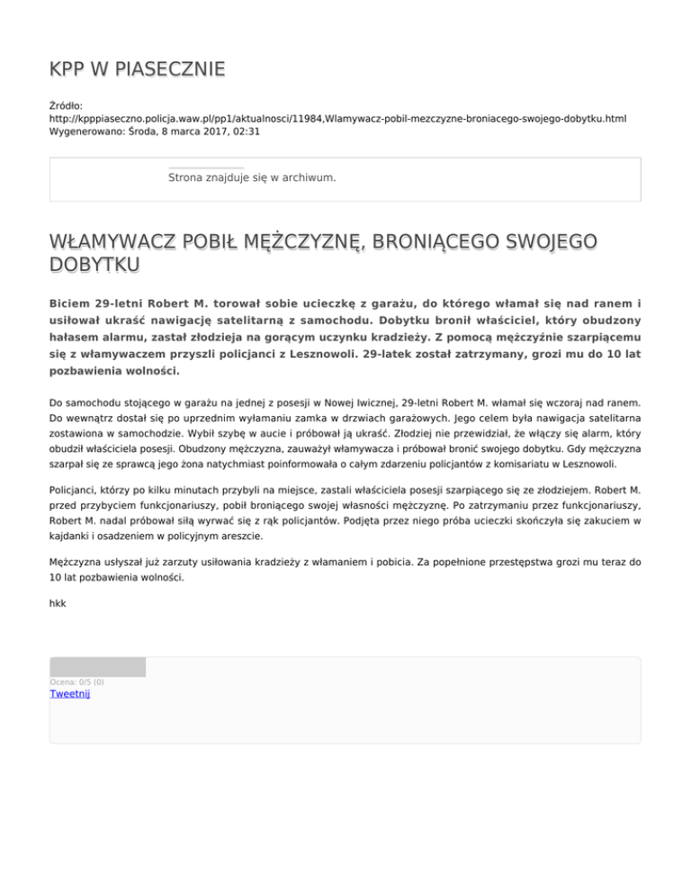 KPP W PIASECZNIE Źródło: http://kpppiaseczno.policja.waw.pl/pp1/aktualnosci/11984,Wlamywacz-pobil-mezczyzne-broniacego-swojego-dobytku.html Wygenerowano: Środa, 8 marca 2017, 02:31 Strona znajduje się w archiwum. WŁAMYWACZ POBIŁ MĘŻCZYZNĘ, BRONIĄCEGO SWOJEGO DOBYTKU Biciem 29-letni Robert M. torował sobie ucieczkę z garażu, do którego włamał się nad ranem i usiłował ukraść nawigację satelitarną z samochodu. Dobytku bronił właściciel, który obudzony hałasem alarmu, zastał złodzieja na gorącym uczynku kradzieży. Z pomocą mężczyźnie szarpiącemu się z włamywaczem przyszli policjanci z Lesznowoli. 29-latek został zatrzymany, grozi mu do 10 lat pozbawienia wolności. Do samochodu stojącego w garażu na jednej z posesji w Nowej Iwicznej, 29-letni Robert M. włamał się wczoraj nad ranem. Do wewnątrz dostał się po uprzednim wyłamaniu zamka w drzwiach garażowych. Jego celem była nawigacja satelitarna zostawiona w samochodzie. Wybił szybę w aucie i próbował ją ukraść. Złodziej nie przewidział, że włączy się alarm, który obudził właściciela posesji. Obudzony mężczyzna, zauważył włamywacza i próbował bronić swojego dobytku. Gdy mężczyzna szarpał się ze sprawcą jego żona natychmiast poinformowała o całym zdarzeniu policjantów z komisariatu w Lesznowoli. Policjanci, którzy po kilku minutach przybyli na miejsce, zastali właściciela posesji szarpiącego się ze złodziejem. Robert M. przed przybyciem funkcjonariuszy, pobił broniącego swojej własności mężczyznę. Po zatrzymaniu przez funkcjonariuszy, Robert M. nadal próbował siłą wyrwać się z rąk policjantów. Podjęta przez niego próba ucieczki skończyła się zakuciem w kajdanki i osadzeniem w policyjnym areszcie. Mężczyzna usłyszał już zarzuty usiłowania kradzieży z włamaniem i pobicia. Za popełnione przestępstwa grozi mu teraz do 10 lat pozbawienia wolności. hkk Ocena: 0/5 (0) Tweetnij