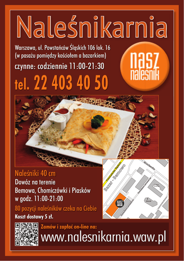 Naleśnikarnia Warszawa, ul. Powstańców Śląskich 106 lok. 16 (w pasażu pomiędzy kościołem a bazarkiem) czynne: codziennie 11:00-21:30 tel. 22 403 40 50 ska aw cł Wro ka ejs en Pir W ro cła ws k a W ro c Pirenej ław sk a Ja ska Wr oc ław sk a na ld's sła wa Le nc ew i cz a Po ws ta ń Do Centrum Medyczne W ro c ław s Zamów i zapłać on-line na: ar k ław aM nis Bro za ięd Ks St an is ław aL en Po ws ta 80 pozycji naleśników czeka na Ciebie Koszt dostawy 5 zł. Kościół ce wi cz ńc ów a iew icz a Ślą sk ich St an i Ba za Klinika Weterynaryjna at on a ław sk Mc r- Dowóz na terenie Bemowa, Chomiczówki i Piasków w godz. 11:00-21:00 Bl Wr oc Be ców Ślą m skic ow h o a Pir en ejs k Naleśniki 40 cm na a Cz er wo ny ch M ak ów www.nalesnikarnia.waw.pl cena w zł cena w zł 1. Gotowane warzywa, ser żółty ......................................................15 / 10 2. Oscypek pomidor, ser żółty...........................................................15 / 10 3. Oscypek, szpinak z serem feta, pomidor, ser żółty .....................17 / 11 4. Oscypek, żurawina, ser żółty ........................................................16 / 10 5. Szynka, ser żółty ...........................................................................15 / 10 6. Szynka, pomidor, ser żółty ...........................................................16 / 10 7. Szynka, oliwki, ser żółty ...............................................................16 / 10 8. Szynka, ananas, ser żółty .............................................................16 / 10 9. Szynka w sosie meksykańskim, ser żółty.....................................17 / 11 10. Bekon, pomidor, oliwki, ser rokpol, ser żółty..............................17 / 11 11. Salami, oliwki, papryka chilli, ser żółty .......................................17 / 11 12. Salami, oliwki, ser żółty ...............................................................16 / 10 13. Salami, gotowane warzywa, ser żółty .........................................16 / 10 14. Pieczarki duszone z cebulką, ser żółty.........................................15 / 10 15. Pieczarki duszone z cebulką, bekon, ser żółty ............................16 / 10 16. Pieczarki duszone z cebulką, pomidor, ser rokpol, ser żółty......17 / 11 17. Pieczarki duszone z cebulką, szynka, ser żółty ...........................16 / 10 18. Pieczarki duszone z cebulką, salami, ser żółty ...........................16 / 10 19. Tuńczyk w śmietanie, pomidor, szczypiorek, ser żółty ................16 / 10 20. Tuńczyk w śmietanie, pomidor, kukurydza, szczypiorek, ser żółty..........17 / 11 21. Łosoś w śmietanie, bazylia, ser żółty ...........................................17 / 11 22. Szpinak z serem feta, oliwki, ser żółty ........................................16 / 10 23. Szpinak z serem feta, pieczarki duszone z cebulką, ser żółty....17 / 11 24. Szpinak z serem feta, orzechy włoskie, ser żółty ........................17 / 11 25. Szpinak z serem feta, warzywa gotowane, ser żółty .................17 / 11 26. Szpinak z serem feta, szynka, ser żółty .......................................17 / 11 27. Szpinak z serem feta, bekon, ser żółty ........................................17 / 11 28. Szpinak z serem feta, zielony groszek, ser żółty ........................17 / 11 29. Szpinak z serem feta, ser rokpol, ser żółty .................................17 / 11 30. Szpinak z serem feta, ser rokpol, orzechy włoskie, ser żółty.........18 / 11 31. Ser rokpol, żurawina, ser żółty ....................................................16 / 10 32. Ser rokpol, orzechy włoskie, ser żółty..........................................17 / 11 33. Ser camembert, ser feta, ser rokpol, ser żółty.............................18 / 11 34. Ser camembert, ser rokpol, orzechy włoskie, ser żółty...............18 / 11 35. Grillowany kurczak, pomidor, oliwki, ser żółty ...........................17 / 11 36. Grillowany kurczak, pomidor, oliwki, ser rokpol, ser żółty ........19 / 12 37. Grillowany kurczak, kapusta z grzybami, ser żółty ....................19 / 12 38. Grillowany kurczak, ananas, kukurydza, ser żółty .....................19 / 12 39. Grillowany kurczak, pomidor, bekon, ser żółty...........................19 / 12 40. Grillowany kurczak, pomidor, pieczarki duszone z cebulką, ser ......19 / 12 41. Grillowany kurczak, pomidor, warzywa gotowane, ser żółty.....19 / 12 42. Grillowany kurczak, pomidor, szpinak z serem feta, ser żółty ......19 / 12 43. Grillowany kurczak z ananasem w sosie curry, ser żółty ............19 / 12 44. Indyk w sosie bolognese, ser żółty ...............................................19 / 12 45. Indyk w sosie bolognese, ser rokpol, ser żółty ............................20 / 12 46. Indyk w sosie meksykańskim, ser żółty .......................................19 / 12 47. Mięso karkowe w sosie meksykańskim, ser żółty........................19 / 12 48. Z cukrem pudrem . .................................................................6 / 5 49. Z dżemem truskawkowym ....................................................10 / 7 50. Z powidłami śliwkowymi i cukrem pudrem ..........................10 / 7 51. Z brzoskwiniami ...................................................................13 / 9 52. Z truskawkami ......................................................................13 / 9 53. Z ananasem ..........................................................................13 / 9 54. Z jagodami ...........................................................................13 / 9 55. Z jabłkiem prażonym, cynamonem ......................................13 / 9 56. Z owocami mix ....................................................................15 / 10 57. Z bananem, orzechami włoskimi, rodzynkami ...................15 / 10 58. Z owocami mix i lodami.......