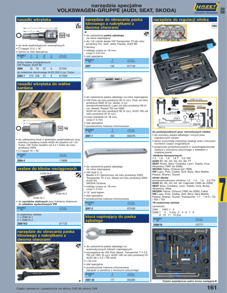 narzędzia specjalne VOLKSWAGEN-GRUPPE (AUDI, SEAT, SKODA) nasadki wkrętaka F narzędzie do obracania paska klinowego z nakrętkami z dwoma otworami Genialne Narzędzia 2540 2588 narzędzie do regulacji silnika b G C • do ustawienia paska zębatego na rolce napinającej • do 1,6 l silniki diesla VW Transporter T3 (do roku produkcji 91), Golf, Jetta, Passat, AUDI 80 • łamany • odstęp czopa co 18 mm, czop-? 2,9 mm • stal specjalna • do śrub sześciokątnych wewnętrznych • j napęd 12,5 = 1⁄2” • ostrza ze stali specjalnej 1 M N F S 4 śruby wałów przegubowych VW Passat, AUDI 80 2584 32 70 23 6 017041 1 K 4 2587 140 017140 do kolektora dolotowego AUDI 200 5 cyl. Turbo 2584-1 210 248 23 6 017058 nasadki wkrętaka do wałów kardana • do ustawienia paska zębatego na rolce napinającej • VW Polo od roku produkcji 95 (4 cyl.), Polo od roku produkcji 2002 (3 cyl. diesel, 4 cyl. pompowtryskiwacz), Lupo od roku produkcji 99 (3 cyl. diesel), Passat TDi od 1998 AUDI A4 od roku produkcji 95 (4 cyl.), AUDI 100 od roku produkcji 91 (5 cyl.) • czop-odstępie co 18 mm, czop-? 3 mm • stal specjalna • powierzchnia matowa chromowana 1 K 4 2587-1 250 053476 • do odkręcenia śrub o gnieździe sześciokątnym przy kołnierzu kardana marek AUDI A4 Quattro od 1,8 l Turbo i A6 Turbo Quattro od 2,4 l Turbo do roku produkcji 2004 • j napęd 10 = 3⁄8” 1 4 2584-4 115808 zestaw do klinów naciągowych E • do zacisków stalowych przy kołnierzu stalowym do układów wydechowych VW 1 4 3-częściowy zestaw: 1 x 2586 N-1 2 x 2586 N-2 2586 N/3 • do ustawienia paska zębatego na rolce napinającej • VW Golf 3, 4, Beetle 2,0 l benzynowy od roku produkcji 2003, Transporter T5 4 cyl. diesel od roku produkcji 2004 AUDI A3, SKODA Octavia, • odstęp czopa co 18 mm, czop ? 3 mm • 15° pod kątem • stal specjalna • powierzchnia matowa chromowana 1 4 2587-2 072439 klucz napinający do paska zębatego 017133 do profesjonalnych prac remontowych silnika • do wymiany paska zębatego i innych prac naprawczych silnika • łatwo zrozumiała instrukcja obsługi wraz z kluczem numerów części oryginalnych • przejrzyste przechowywanie w wysokogatunkowej walizce z tworzywa sztucznego z wkładem z miękkiej pianki silników benzynowych: 1,4 1,6 1,8 1,8 T 2,0 16V AUDI 80, A2, A3, S3, A4, A6, TT SEAT Arosa, Ibiza, Cordoba, Leon, Toledo, Inca, Alhambra (1997 do 2006) SKODA Fabia, Octavia (od 1996) VW Lupo, Polo, Caddy, Golf, Bora, New Beetle, Passat, Sharan, Touran silniki diesla: pompowtryskiwacz silników 1,2 1,4 1,9 2,0 TDi AUDI 80, A2, A3, A4, A6, Cabriolet (1995 do 2000) SEAT Ibiza, Cordoba, Leon, Toledo, Inca, Arosa, Alhambra, Altea SKODA Felicia, Octavia (1993 do 2005), Fabia VW Lupo, Polo, Caddy, Golf, Bora, New Beetle, Passat, Sharan, Touran, Transporter, 1,7 1,9 D / TD / SDi / TDi 19-częściowy zestaw zawartość: 2587 2587-1 2 2588-1 2 3 (2x) 4 5 6 7 8 9 10 11 12 (2x) 1 4 2588/19 127771 narzędzie do obracania paska klinowego z nakrętkami z dwoma otworami G B • do ustawienia paska zębatego na automatycznych rolkach napinających • szczególnie do VW Polo diesel, Transporter T 4 2,5 TDi od 1991 (5 cyl.), AUDI 100 od roku produkcji 91 AUDI A6 z 2,5 l TDi silnik • Ä 32 mm • stal specjalna • powierzchnia matowa chromowana rękojeść w powłoce z tworzywa sztucznego 1 K 4 2587-32 177 053285 Części zamienne i pojedyncze od strony 240 do strony 249 Części pojedyncze patrz srona następna B 161 7 Genialne Narzędzia narzędzia specjalne VOLKSWAGEN-GRUPPE (AUDI, SEAT, SKODA) narzędzie do regulacji silnika 1 narzędzie do regulacji silnika b& C 4 4 2588/3 087761 blokada wału korbowego do blokowania wału korbowego 2588-1 087730 płytki blokujące do blokowania rolki napinającej 2588-2 087747 kołek do blokowania koła napędu wałka rozrządu 4 2588-3 2588/9 144181 blokowanie wałka rozrządu 2588-17 087754 144198 144204 144211 144228 blokady rolek napinających 137114 2588-18 trzpień ustalający 2588-7 1 śruby rolek napinających 137107 blokada wałka rozrządu 2588-6 C 1 2588-14 2588-15 2588-16 145539 zestaw narzędzi do wymiany paska zębatego 3-częściowy zestaw: 2588-1 2 3 trzpień ustalający blokada wałka rozrządu 2588-5 b& zawartość: 2588-14 15 (2x) 16 17 18 19 110 3688-10 zestaw do ustawiania rozrządu do profesjonalnej obsługi silnika w sam. VW 19 części, zawartość zobacz 2588/19 we wkładce z miękkiej pianki (2/3), pasuje do wszystkich wózków warsztatowych z szufladami 163-89/19 C 9-częściowe uzupełnienie – zestawu 2588/19 z wkładem z miękkiej pianki (możliwe przechowywanie w walizce 2588/19) silniki benzynowe: 1,2 6V i 12V 3 cylindry silnik, VW Polo i Fox, SKODA Fabia, SEAT Ibiza / Cordoba 1,4 - 1,6 FSI silników: AUDI A3, SKODA Octavia, VW Polo, Golf, Touran, Caddy silniki diesla: 4 cylindry pompowtryskiwacz silników diesla od roku produkcji â05 VW i samochodów koncernu 144334 narzędzie do mocowania 136896 2588-19 144341 przyrząd napinający trzpień 2588-8 137121 przyrząd ustalający 2588-9 137565 trzpień ustalający 2588-10 136902 podtrzymywacz 2588-11 prowadnica 2588-12 blok wału korbowego do blokowania owalnego kółka napędu pasa zębatego przy wymianie paska zębatego lub przy naprawie silnika 137589 prowadnica 2588-13 137596 do tarnsportu 7 • do blokowania koła napędu wałka rozrządu przy wymianie paska zębatego • naprawa silnika silników czterozaworowych, czterocylindrowych z wtryskiem VW Lupo od roku produkcji 1999, Polo od roku produkcji 1995, Caddy od roku produkcji 1996 Polo Classic, Variant od roku produkcji 1996, New Beetle 1,4 l od roku produkcji 1999 Golf 1,4 l, 1,6 l od roku produkcji 1998, Bora 1,4 l, 1,6 l od roku produkcji 1999 SKODA Fabia i Octavia AUDI A2 • stal specjalna 137572 2588-110 b& 143283 przyrząd do mierzenia OT 3688-10 137527 zestaw narzędzi do wymiany paska zębatego podczas pracy 1 4 2588-4 110391 narzędzie do permanentnego napinacza b B 162 • do wymiany paska zę