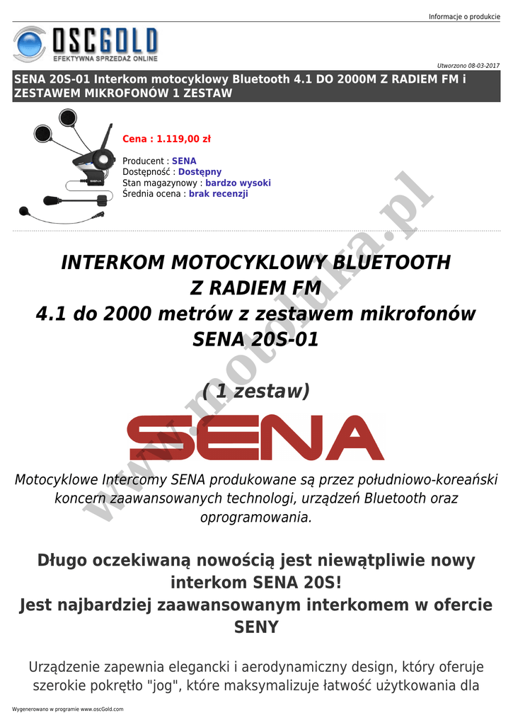 Informacje o produkcie Utworzono 08-03-2017 SENA 20S-01 Interkom motocyklowy Bluetooth 4.1 DO 2000M Z RADIEM FM i ZESTAWEM MIKROFONÓW 1 ZESTAW Producent : SENA Dostępność : Dostępny Stan magazynowy : bardzo wysoki Średnia ocena : brak recenzji a. pl Cena : 1.119,00 zł ot ol uk INTERKOM MOTOCYKLOWY BLUETOOTH Z RADIEM FM 4.1 do 2000 metrów z zestawem mikrofonów SENA 20S-01 w w .m ( 1 zestaw) w Motocyklowe Intercomy SENA produkowane są przez południowo-koreański koncern zaawansowanych technologi, urządzeń Bluetooth oraz oprogramowania. Długo oczekiwaną nowością jest niewątpliwie nowy interkom SENA 20S! Jest najbardziej zaawansowanym interkomem w ofercie SENY Urządzenie zapewnia elegancki i aerodynamiczny design, który oferuje szerokie pokrętło "jog", które maksymalizuje łatwość użytkowania dla Wygenerowano w programie www.oscGold.com ol uk a. pl kierowców. W modelu 20S znajduje się kilka nowatorskich rozwiązań w branży motocyklowej komunikacji rynku słuchawek Bluetooth. Pierwszą z nich jest wprowadzenie technologii Bluetooth 4.0 z dwoma modułami komunikacji Bluetooth, aby utworzyć jednen z najbardziej zaawansowanych zestawów słuchawkowych Bluetooth na rynku. Nowa technologia Bluetooth zwiększa wydajność i niezawodność słuchawek jednocześnie pozwala na zwiększenie jakości dźwięku wysokiej rozdzielczości. Wielozadaniowość Advanced Audio pozwala na płynne połączenie przychodzącego i wychodzącego audio do tworzenia lepszego zmiksowanego audio w porównaniu do tradycyjnej przerwy w oparciu dźwięku technologii innych urządzeń Bluetooth. w w .m ot Z modelem 20S, użytkownik może zadzwonić i korzystać jak z zestawu głośnomówiącego Bluetooth ze swoich telefonów komórkowych, słuchać muzyki stereo lub przekazywać instrukcje głosowe nawigacji GPS przez Bluetooth bezprzewodowo, a także prowadzić rozmowy przez interkom w trybie pełnego dupleksu z pasażerem lub innymi motocyklistami, zawodnikami. w Najważniejsze cechy zestawu 20S-01 to: - Bluetooth 4.0 - zasięg do 2 km! - radio z RDS - do 13 godzin rozmów, 10 dni czuwania - wymienne mikrofony na kablu i pałąku - innowacyjny, prosty i szybki sposób parowania - możliwość tworzenia konferencji z 8 interkomami! - możliwość parowania z interkomami innych producentów - sterowanie za pomocą smartphone'a dzięki specjalnej aplikacji - darmowa aktualizacja oprogramowania w w w .m ot ol uk a. pl Informacje o produkcie Wygenerowano w programie www.oscGold.com