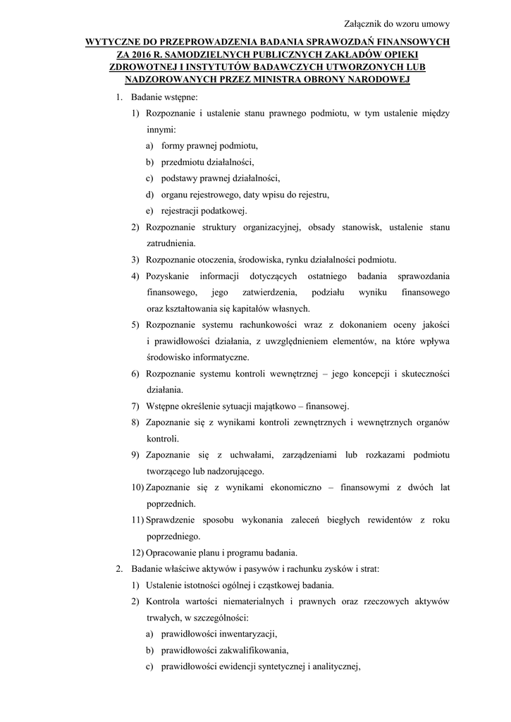 Załącznik do wzoru umowy WYTYCZNE DO PRZEPROWADZENIA BADANIA SPRAWOZDAŃ FINANSOWYCH ZA 2016 R. SAMODZIELNYCH PUBLICZNYCH ZAKŁADÓW OPIEKI ZDROWOTNEJ I INSTYTUTÓW BADAWCZYCH UTWORZONYCH LUB NADZOROWANYCH PRZEZ MINISTRA OBRONY NARODOWEJ 1. Badanie wstępne: 1) Rozpoznanie i ustalenie stanu prawnego podmiotu, w tym ustalenie między innymi: a) formy prawnej podmiotu, b) przedmiotu działalności, c) podstawy prawnej działalności, d) organu rejestrowego, daty wpisu do rejestru, e) rejestracji podatkowej. 2) Rozpoznanie struktury organizacyjnej, obsady stanowisk, ustalenie stanu zatrudnienia. 3) Rozpoznanie otoczenia, środowiska, rynku działalności podmiotu. 4) Pozyskanie informacji finansowego, jego dotyczących ostatniego badania sprawozdania zatwierdzenia, podziału wyniku finansowego oraz kształtowania się kapitałów własnych. 5) Rozpoznanie systemu rachunkowości wraz z dokonaniem oceny jakości i prawidłowości działania, z uwzględnieniem elementów, na które wpływa środowisko informatyczne. 6) Rozpoznanie systemu kontroli wewnętrznej – jego koncepcji i skuteczności działania. 7) Wstępne określenie sytuacji majątkowo – finansowej. 8) Zapoznanie się z wynikami kontroli zewnętrznych i wewnętrznych organów kontroli. 9) Zapoznanie się z uchwałami, zarządzeniami lub rozkazami podmiotu tworzącego lub nadzorującego. 10) Zapoznanie się z wynikami ekonomiczno – finansowymi z dwóch lat poprzednich. 11) Sprawdzenie sposobu wykonania zaleceń biegłych rewidentów z roku poprzedniego. 12) Opracowanie planu i programu badania. 2. Badanie właściwe aktywów i pasywów i rachunku zysków i strat: 1) Ustalenie istotności ogólnej i cząstkowej badania. 2) Kontrola wartości niematerialnych i prawnych oraz rzeczowych aktywów trwałych, w szczególności: a) prawidłowości inwentaryzacji, b) prawidłowości zakwalifikowania, c) prawidłowości ewidencji syntetycznej i analitycznej, d) udokumentowania zmian w stanie, tj. przychodów, zmniejszeń, przecen itp. (dowodów OT, PT i innych), e) prawidłowości stosowania stawek amortyzacji bilansowej i podatkowej, f) budowy środków trwałych, ich finasowania i rozliczania, g) zaliczki na budowę środków trwałych, h) stanu maszyn i urządzeń związanych z budową środków trwałych, i) prawidłowości wyceny w ciągu roku i na dzień bilansowy. 3) Kontrola inwestycji długoterminowych i krótkoterminowych, w tym w szczególności: a) prawidłowości inwentaryzacji, b) prawidłowości zakwalifikowania do inwestycji nieruchomości oraz wartości niematerialnych i prawnych, c) prawidłowości ewidencji, d) prawidłowości wyceny w ciągu roku i na dzień bilansowy, e) aktualizacji wyceny nieruchomości i aktywów finansowych. 4) Kontrola zapasów (materiałów, półproduktów i produktów w toku, produktów gotowych, towarów), w tym w szczególności: a) prawidłowości spisu z natury, b) prawidłowości ewidencji syntetycznej i analitycznej, c) wyceny w ciągu roku i nadzień bilansowy, d) metody rozchodu, e) rozliczenia zakupu z dostawcami, f) kontroli rozchodu materiałów do zużycia i produktów do sprzedaży, g) dostawy niefakturowane w drodze. 5) Kontrola należności, zobowiązań długoterminowych i krótkoterminowych, w tym w szczególności: a) prawidłowości inwentaryzacji metodą potwierdzenia sald i metodą weryfikacji sald, b) prawidłowości prowadzonej ewidencji, c) oceny realności sald i stopnia egzekwowalności, d) zgodności sald rozrachunków publiczno – prawnych z deklaracjami, e) terminowości płatności należności i zobowiązań, naliczanie odsetek z tytułu nieterminowo regulowanych należności i zobowiązań, f) wyceny należności i zobowiązań w ciągu roku i na dzień bilansowy, g) poprawności rozliczeń z tytułu wynagrodzeń oraz świadczeń ZUS, h) odpisów aktualizujących wartości należności, i) zobowiązań warunkowych, j) zobowiązań zabezpieczonych na majątku podmiotu, k) kontroli rezerw na zobowiązania. 2 6) Kontrola środków pieniężnych i innych aktywów pieniężnych, w tym w szczególności: a) prawidłowości inwentaryzacji, b) prawidłowości ewidencji, udokumentowanie obrotu pieniężnego i kredytów, c) wyceny w ciągu roku i na dzień bilansowy, d) dyscypliny finansowej. 7) Kontrola kosztów działalności, strat nadzwyczajnych, w tym w szczególności: a) prawidłowości ewidencji kosztów w zespołach 4 – tym i 5 – tym, b) udokumentowania wydatków, kontrola wydatków, c) rozliczeń i kalkulacji kosztów w zakresie wyrobów gotowych i usług, d) rozliczeń międzyokresowych kosztów (czynne i bierne), e) pozostałych koszty operacyjnych i kosztów finansowych, f) strat nadzwyczajnych. 8) Kontrola przychodów, zysków nadzwyczajnych, w tym w szczególności: a) udokumentowanie sprzedaży produktów, usług, i pozostałych składników majątku, b) korekta sprzedaży, c) pozostałych przychody operacyjne, przychodów finansowych, zysków nadzwyczajnych, d) ustalenie wyniku finansowego brutto, e) podatku dochodowego, f) zysku netto (straty netto). 9) Kontrola kapitałów (funduszy) własnych, w tym w szczególności: a) kapitału podstawowego (funduszu założycielskiego), b) kapitału zapasowego (funduszu zakładu), c) kapitału (funduszu) z aktualizacji wyceny, d) podziału zysku/pokrycia straty z lat ubiegłych. 10) Kontrola rachunku przepływów pieniężnych oraz zestawienia zmian w kapitale (funduszu) własnym. 11) Sprawdzenie poprawności sporządzania dodatkowych informacji i objaśnień (w szczegółowości nie mniejszej, niż wynikająca z zapisów ustawy o rachunkowości). 12) Ocena aktywów i pasywów oraz ocena sytuacji finansowej, a w tym: a) ocena zmian aktywów i pasywów, b) ocena wyników finansowych, c) ocena wskaźników (w tym w szczególności: ocena wskaźników rentowności, płynności finansowej, wskaźników rotacji, wskaźników 3 do analizy poziomej i pionowej bilansu, wskaźników przepływów finansowych), d) oc